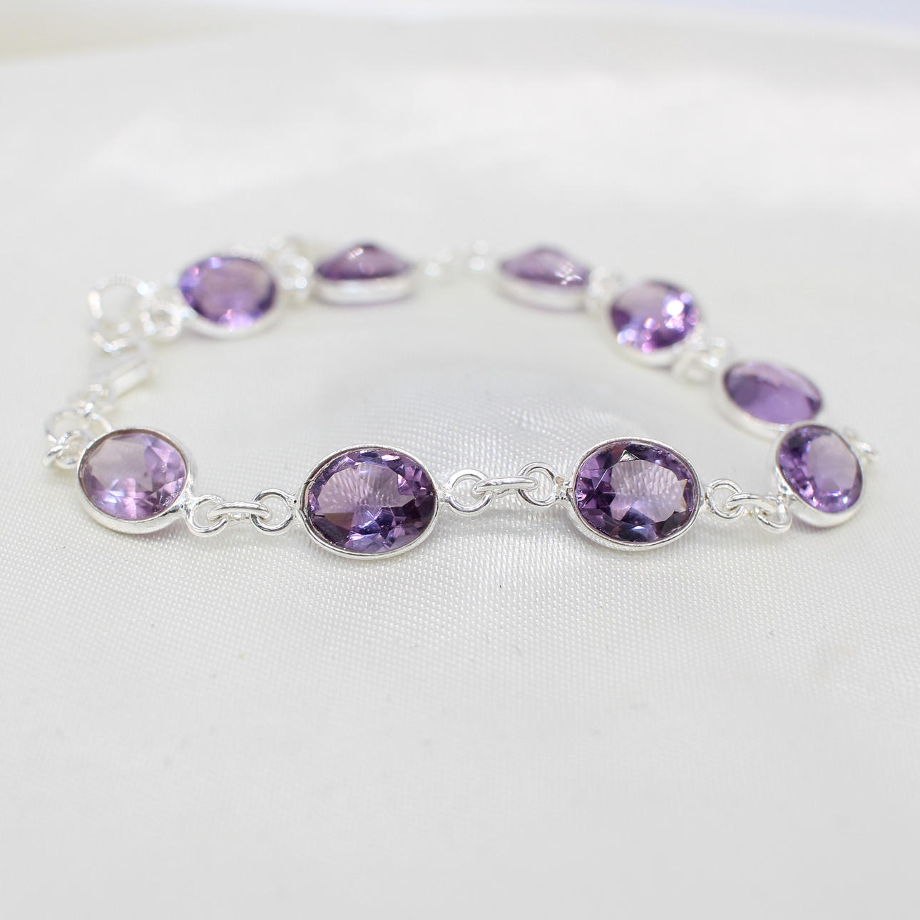 A silver (stamped 925) line bracelet set with 9 x oval cut amethysts.