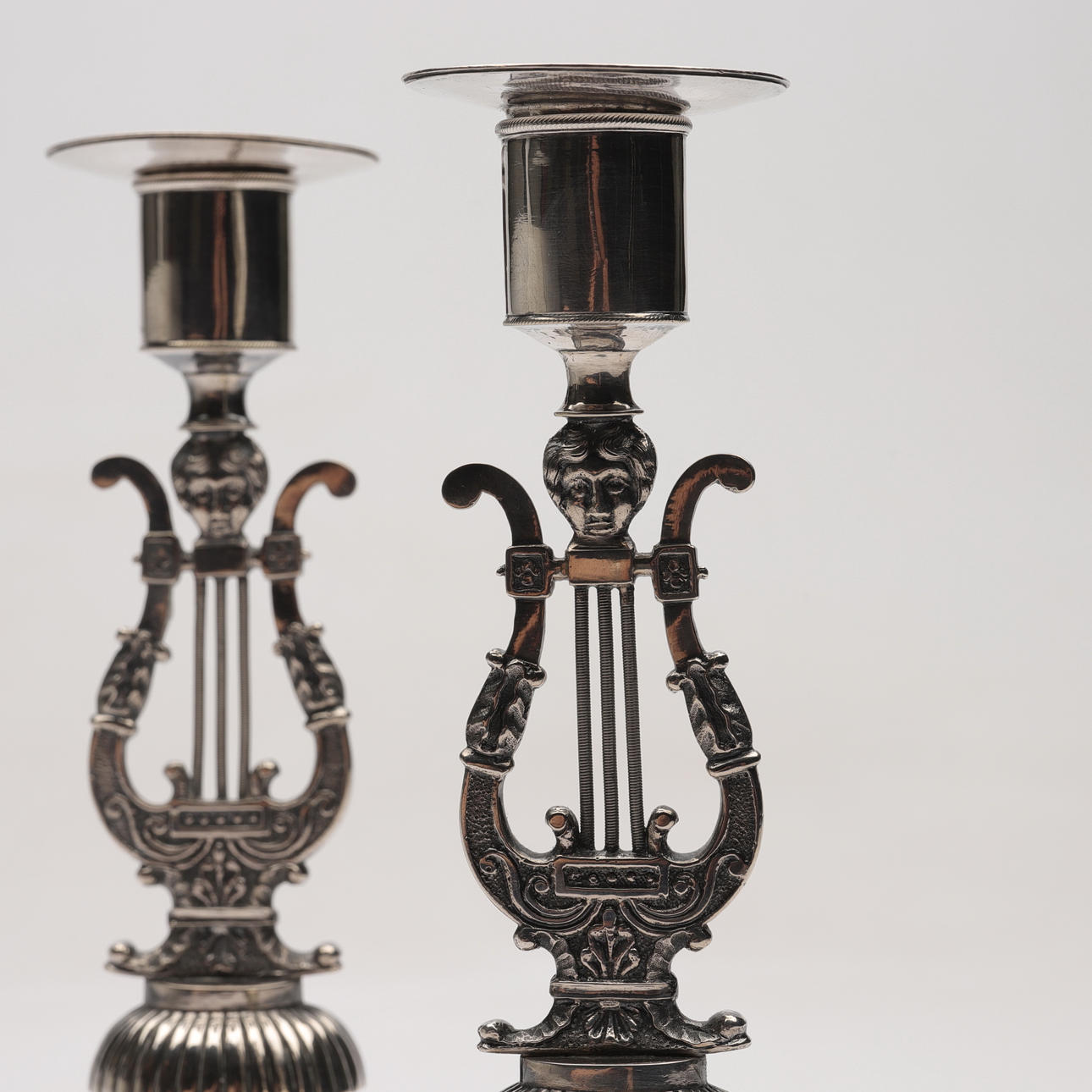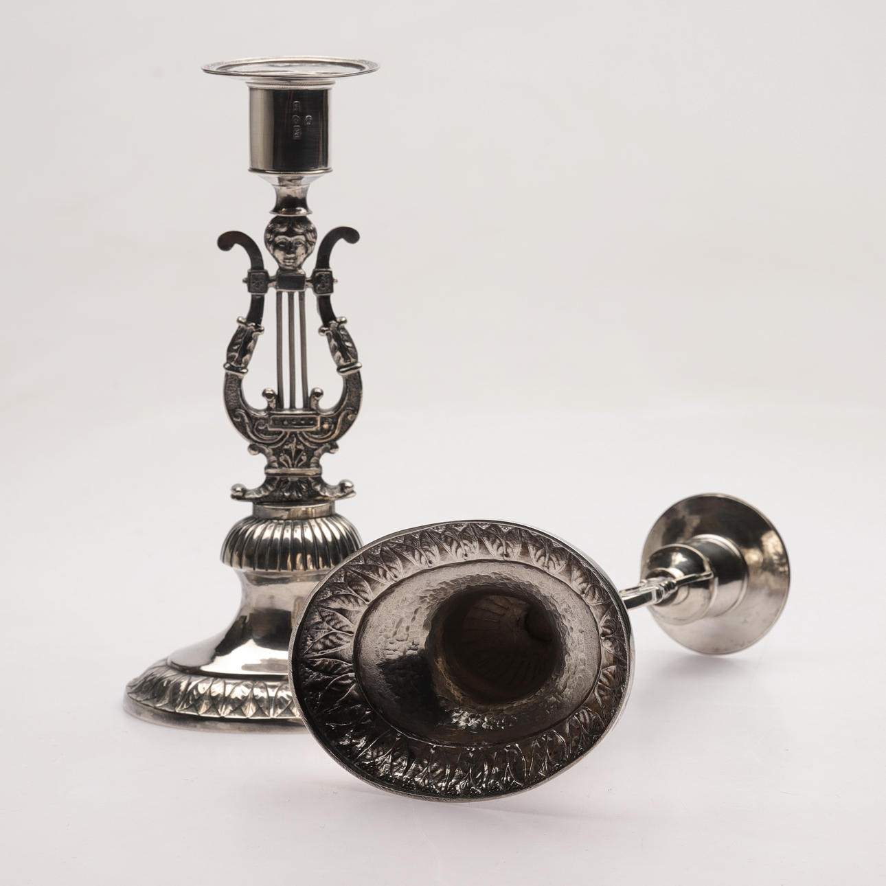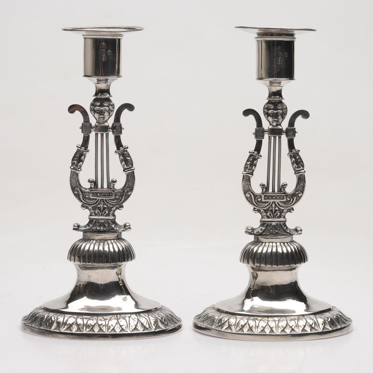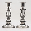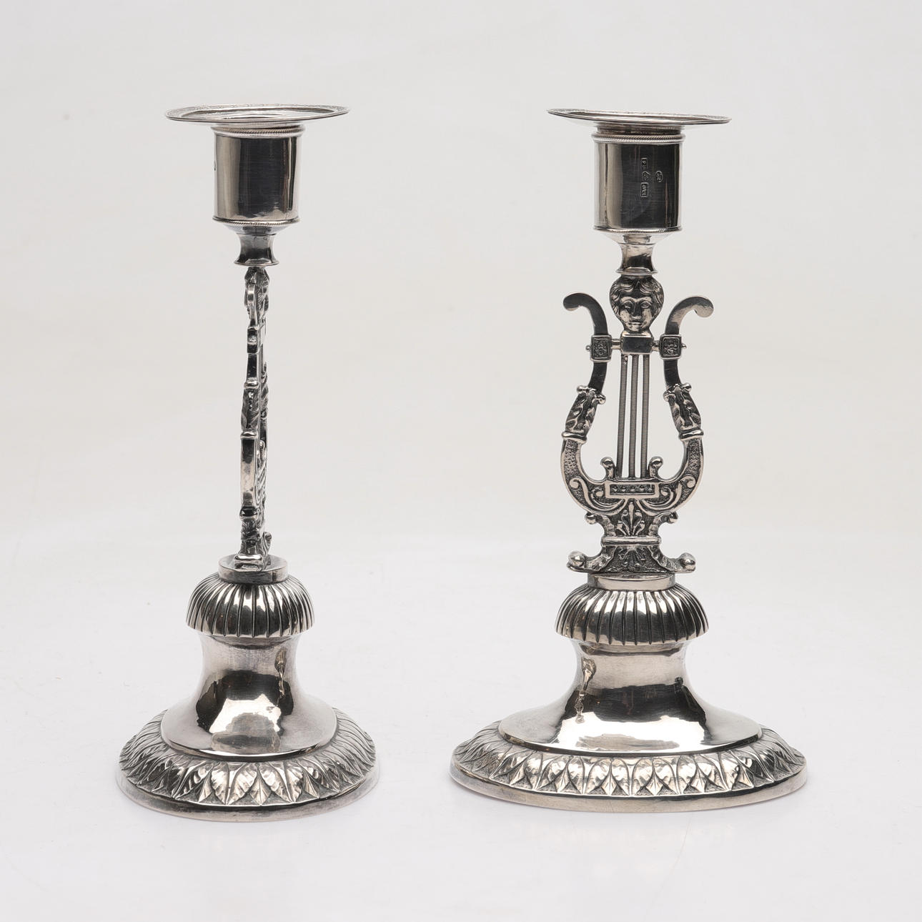 4928137. Two silver candlesticks, probably Johan Wixner, from Söderhamn, Empire,, so called lyrstacks, 1837.