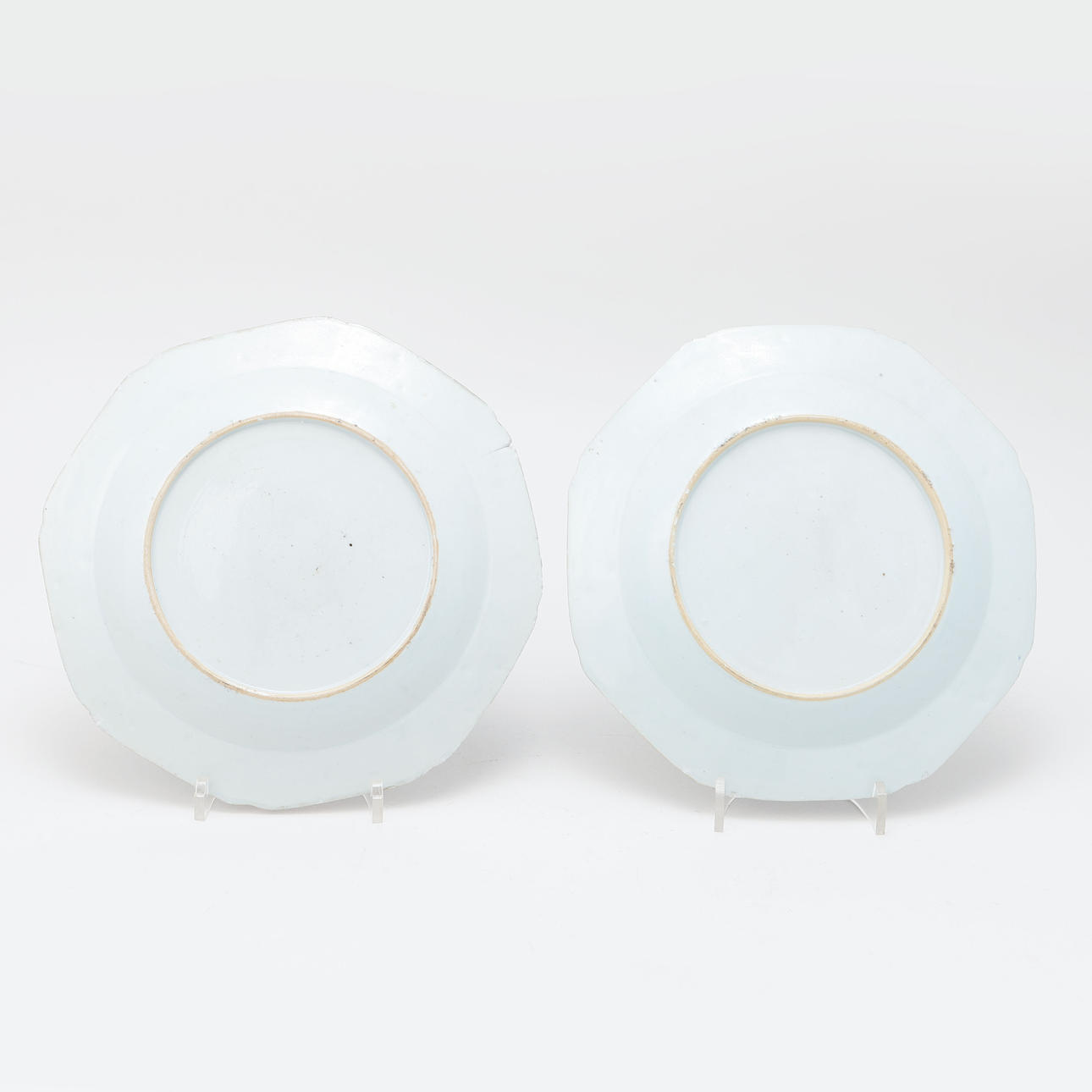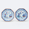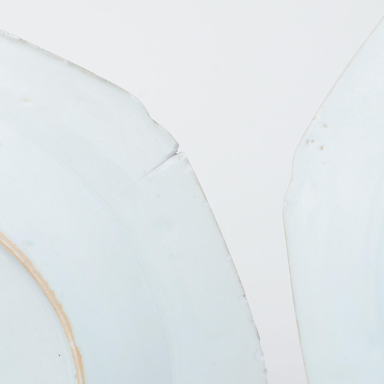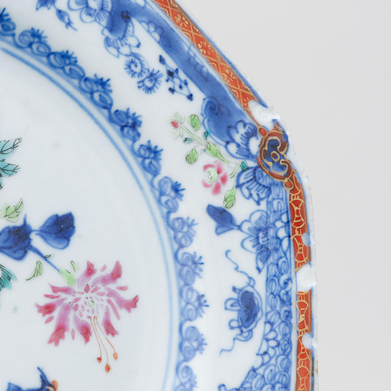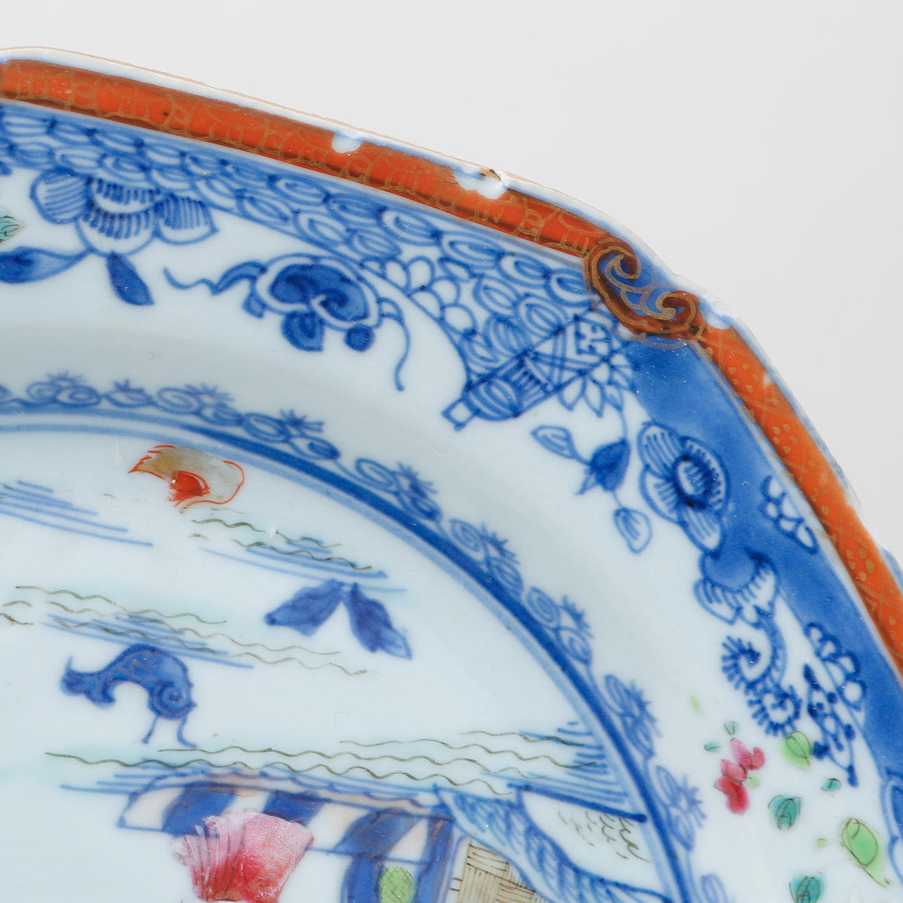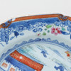 Decor in underglaze blue and enamel colors of building and woman in boat. Diameter about 23 cm.