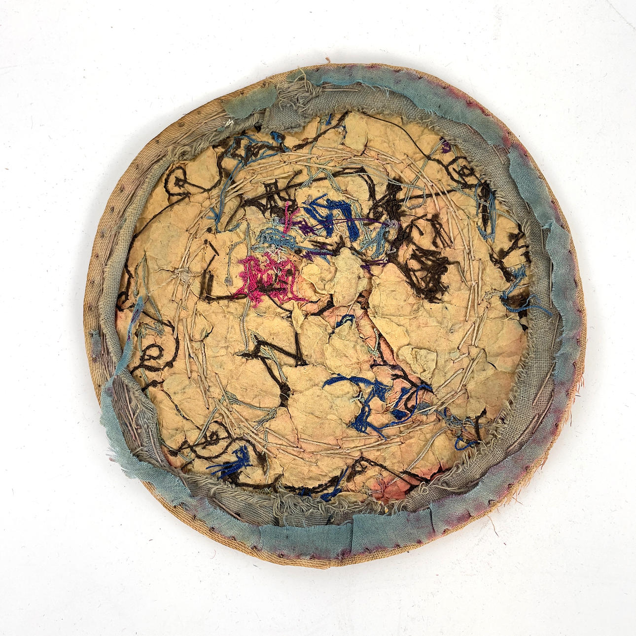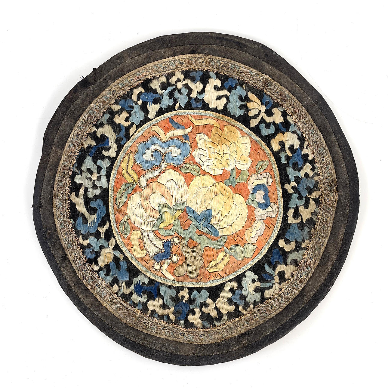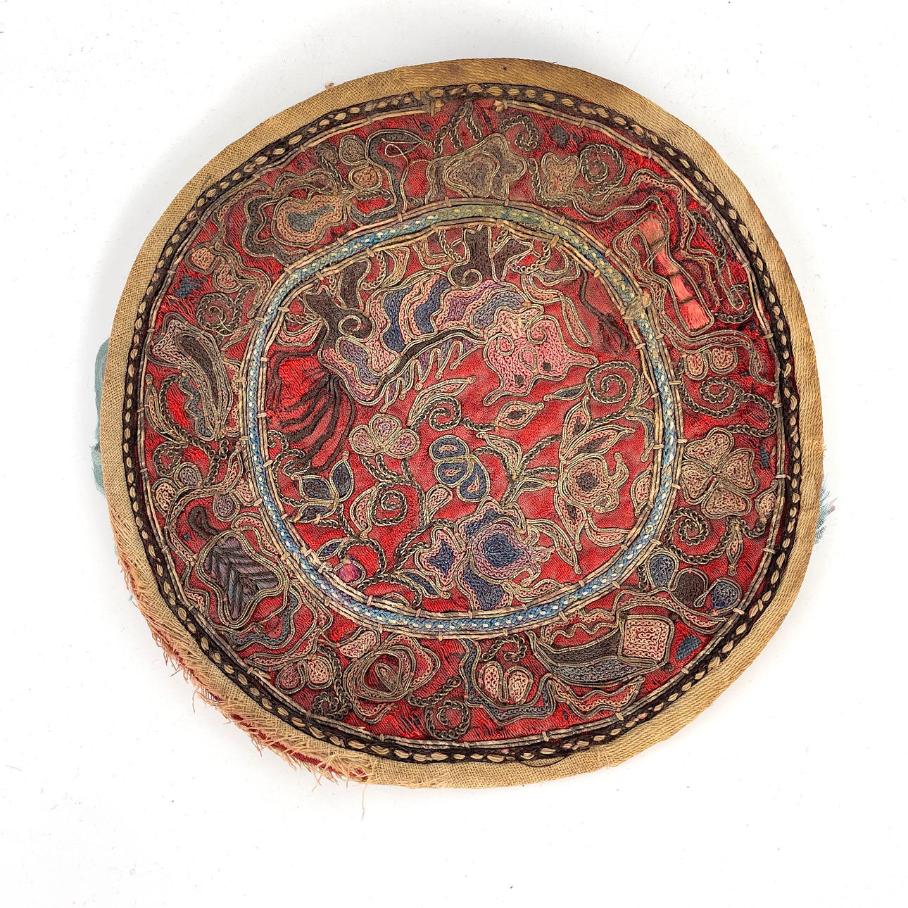 Wear and age, damage, loose threads, stains, mainly on embroidery with fohund.