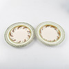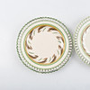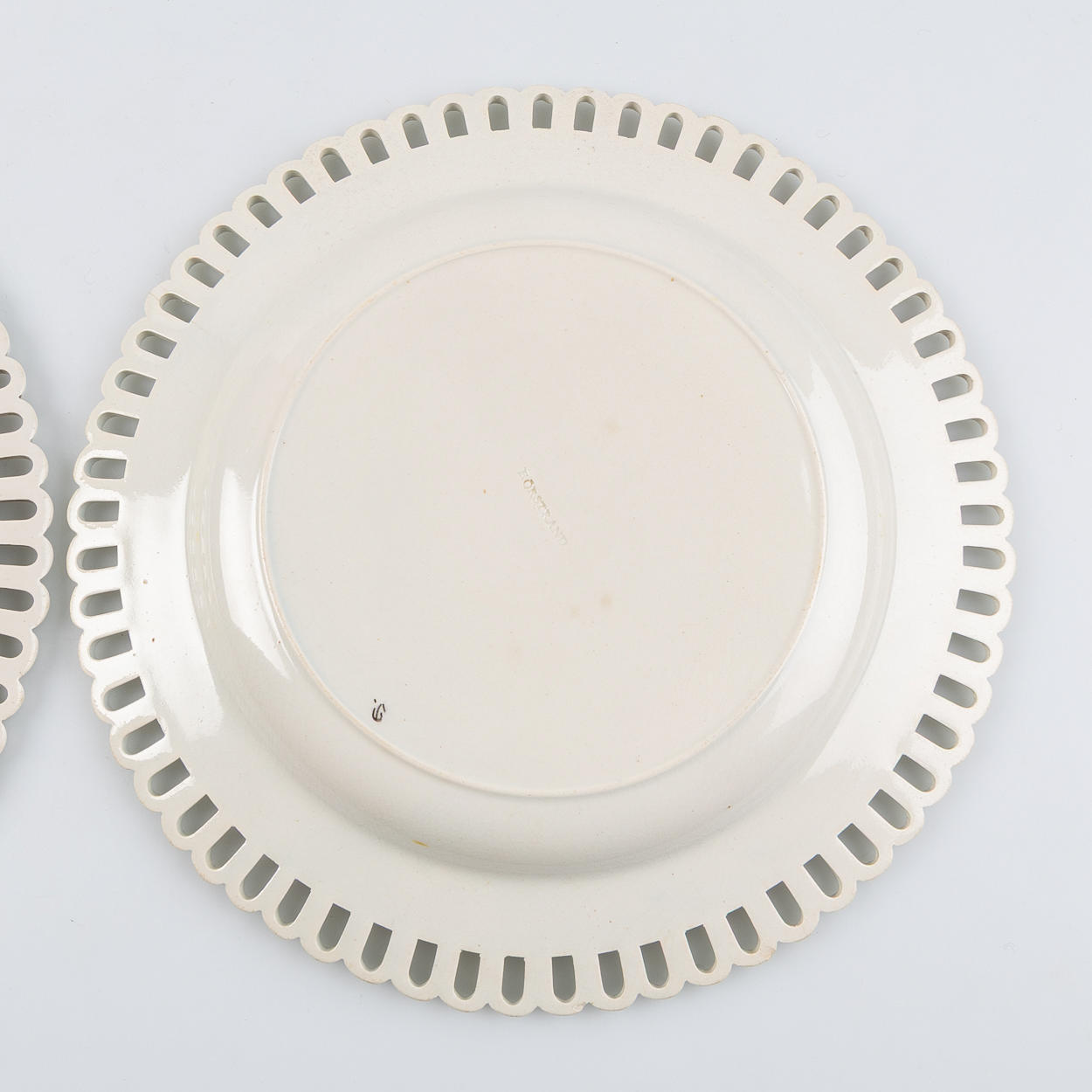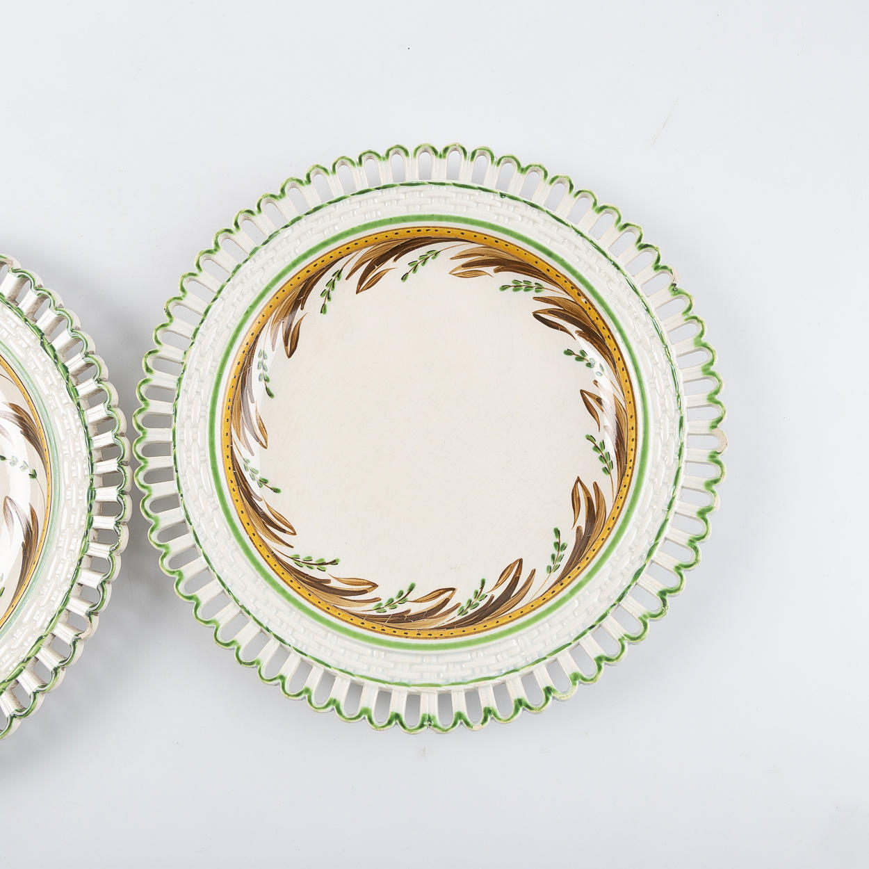 Openwork decor, basket patterned border, decor in brown, green and mustard gold. Diameter about 21.5 cm.