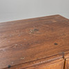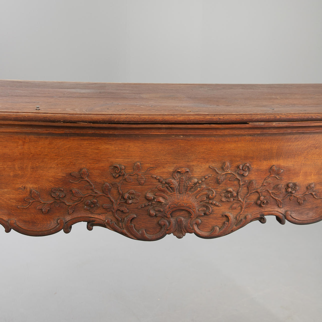 Wide, contrasting baseboards. Narrow-sided cushions in the recessed fillings. Round bar frame panels on the front. Sliced mussels with an outgoing, voluted, vegetable hanging. The curved frame is cut out and decorated with flower branches starting from a musche. Cabled cornice. Ca. H. 122 cm x W 182 cm x D 53 cm.