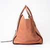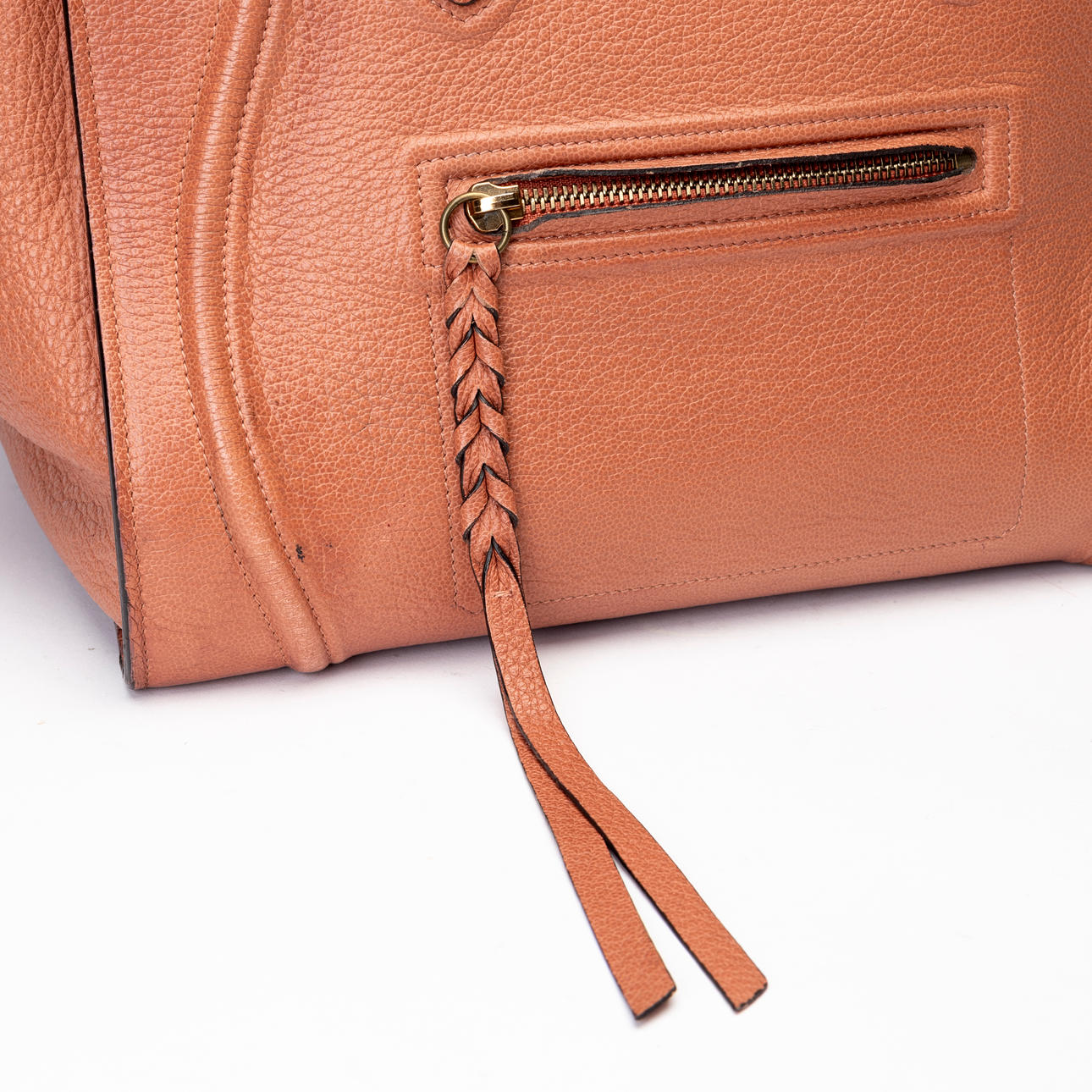 Apricot-colored embossed leather. Lined in matching suede, inside a large compartment and side compartment with zipper. Tagged “CÉLINE PARIS”.
