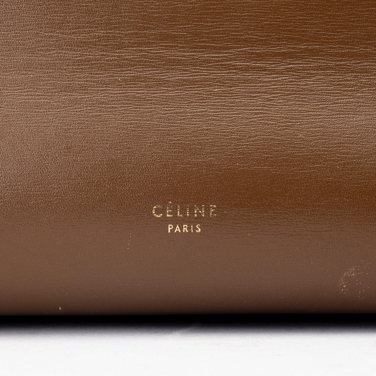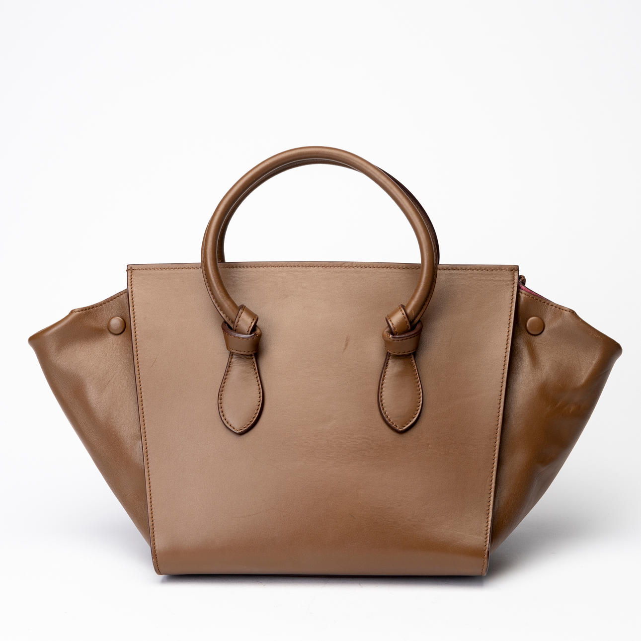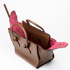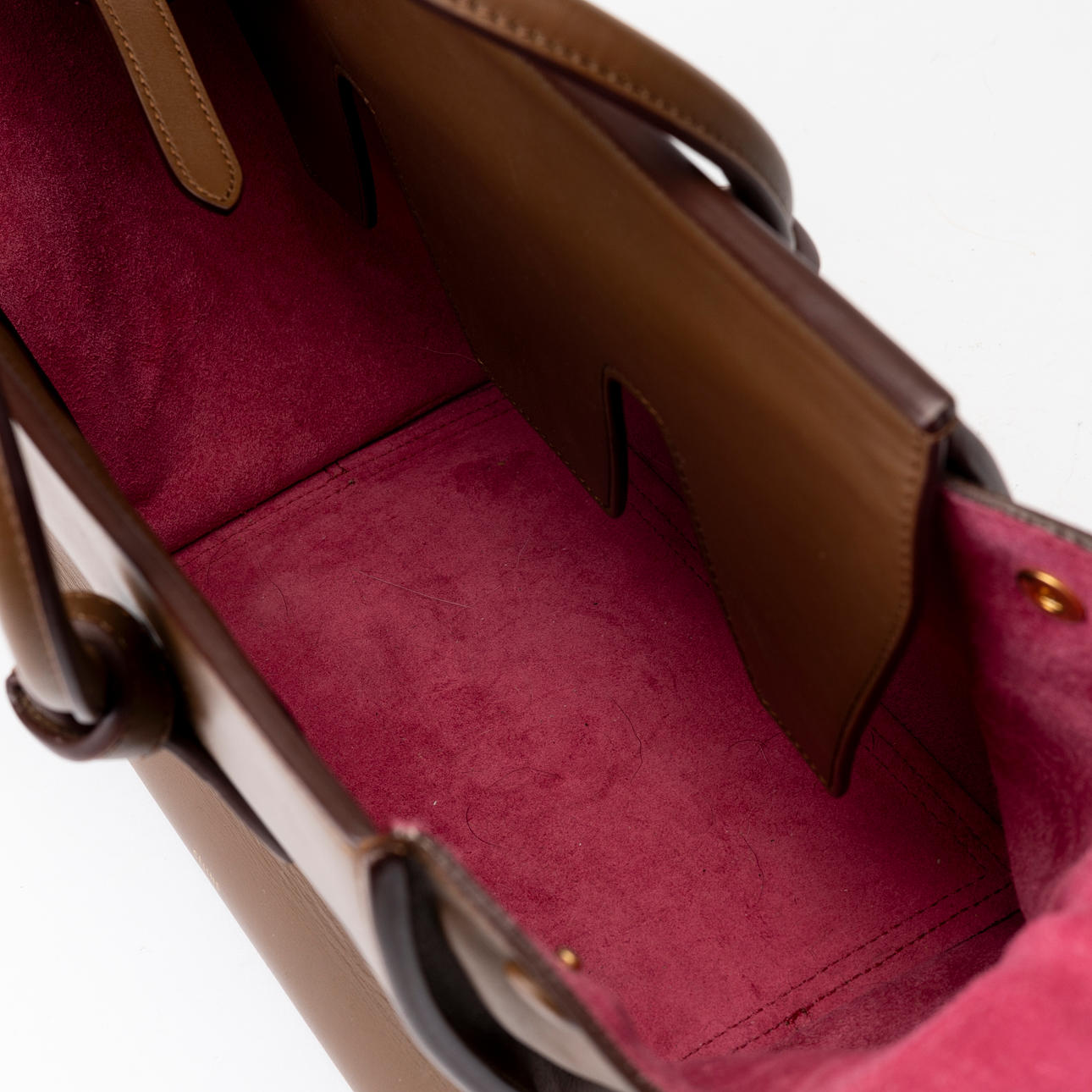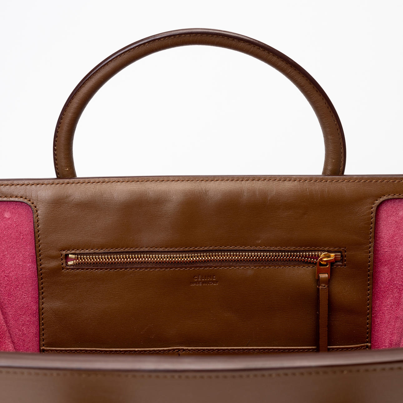 Brown leather, lined with cerise pink suede, inside a large compartment and three smaller side compartments, one of which with a zipper. Tagged “CÉLINE MADE IN ITALY”.