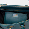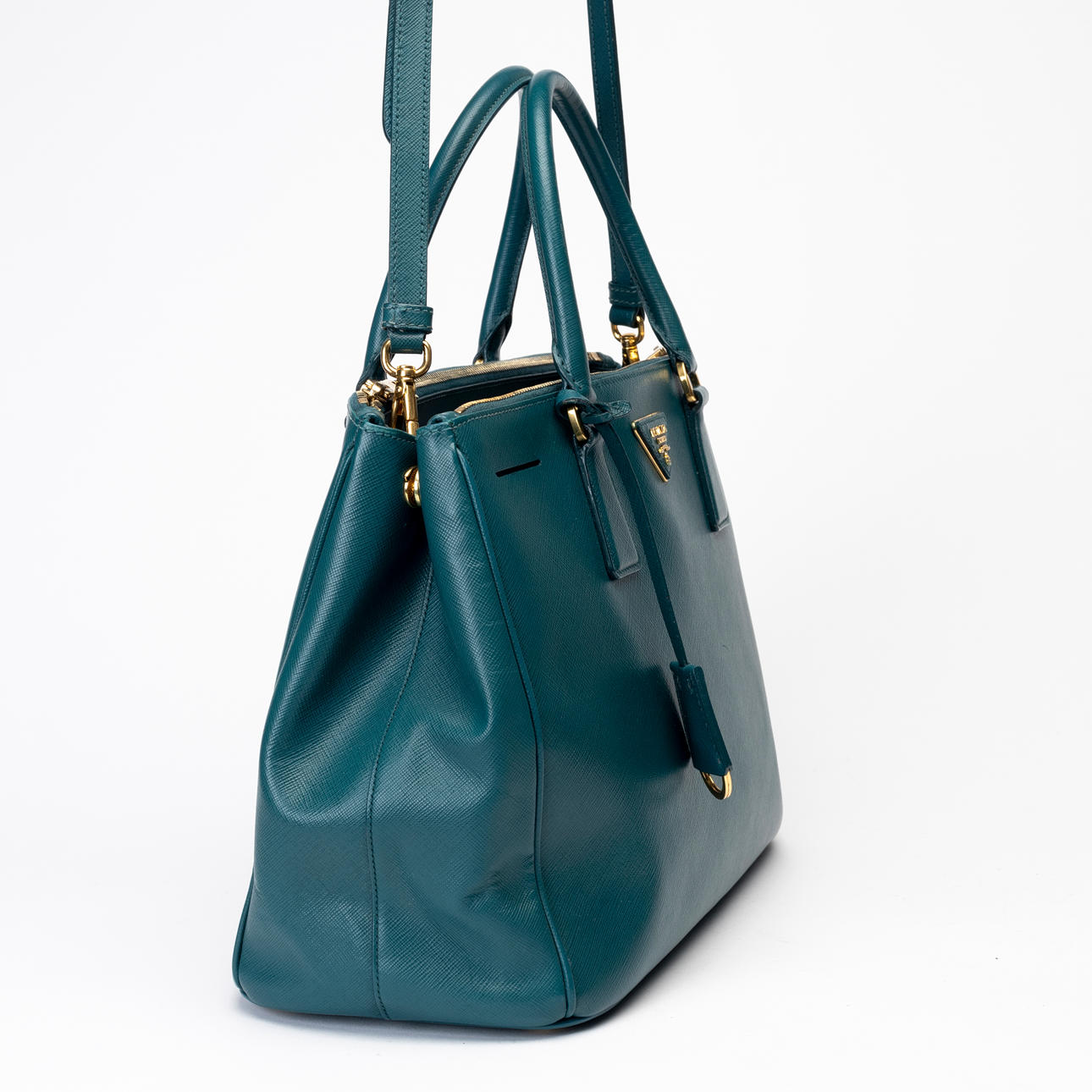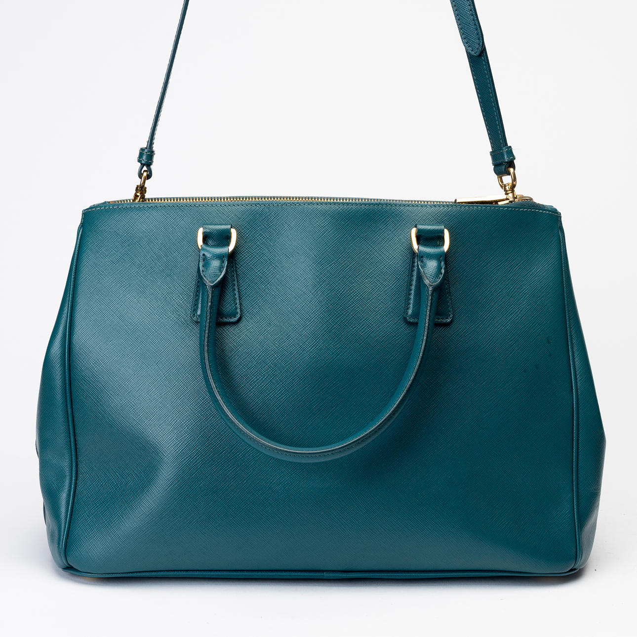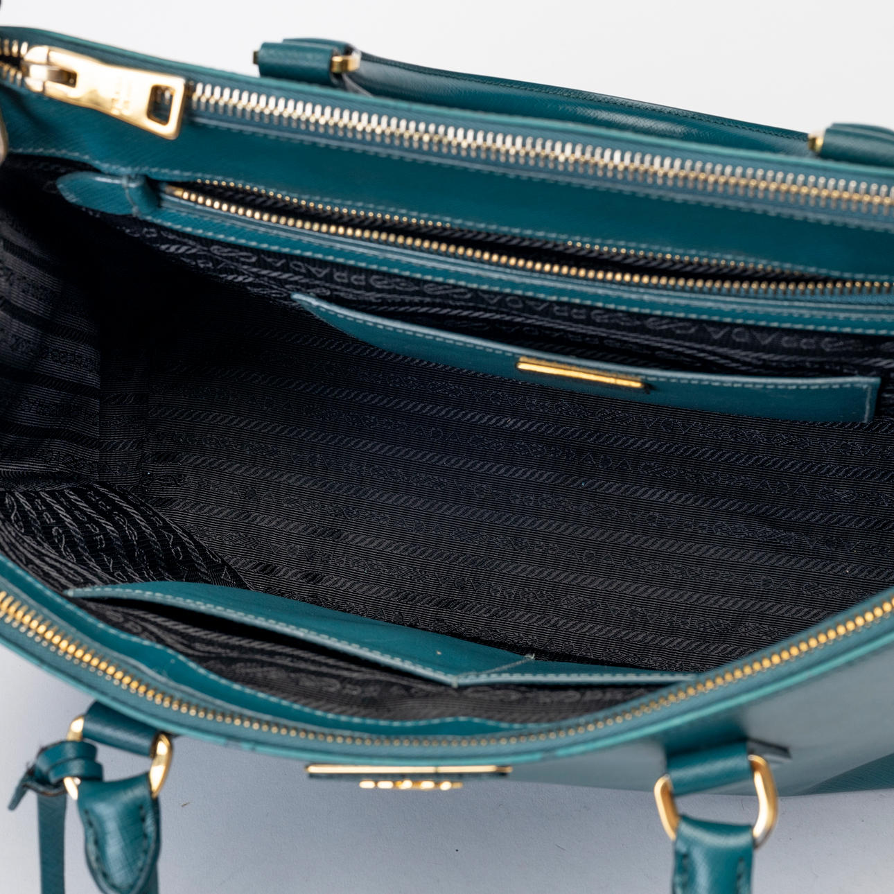 Peacock green saffiano leather with gold-colored hardware. Double compartments with zippers and open center compartment with three double side compartments and one with zipper, Lined with black logo print fabric. Marked enameled plaque “PRADA MILANO”. Removable shoulder strap.
