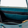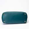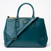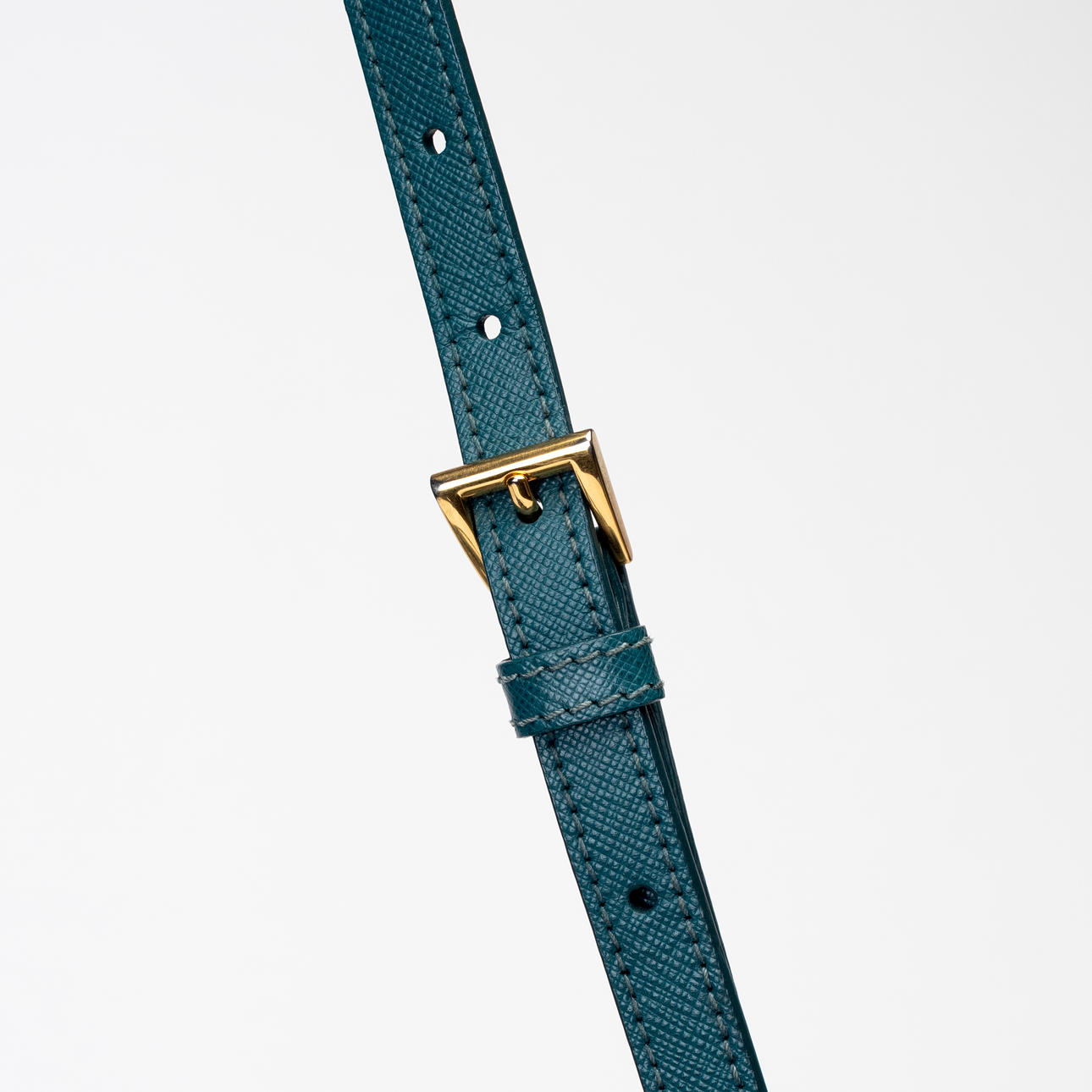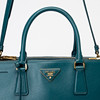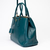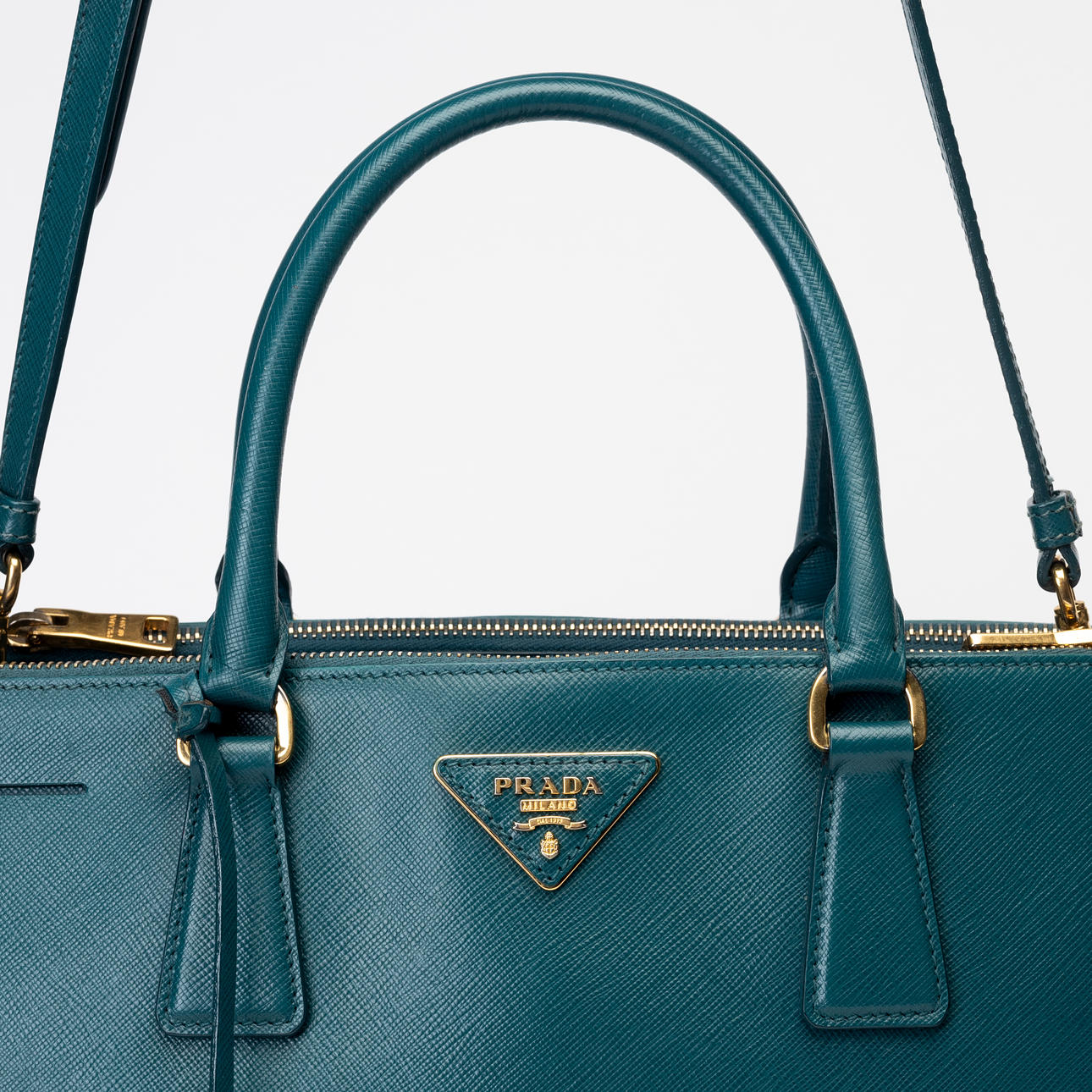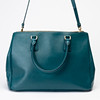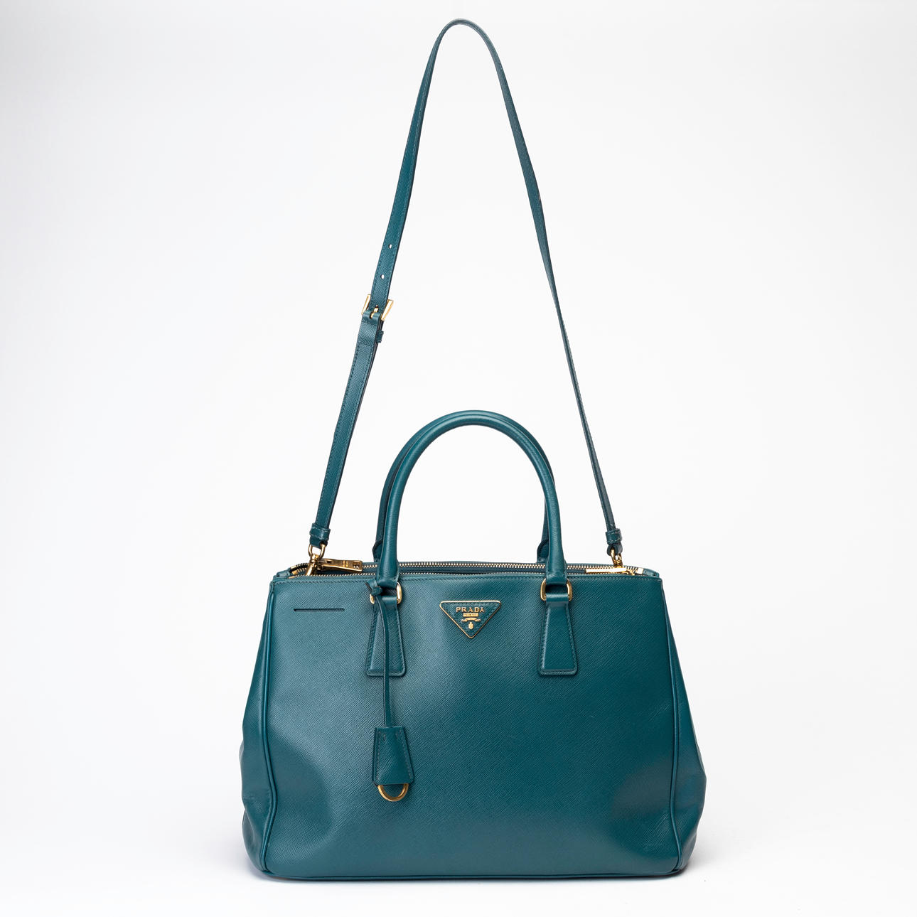 Peacock green saffiano leather with gold-colored hardware. Double compartments with zippers and open center compartment with three double side compartments and one with zipper, Lined with black logo print fabric. Marked enameled plaque “PRADA MILANO”. Removable shoulder strap.