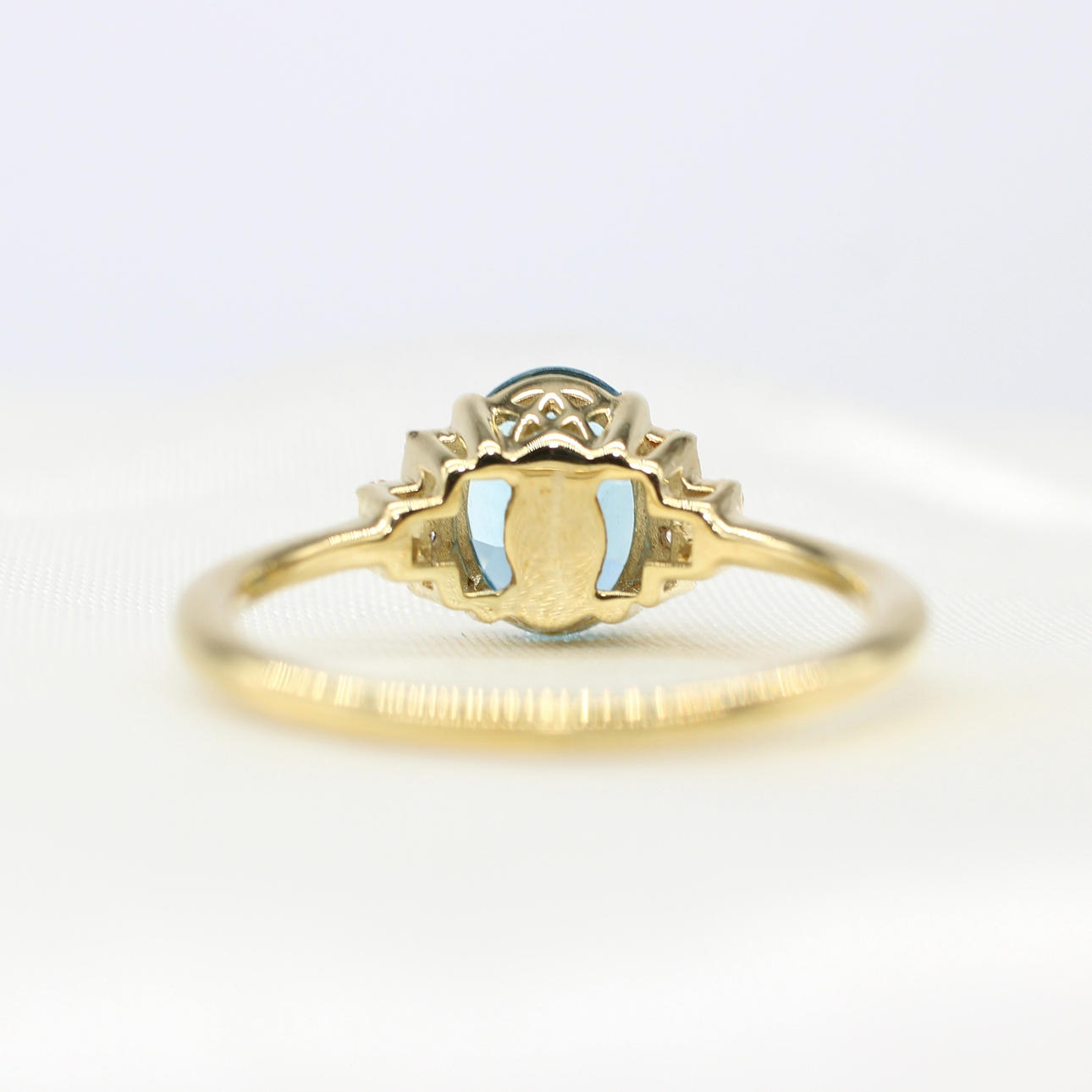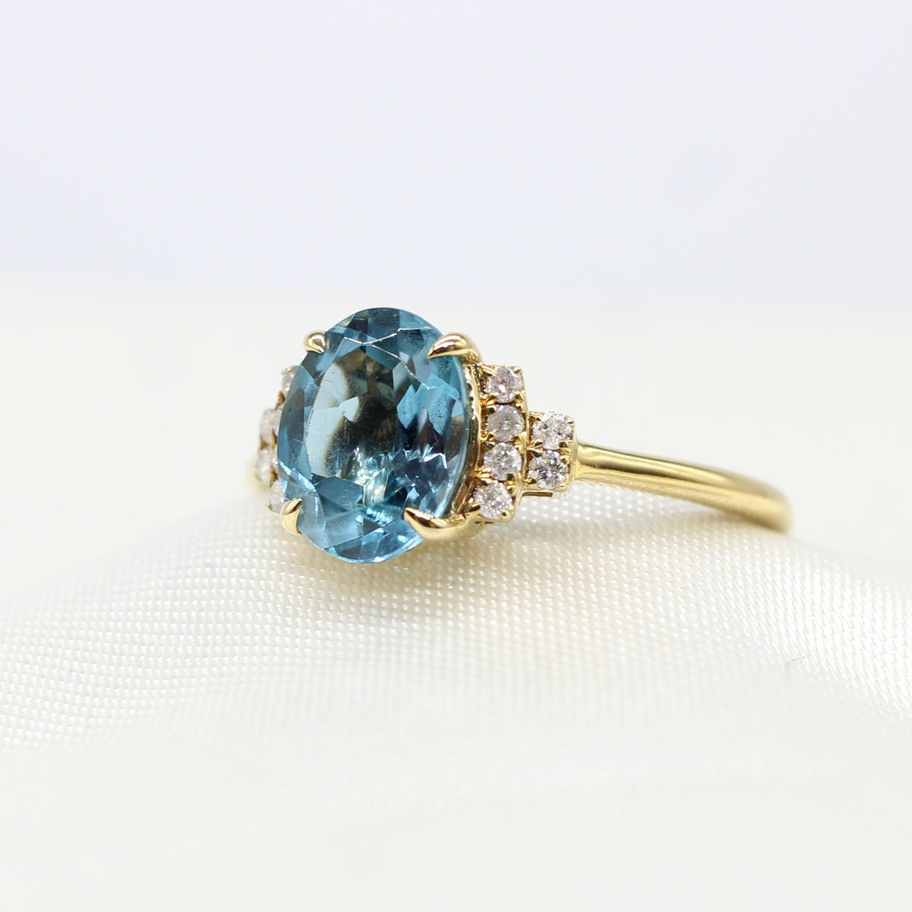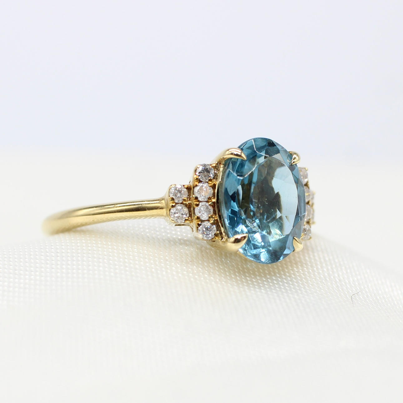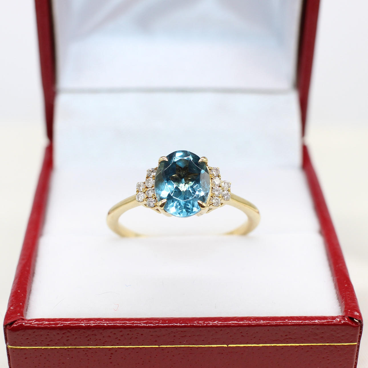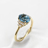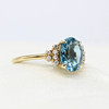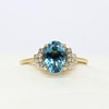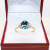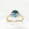 A 9K yellow gold (hallmarked) oval London blue topaz and round brilliant cut diamond ring.