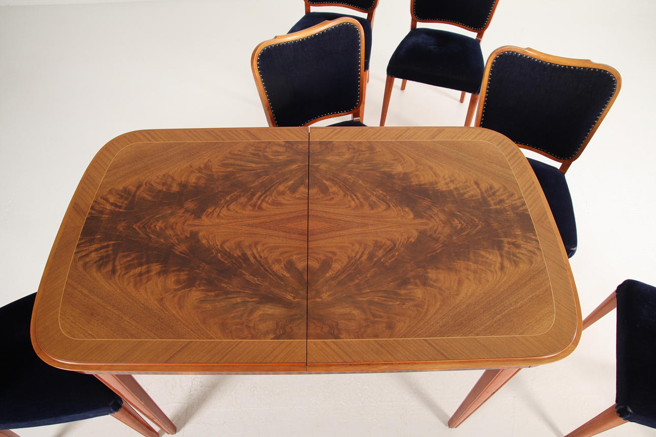 DINING TABLE WITH INSERTS AND 6 CHAIRS, Sweden 1950's.