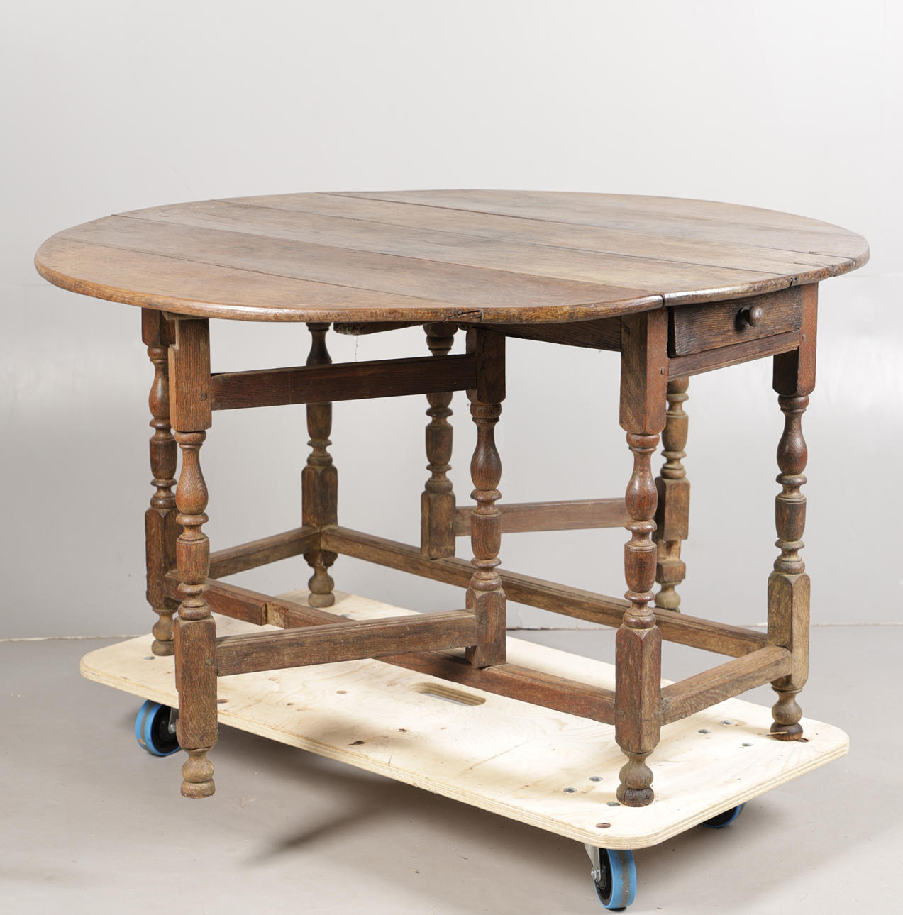 The top with a pair of demi-lune drop leaves, with a single drawer to one end, above baluster and knopped legs united plain legs and stretchers, 122.5cm wide 76cm high 52cm deep when in smallest form.