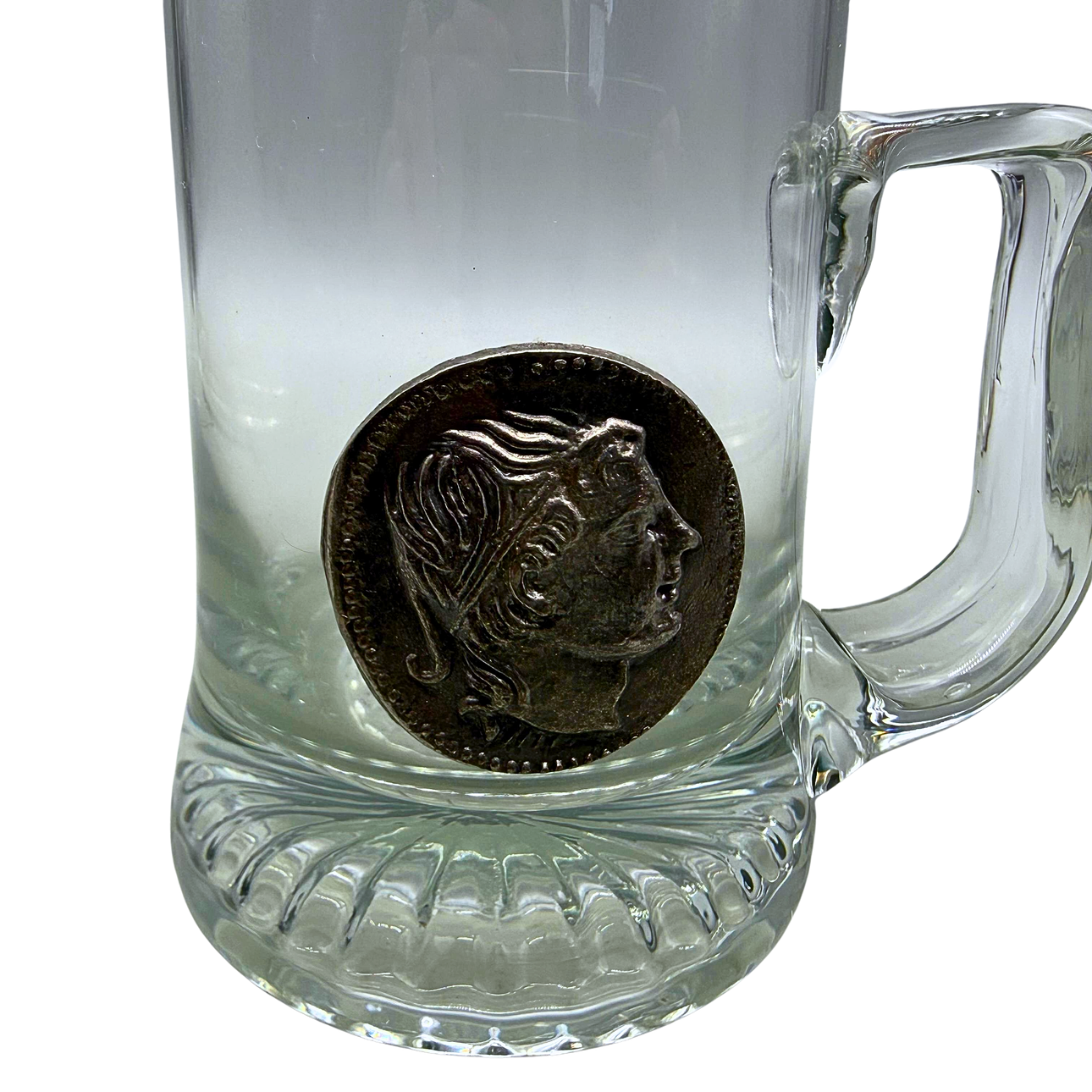 A glass beer mug with a head relief