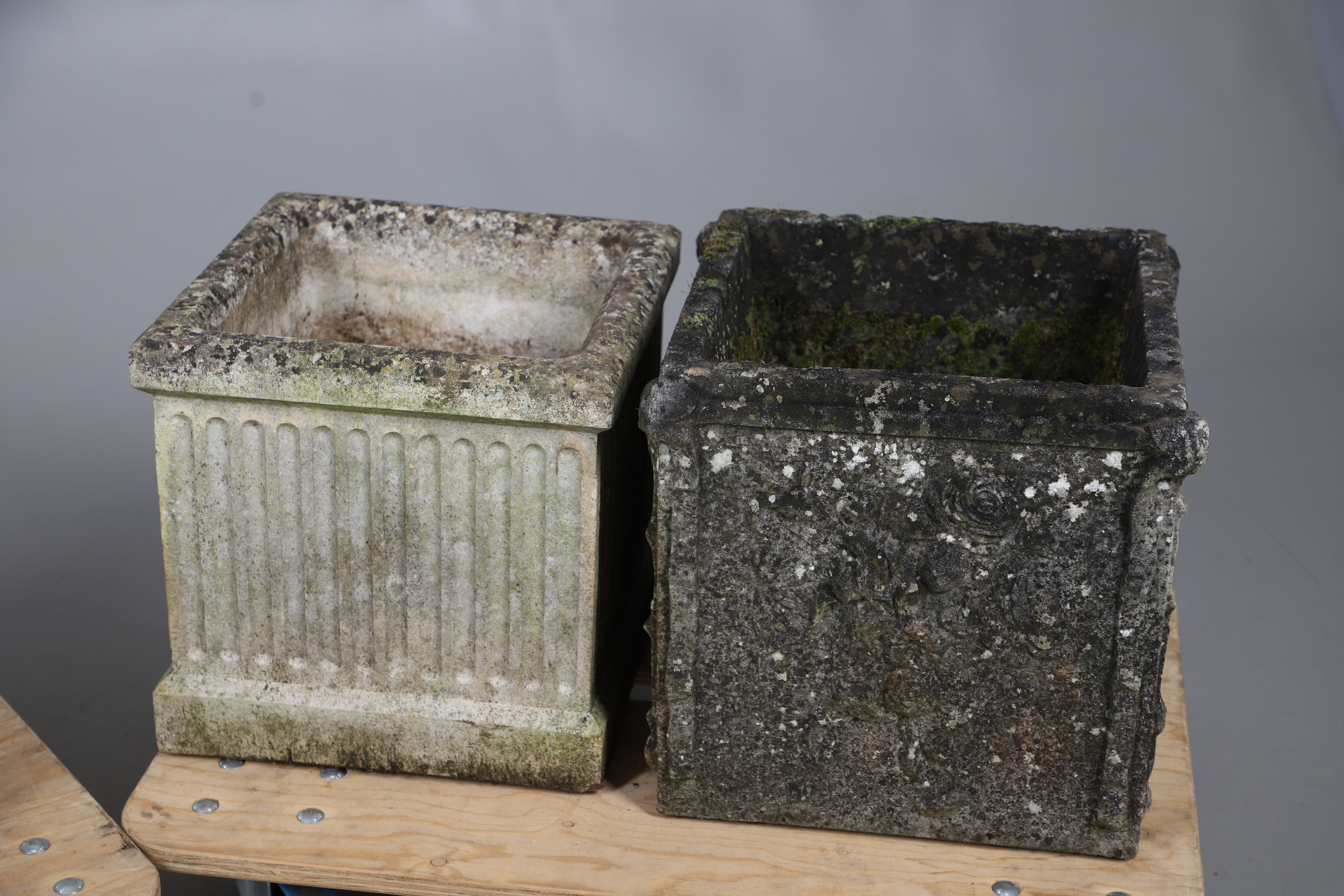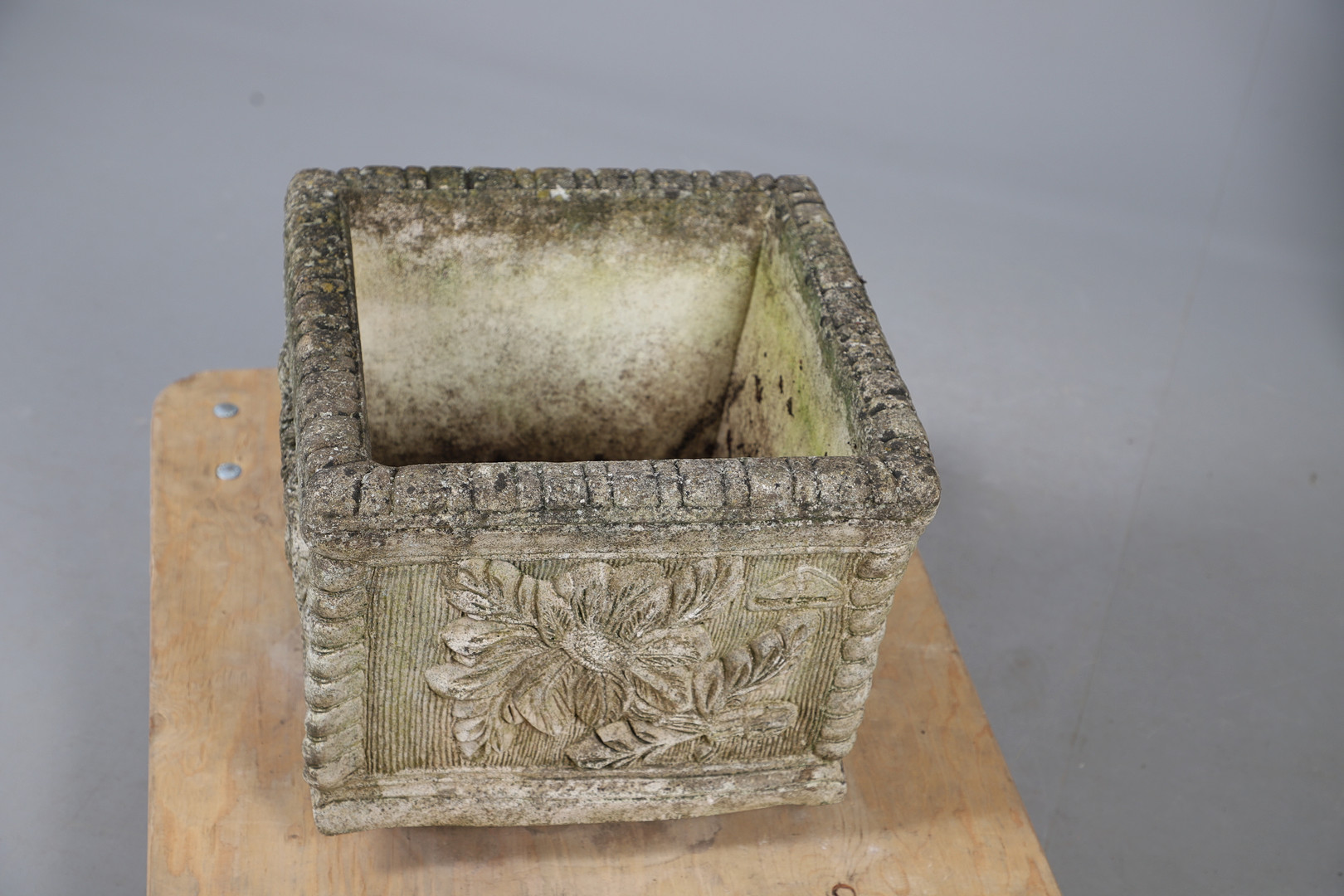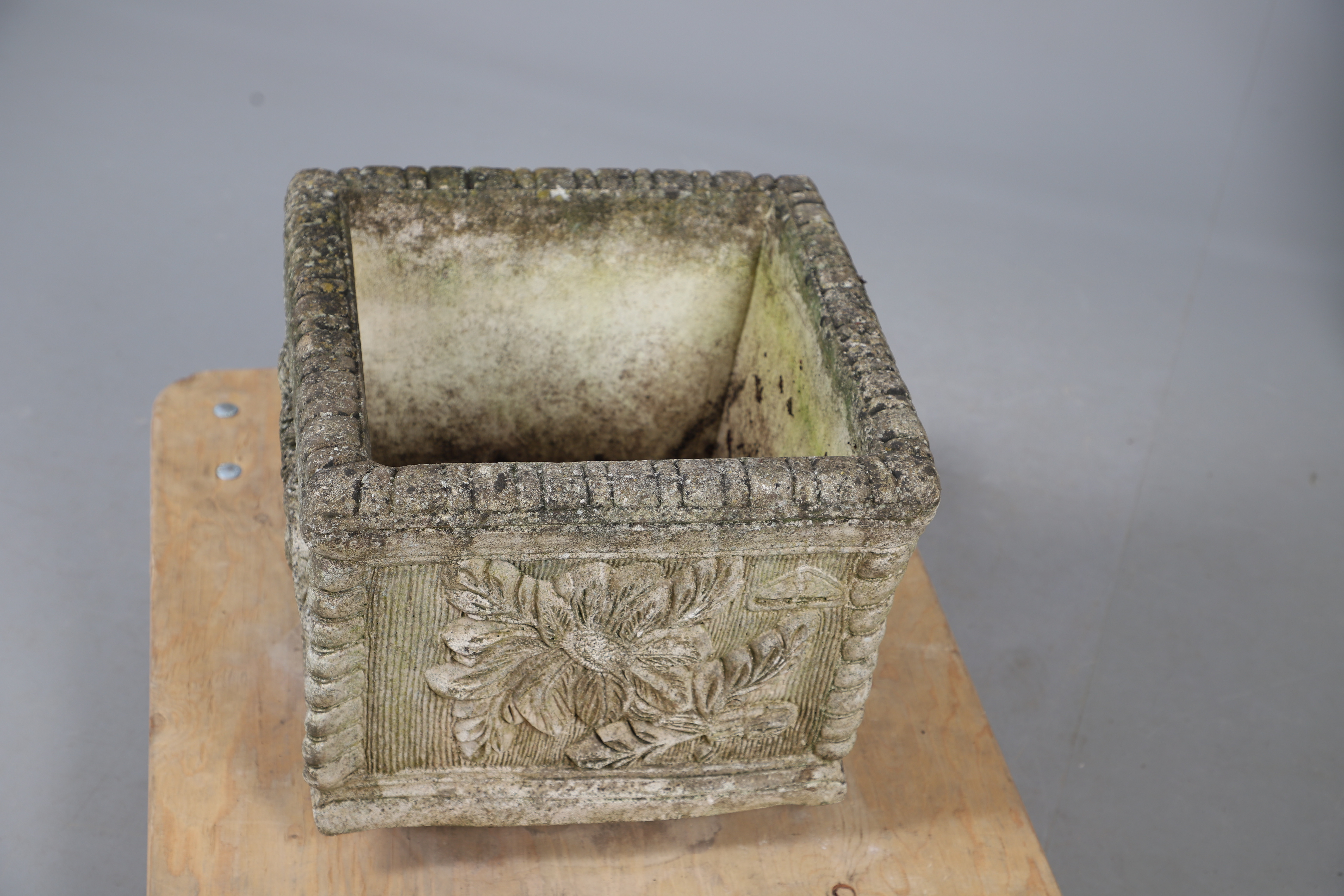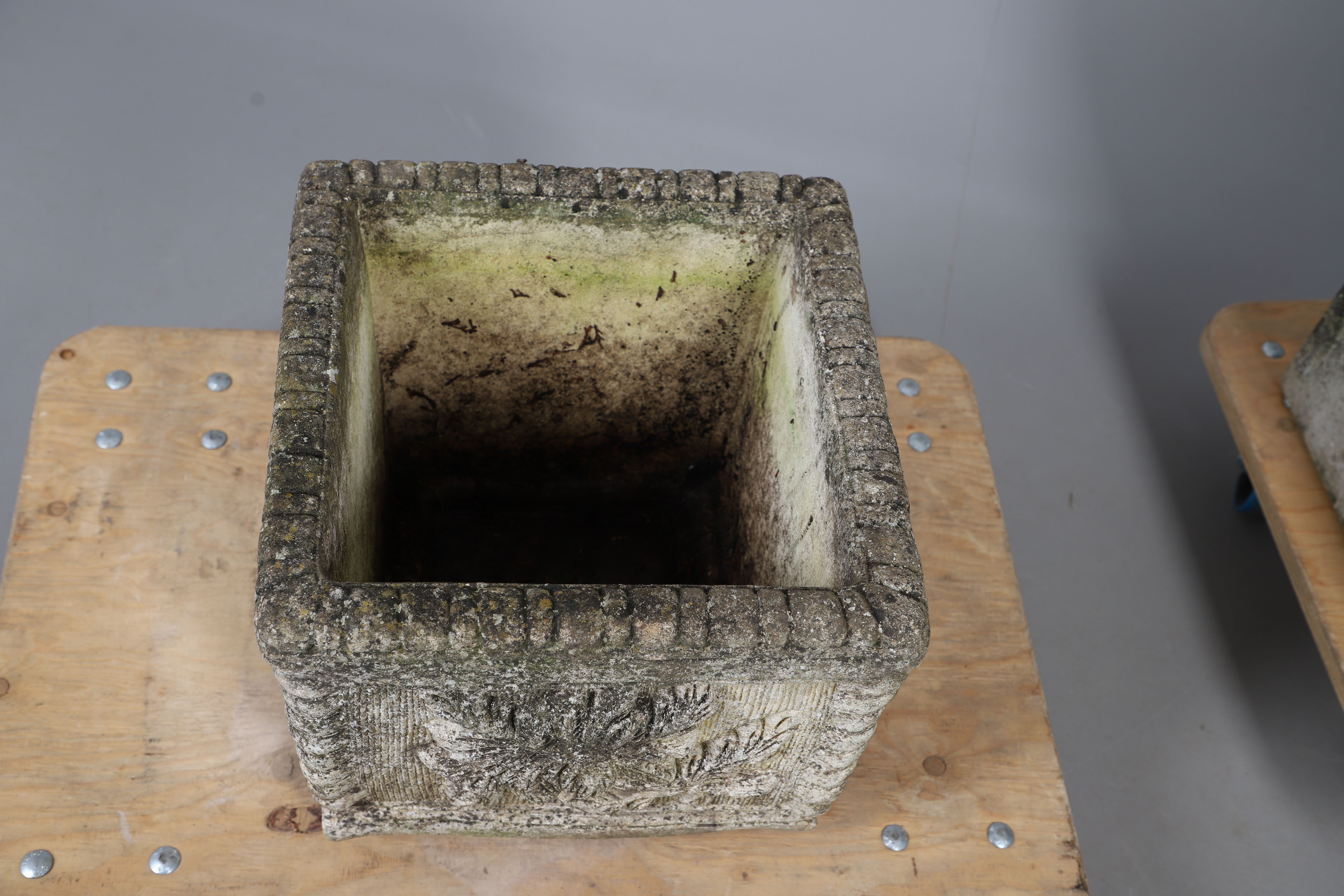 4931018. THREE RECONSTITUTED STONE SQUARE GARDEN PLANTERS.