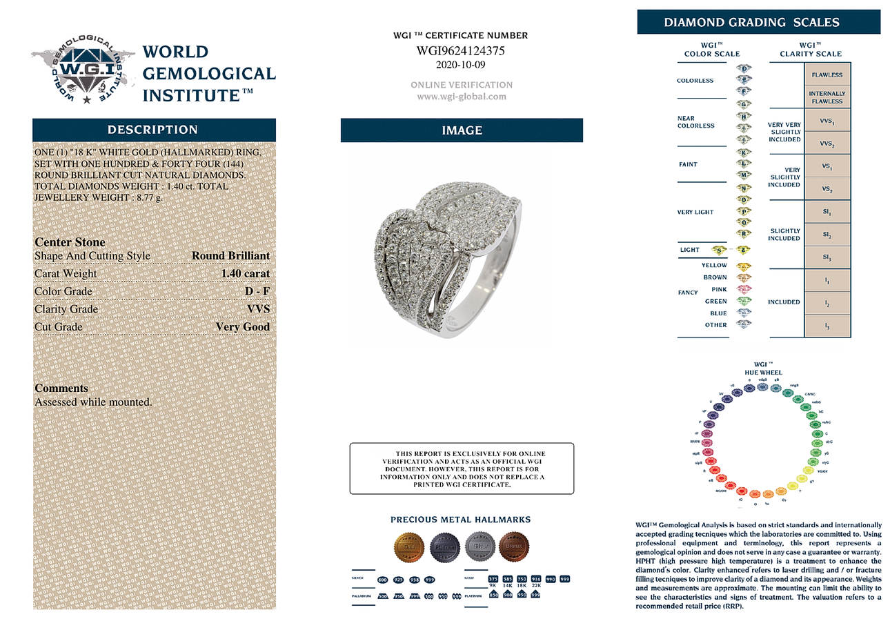 An 18ct white gold diamond set ring, set with 1.40ct of diamonds, with WGI certificate, colour D-F, clarity VVS. UK ring size N.5, approx. 8.77gr.