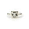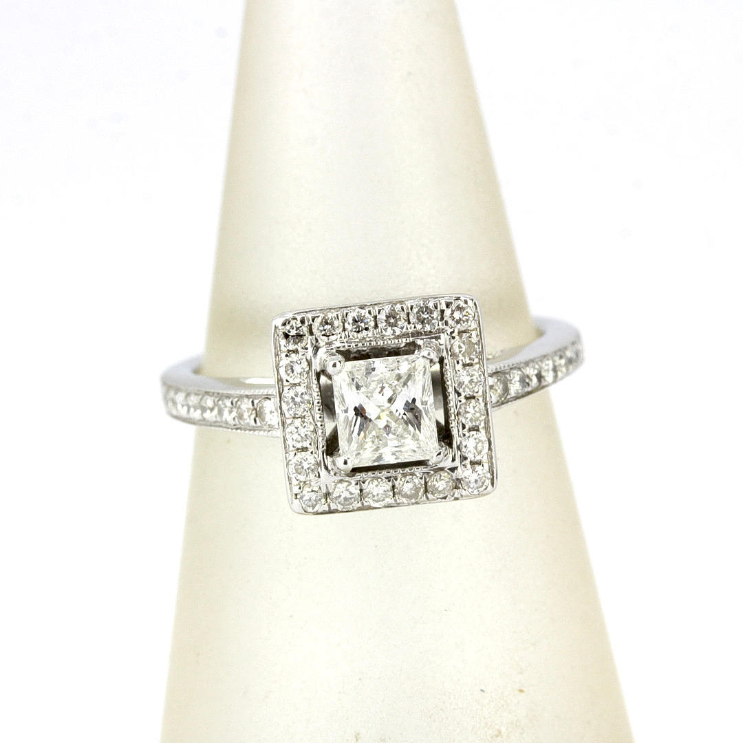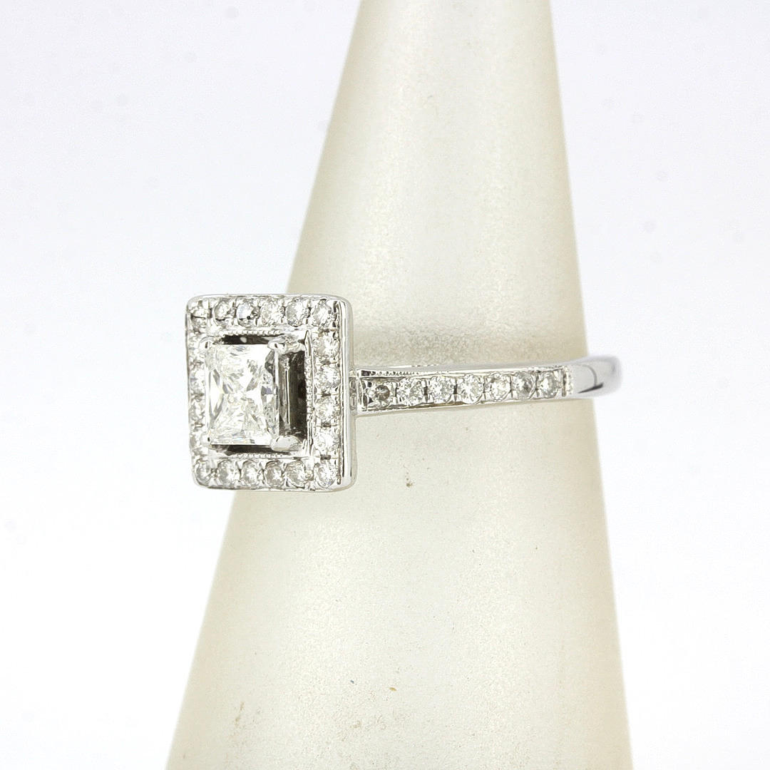 An 18ct white gold ring set with a princess cut diamond and brilliant cut diamonds, centre diamond 0.48ct, colour E, clarity SI1. Shoulders approx. 0.6ct, colour F-G, clarity VS-SI. With WGI certificate, UK ring size J.5, approx. 4.02gr.