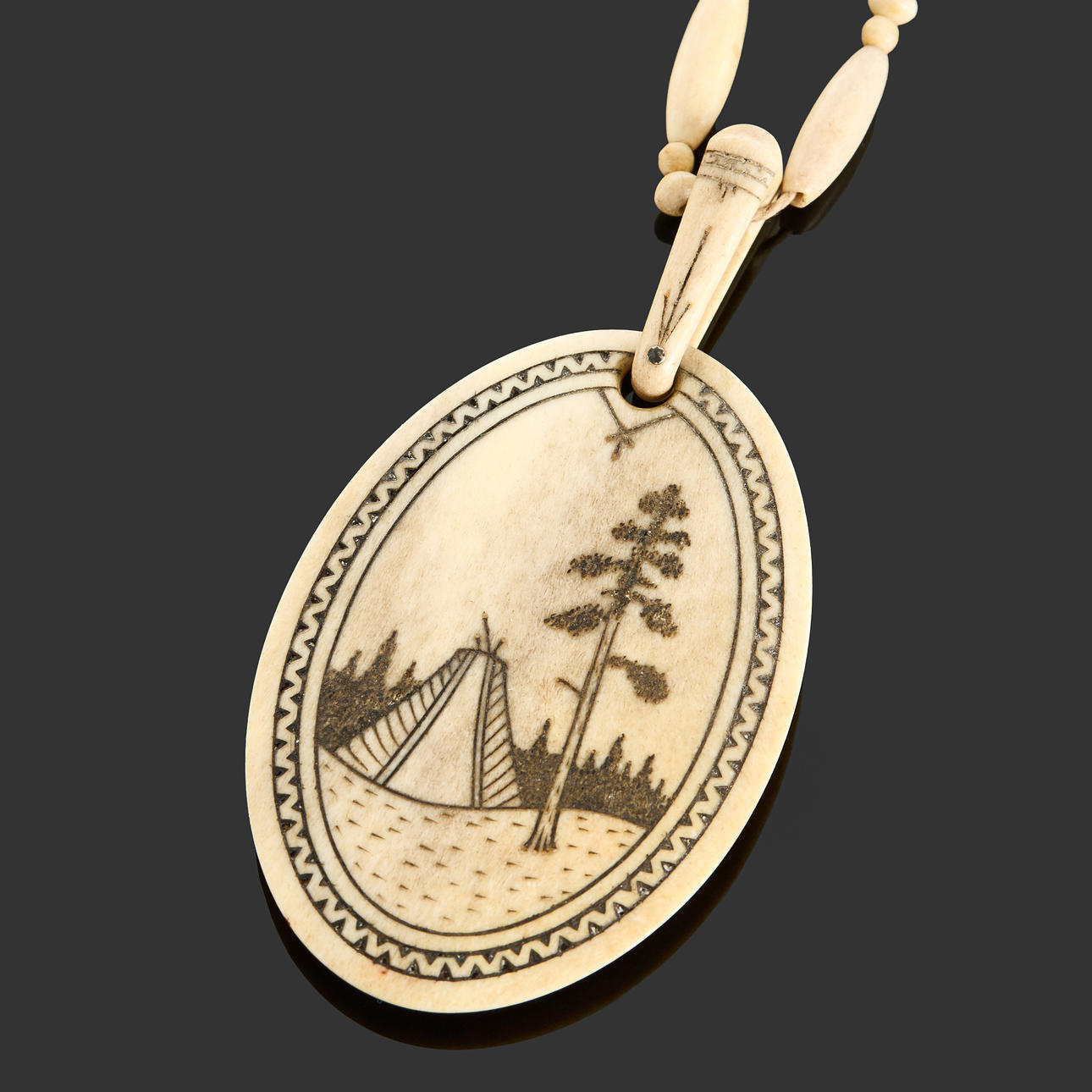 Cut reindeer horn with decoration of lonely horny - opposite side with relief decor of rising sun behind scales with reindeer in foreground.