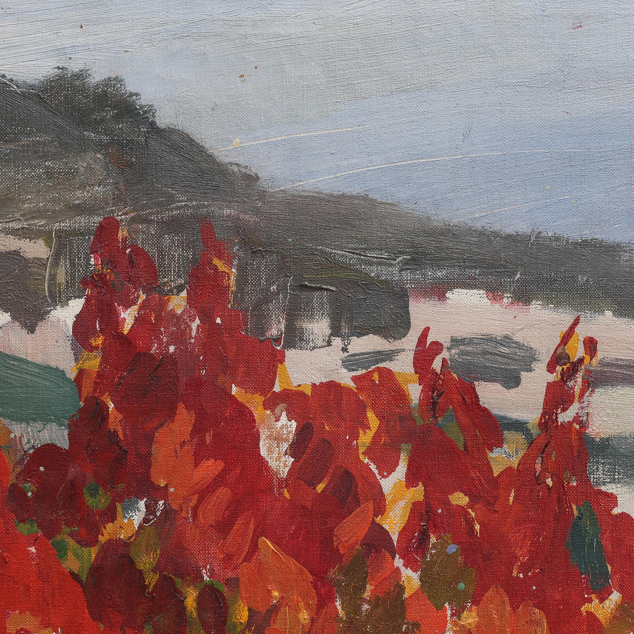 Slightly wavy canvas. Frame wear.