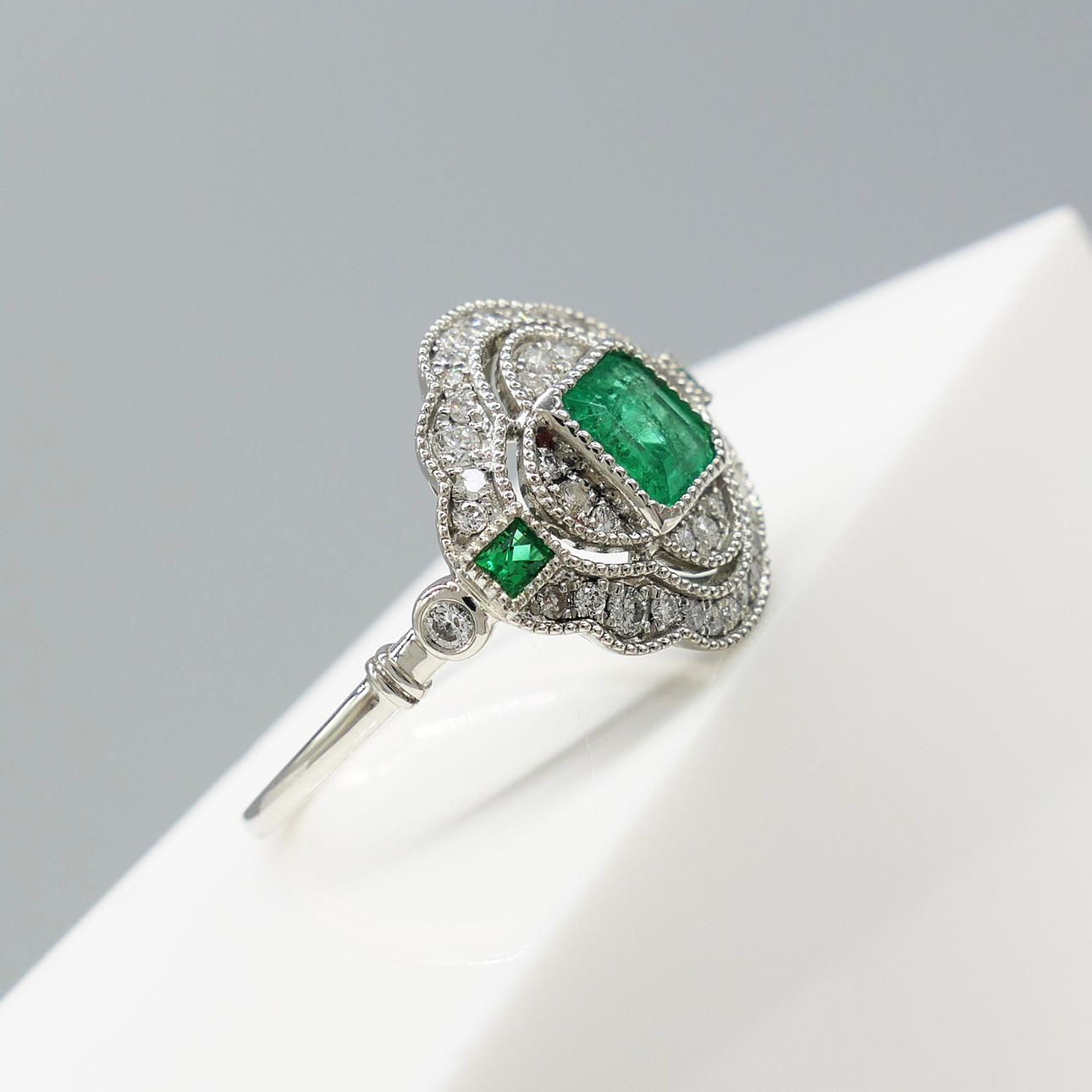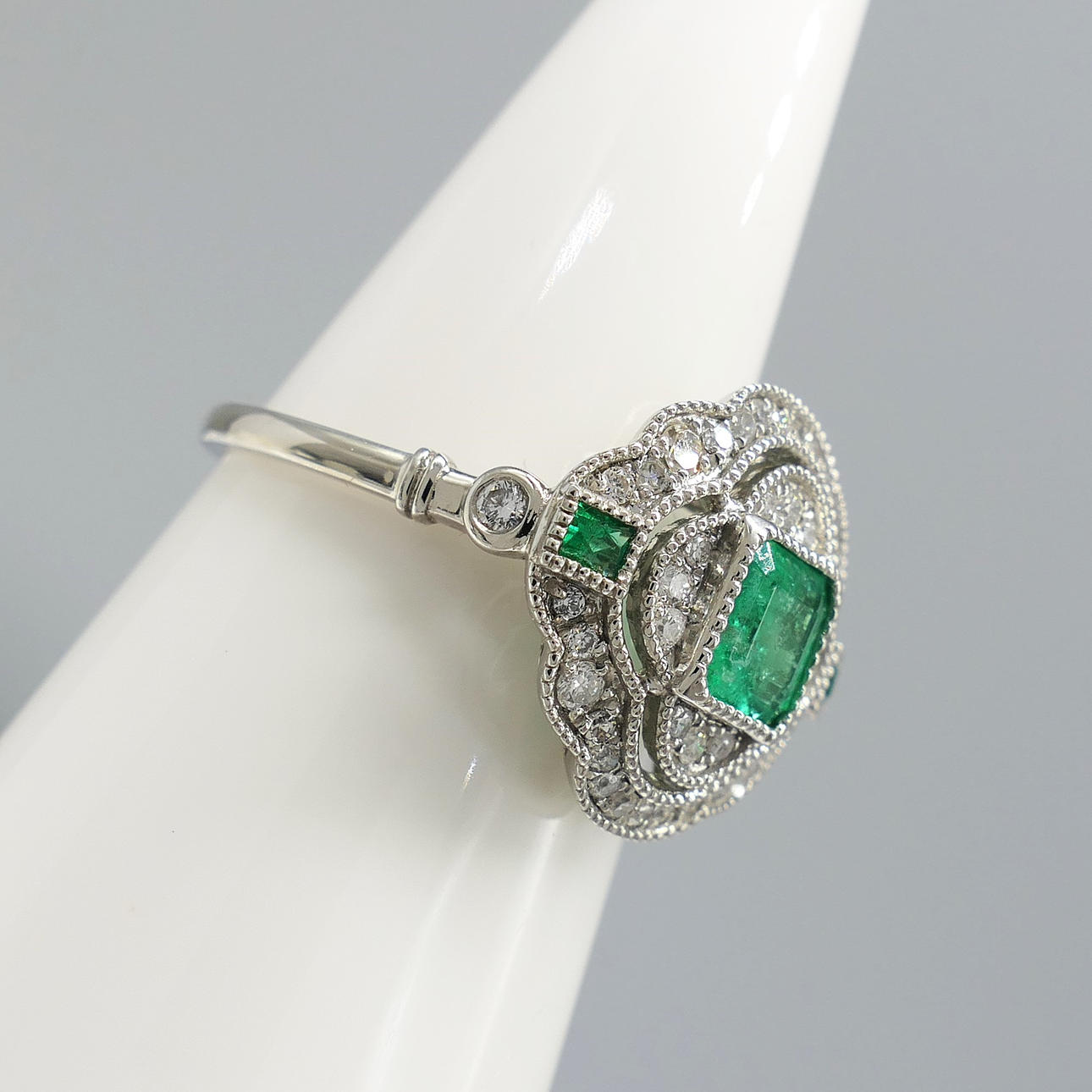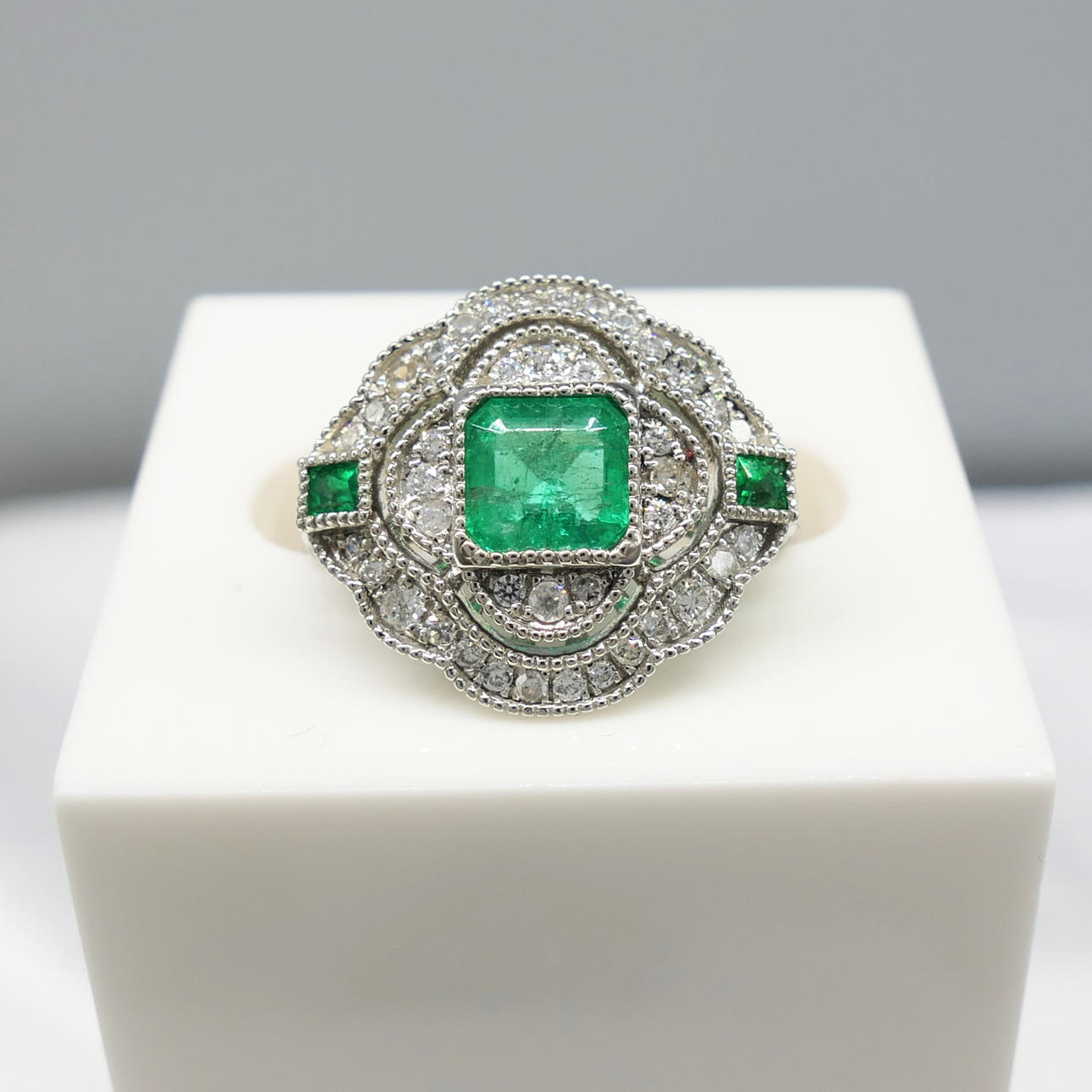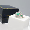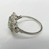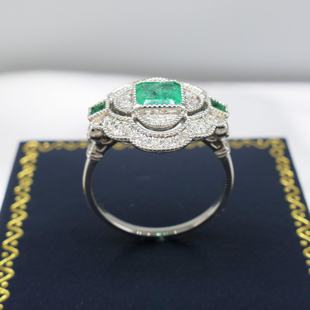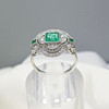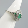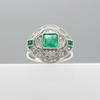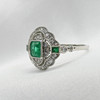 A distinctive platinum 950 regency style ring set with emeralds and diamonds, supplied with a gift box