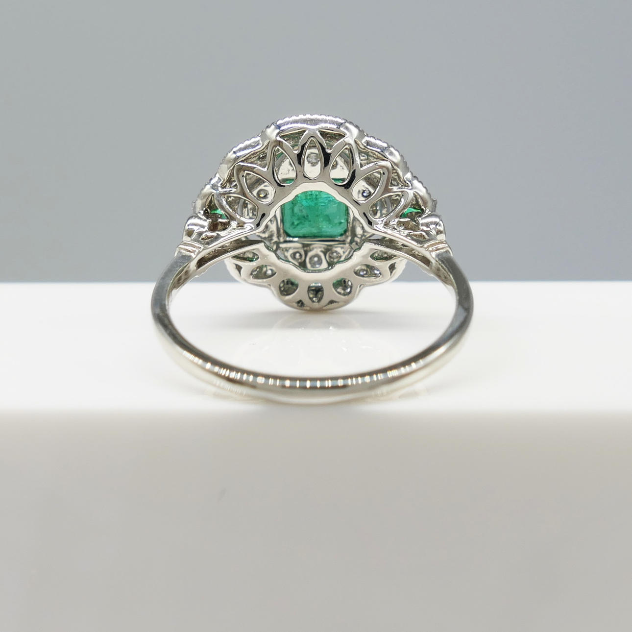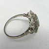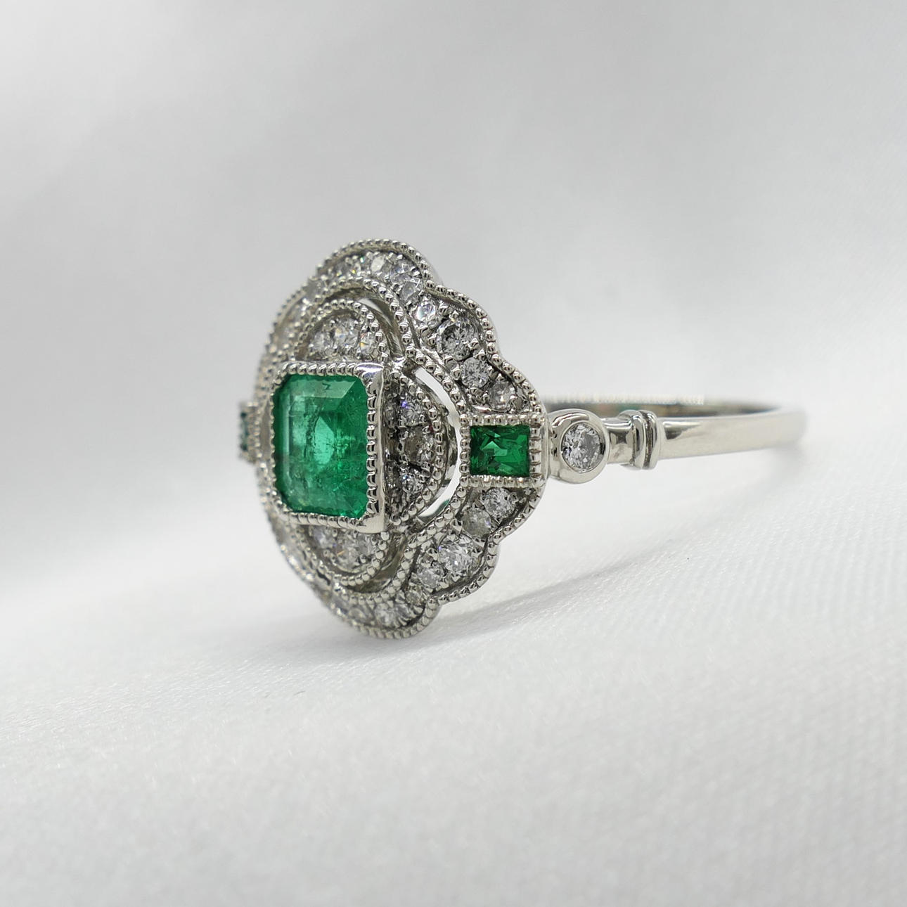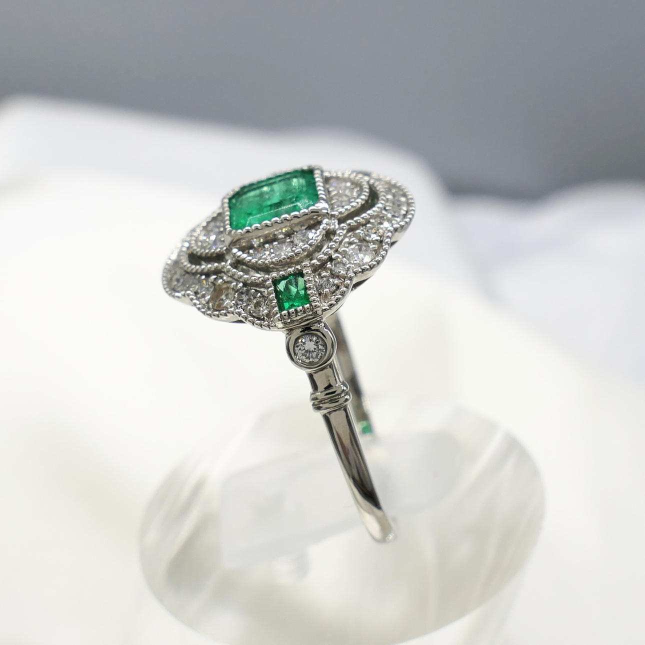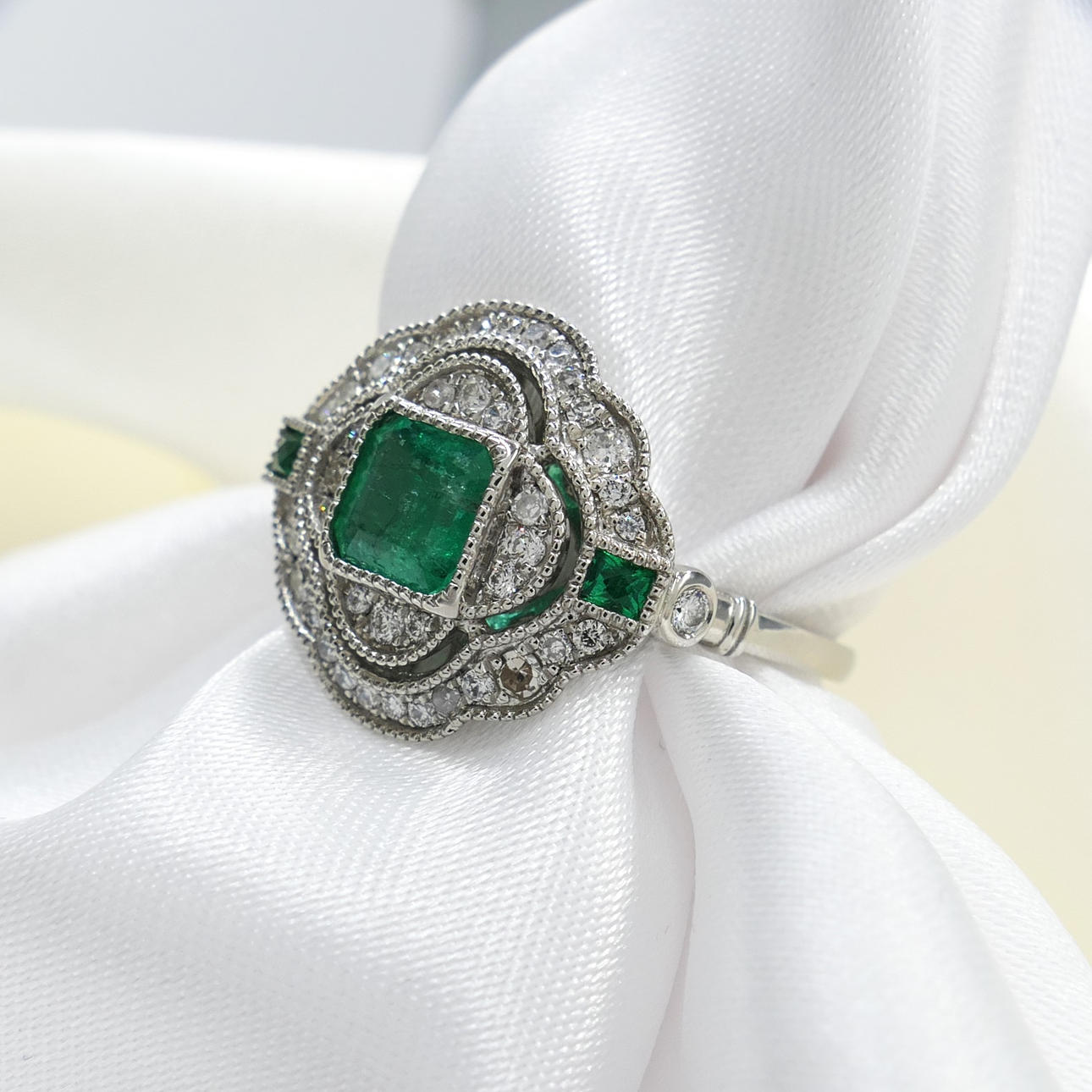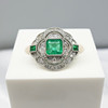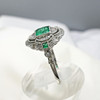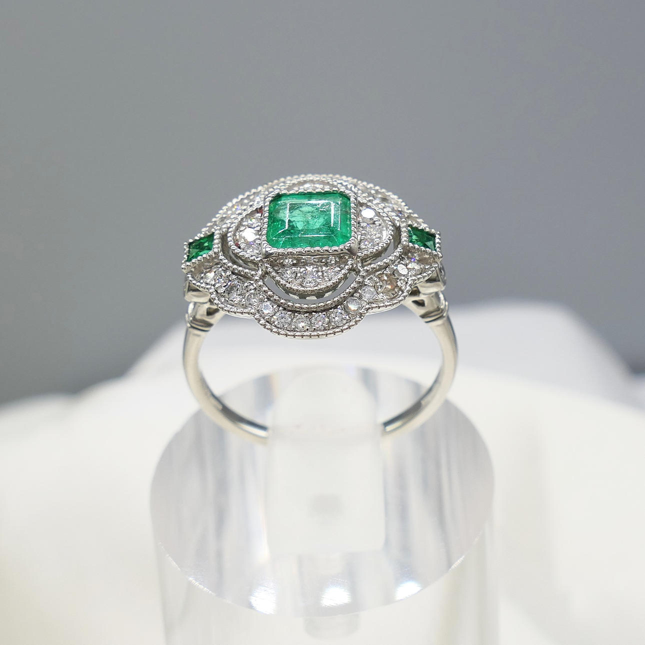 A distinctive platinum 950 regency style ring set with emeralds and diamonds, supplied with a gift box