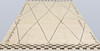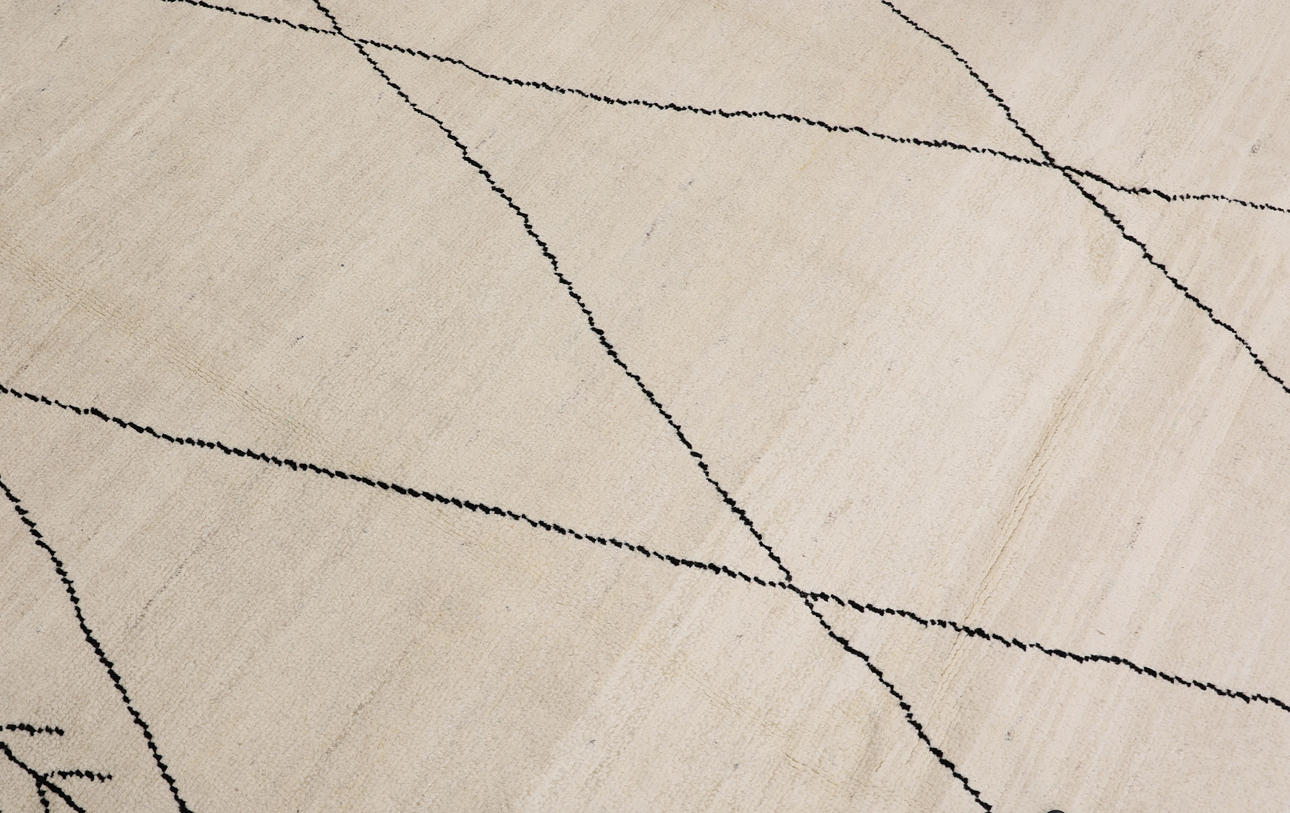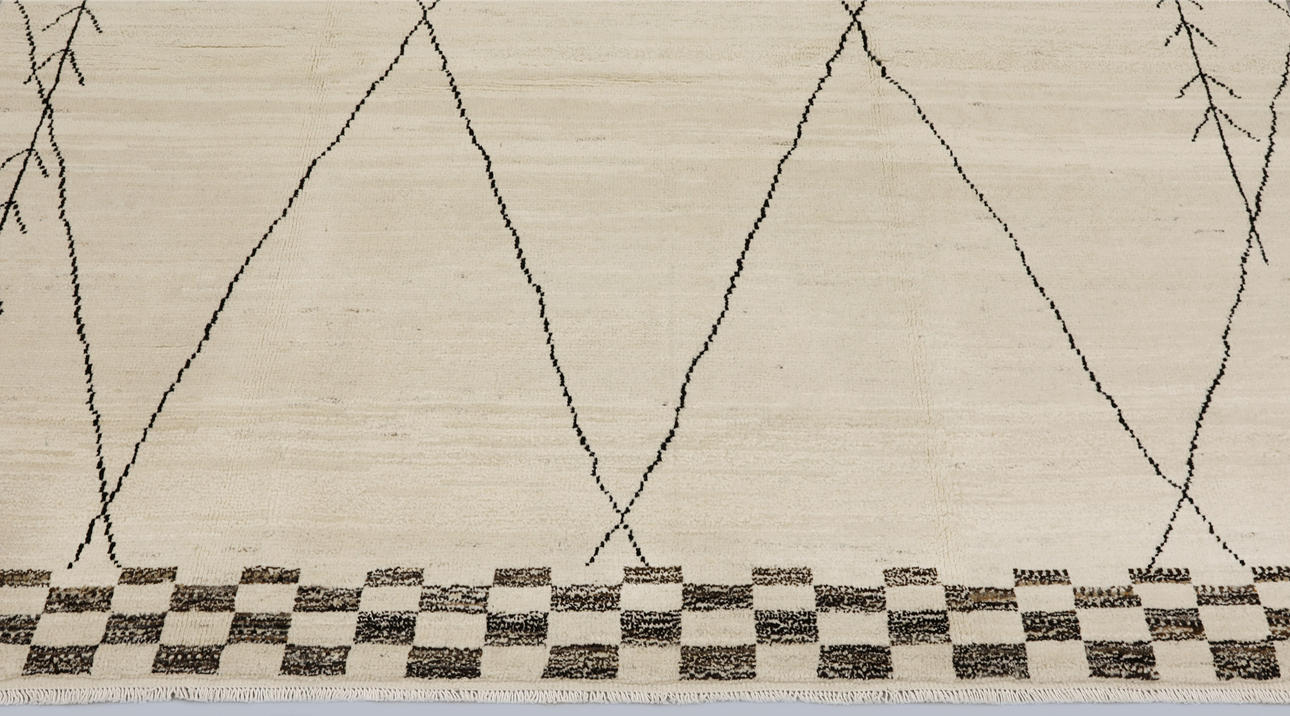 Morocco with a bright bottom and an open center field with a simple, geometric checkerboard pattern in a dark contrasting color. The forelock is made of wool and the warp is of cotton.
