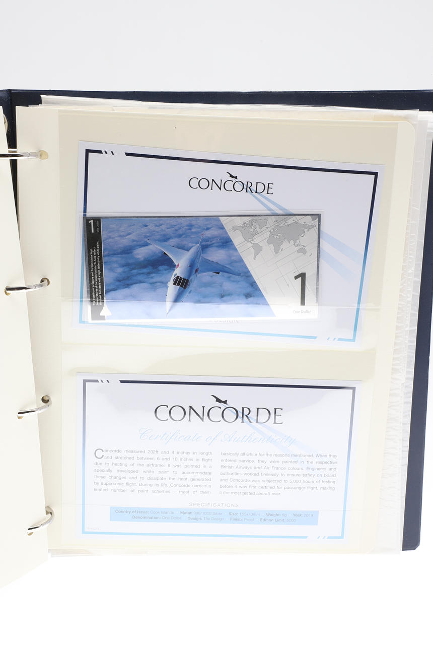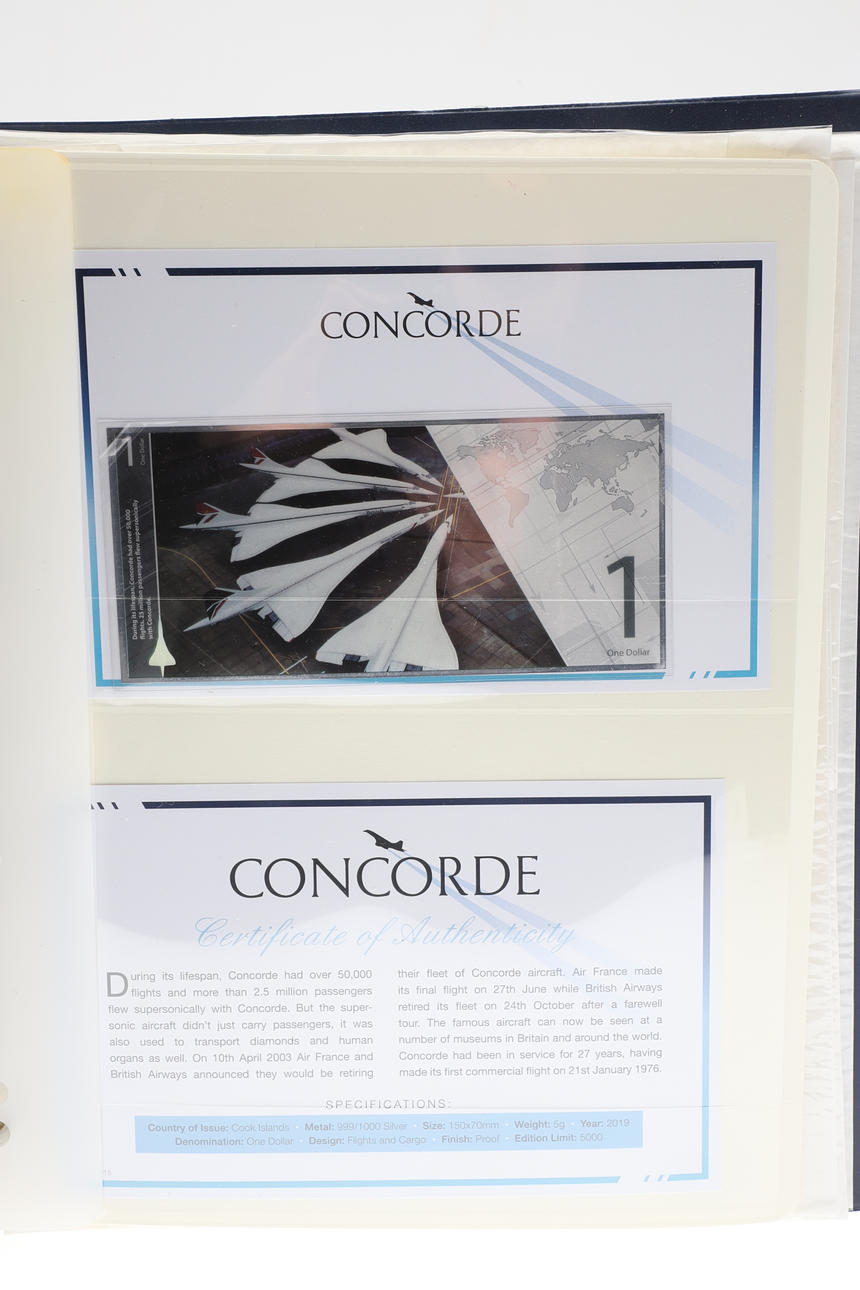 A set of seven Cook Islands silver proof One Dollar banknotes, 5 grams each, made in 2019 in an adition of 5000. In a folder with information. Folder 32cms by 27cms.