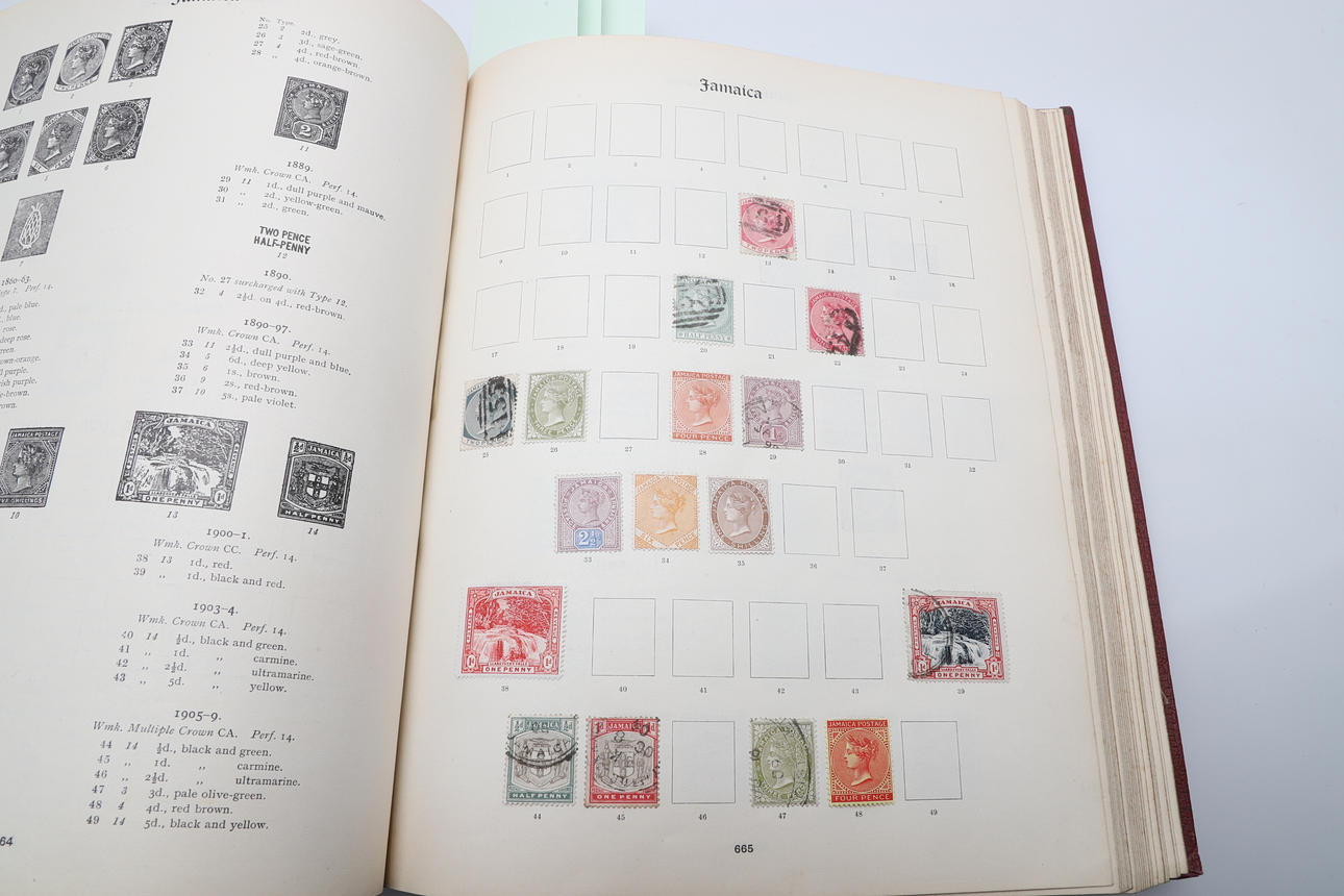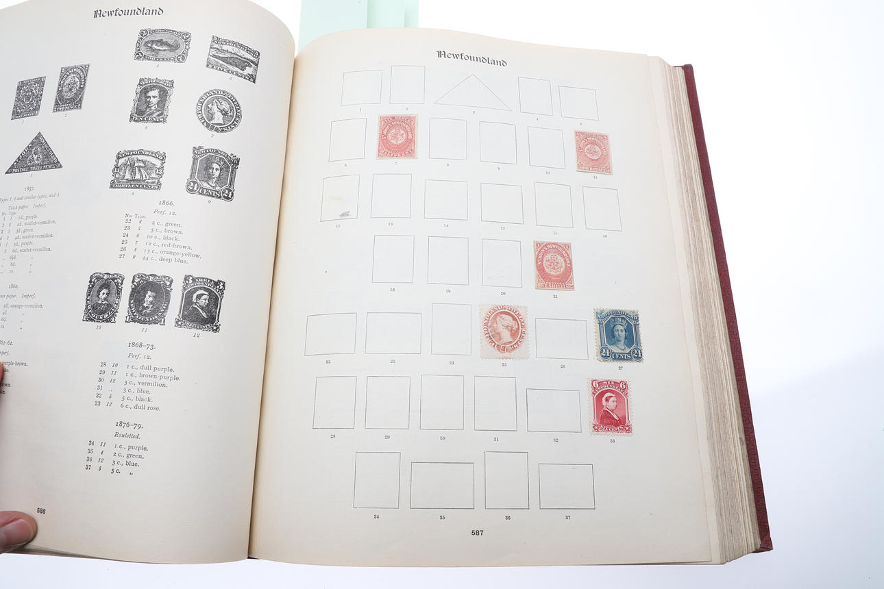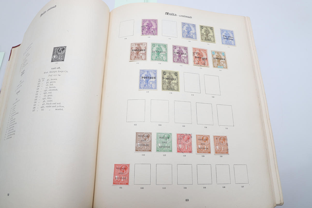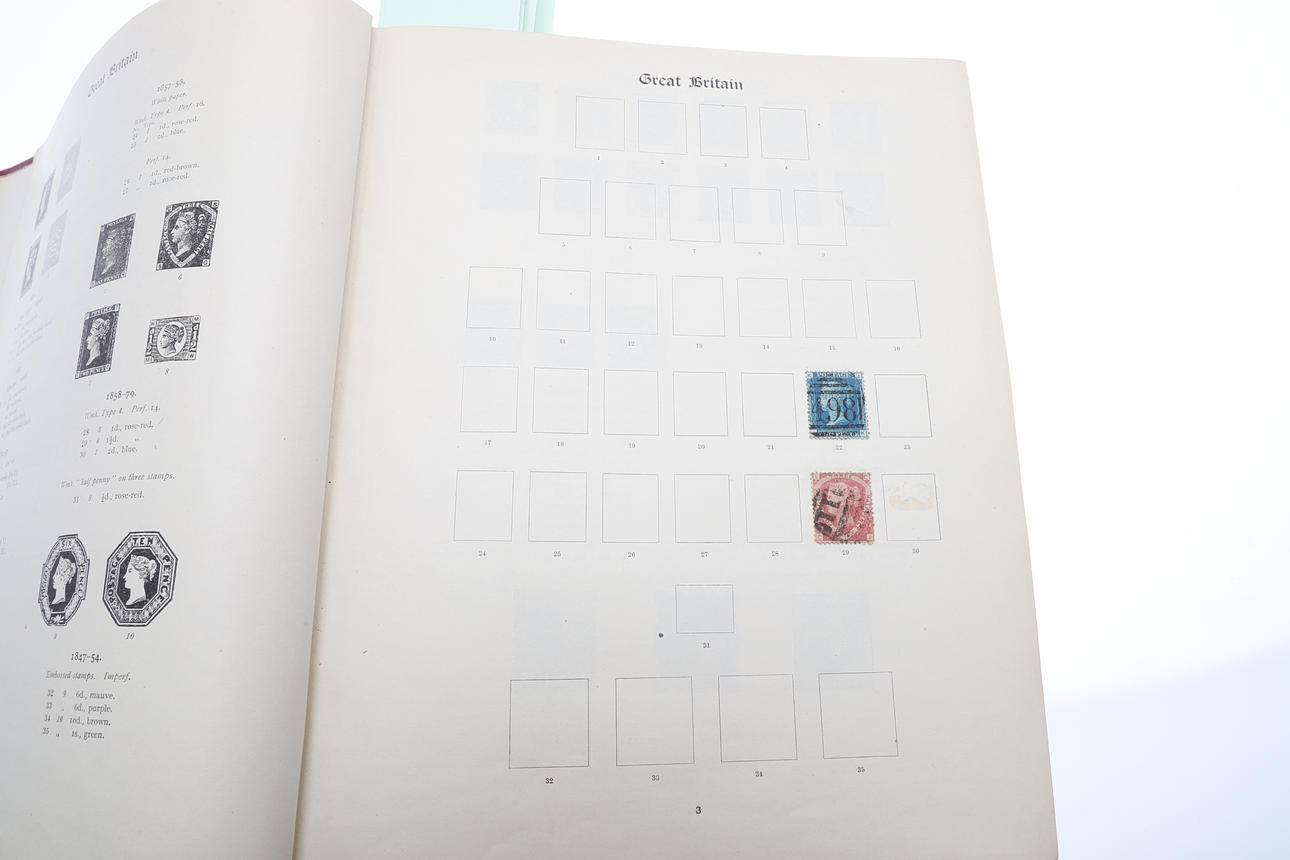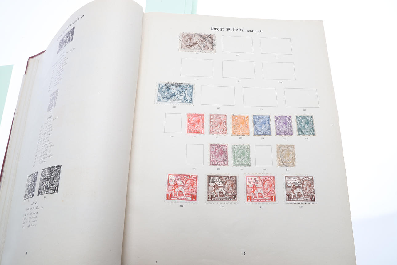 A large partially filled album with Great Britain and Commonwealth stamps, including 2d blue and other Victorian and 20thc stamps (Seahorse stamps, Empire Exhibition 1925 etc), used and mint 19thc and 20thc stamps including Cyprus, Gibraltar, India, Malta, Ceylon, African Countries, Canada, Newfoundland, Australia, West Indies, and many more. Album 29cms by 25cms.