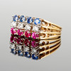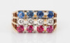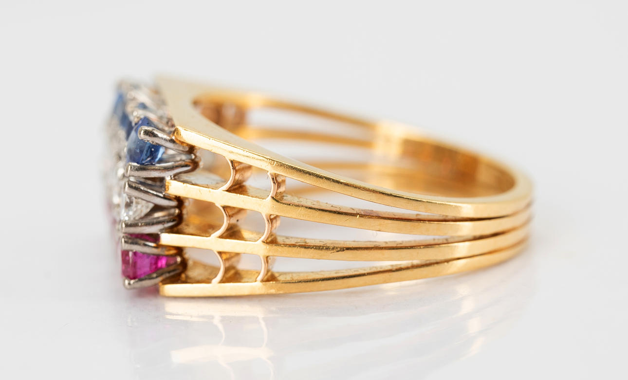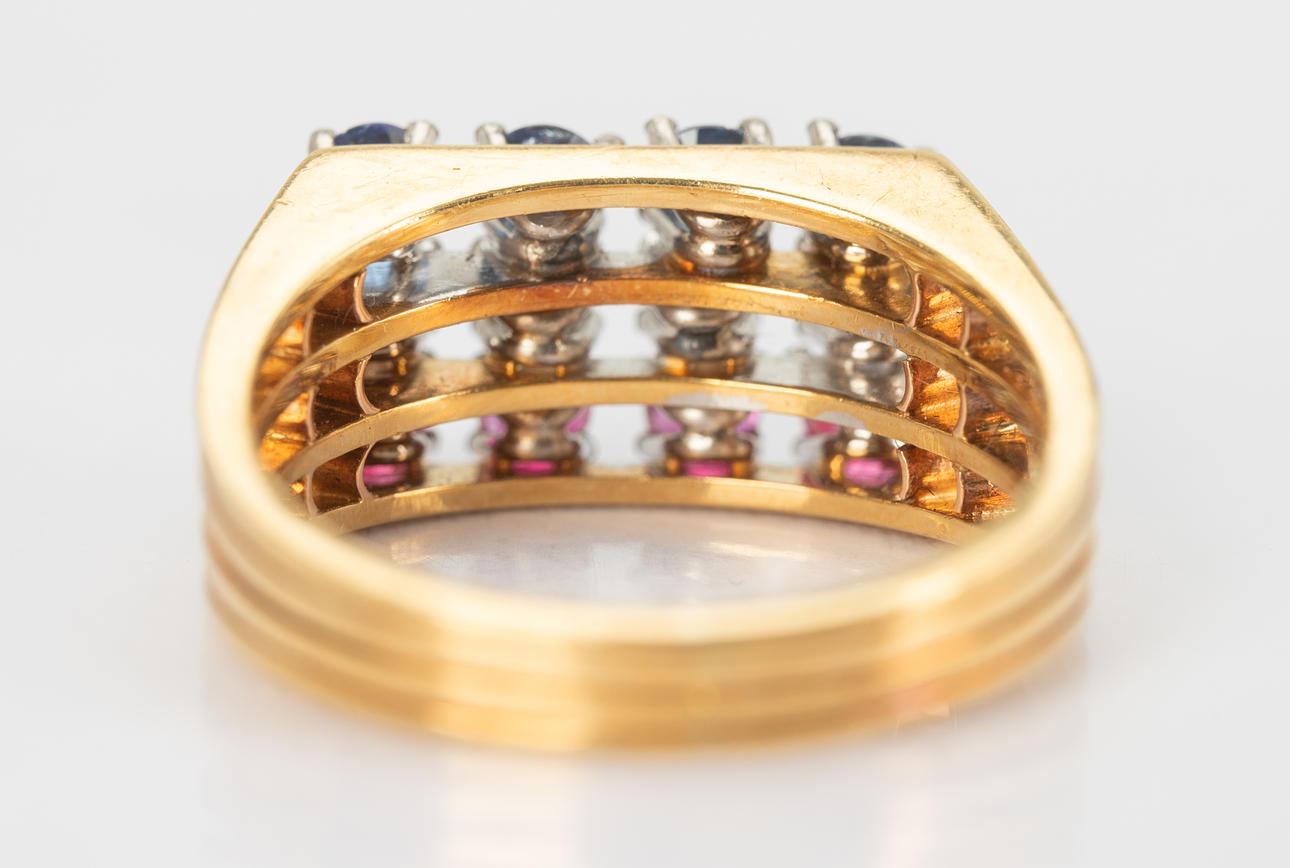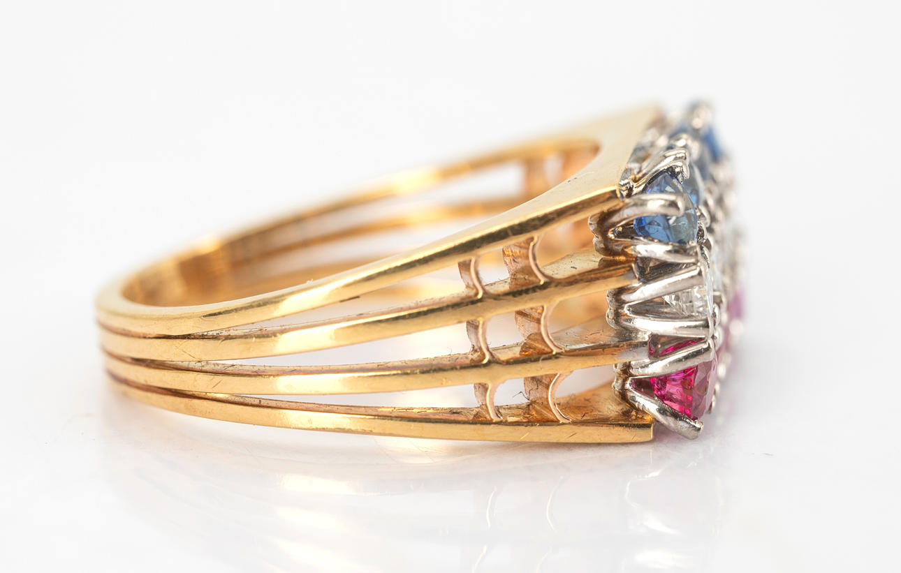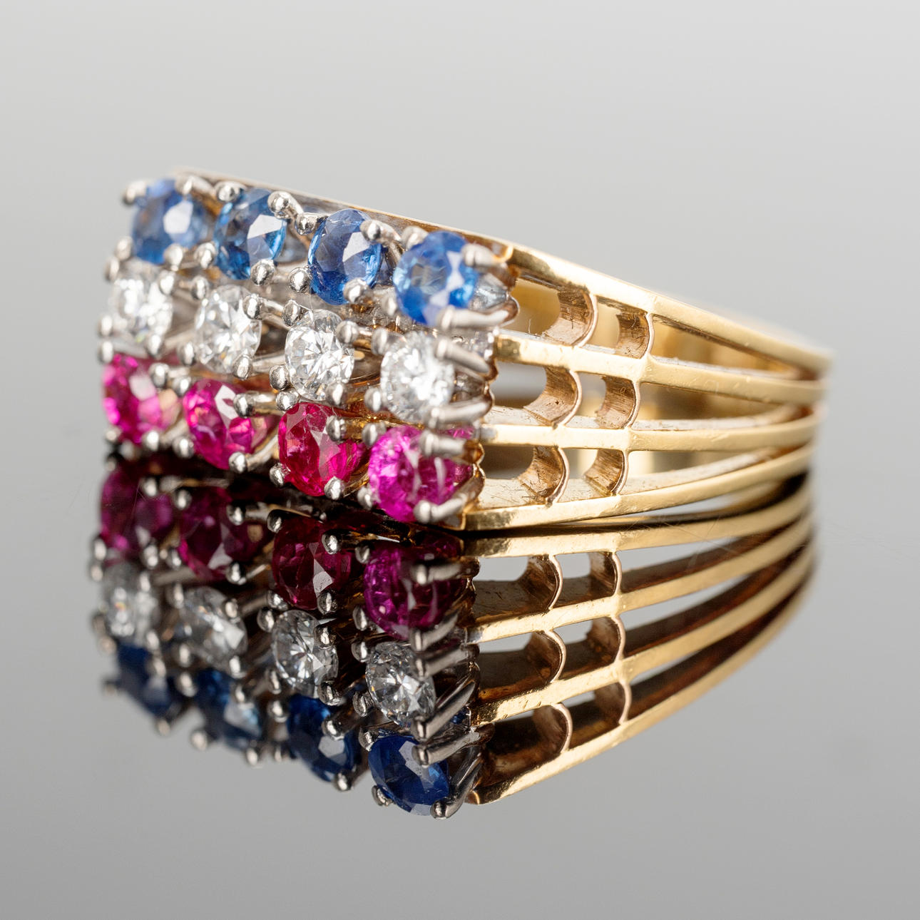 Ring made of 750 gold, set with rubies, sapphires and diamonds from ca. 0.30 ct. Ring size approx. 57. Weight ca. 7.5 grams.