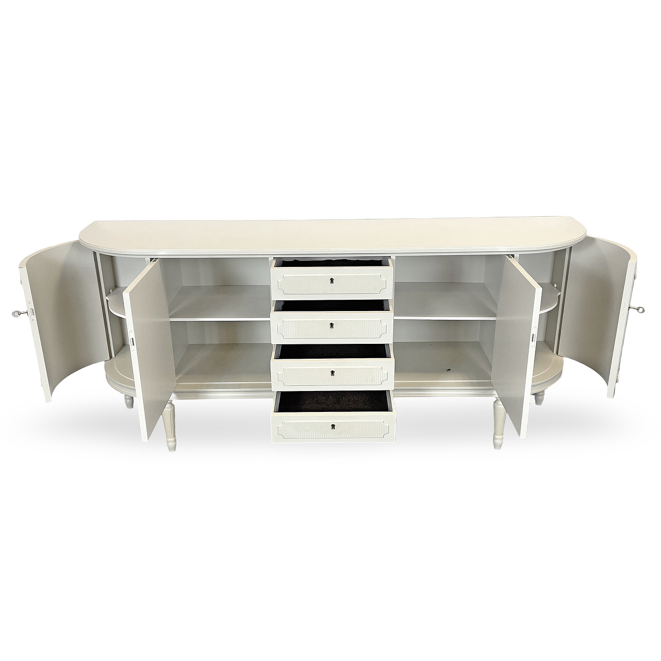 Sideboard 4 cabinet doors with back shelves and 4 drawers, Cut decor, Height ca 80,5 cm, Width ca 185 cm, depth ca 43 5 cm. Key is available.