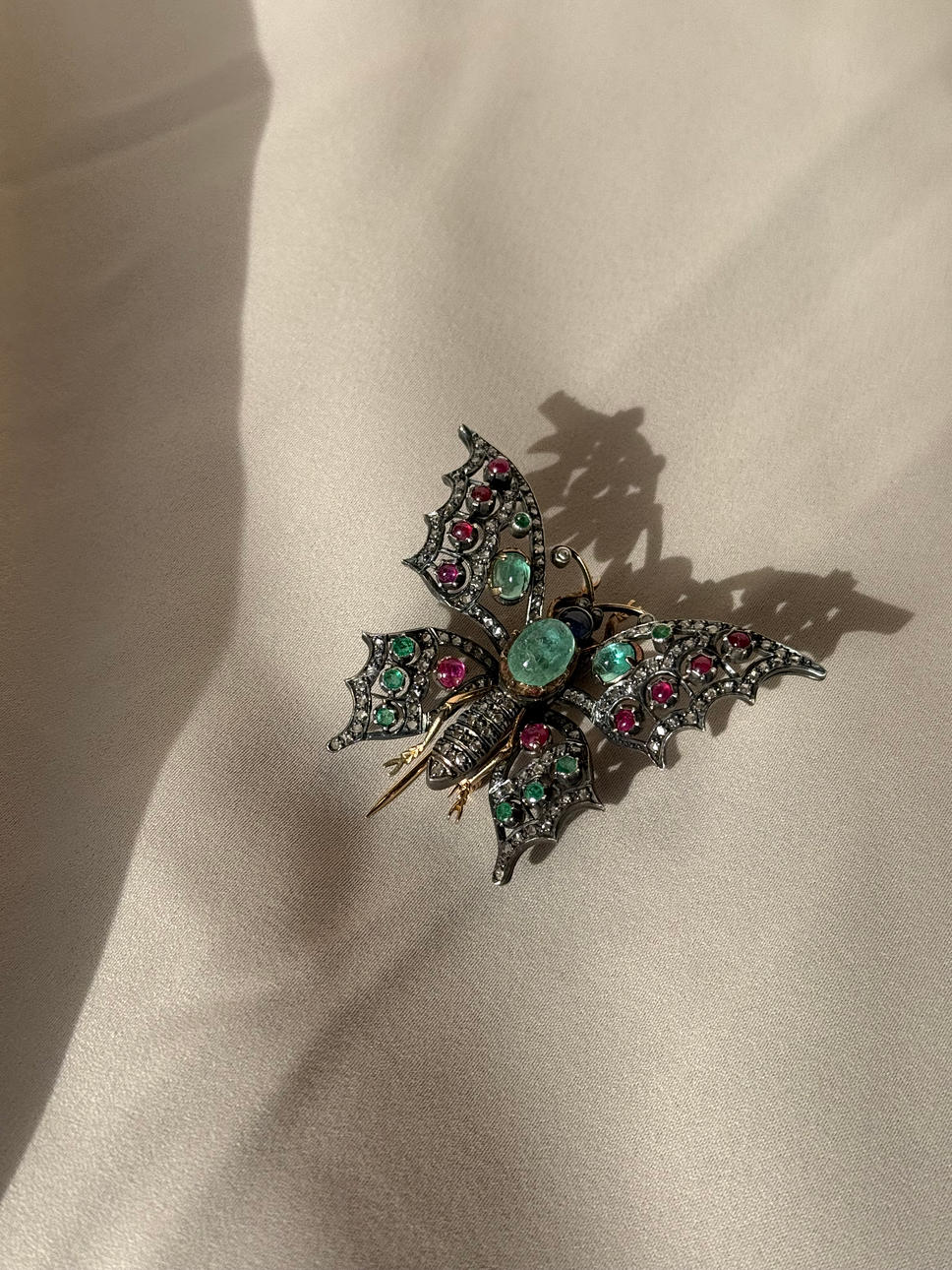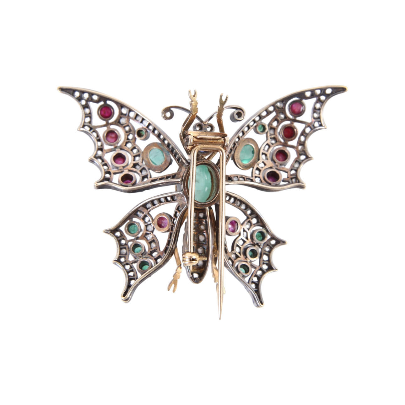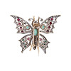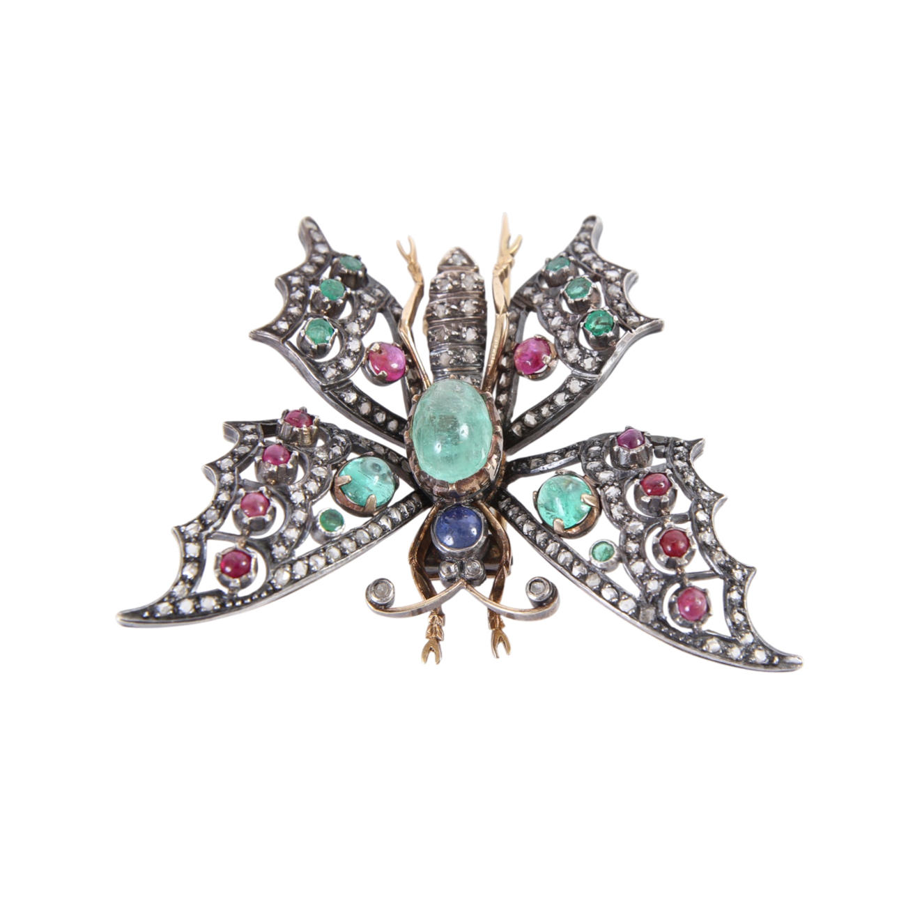 Brooch of silver and 18 kt gold, shaped like a butterfly, adorned with cabochon-cut rubies and sapphires.