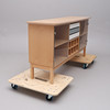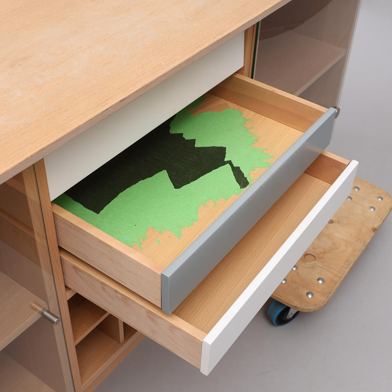 Two glass cabinet doors with rear shelves and lighting, three pull-out drawers and eight square compartments. Acquired in Denmark in the 1990s.