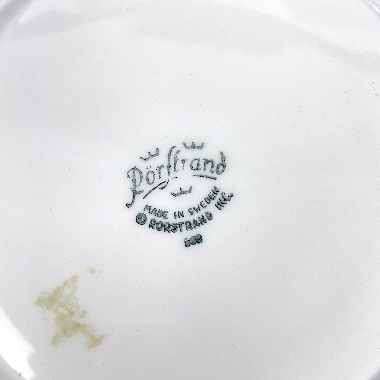 Minor wear and tear. A minimal notch at the mouth of the teapot. A platter of cutlery crayons and stains. A plate with a crackle ring underneath.