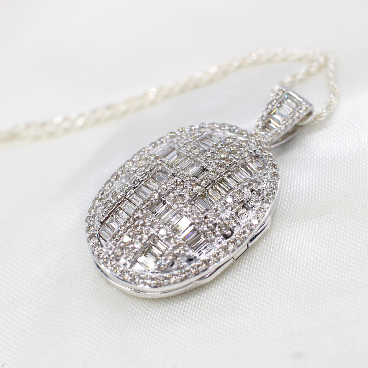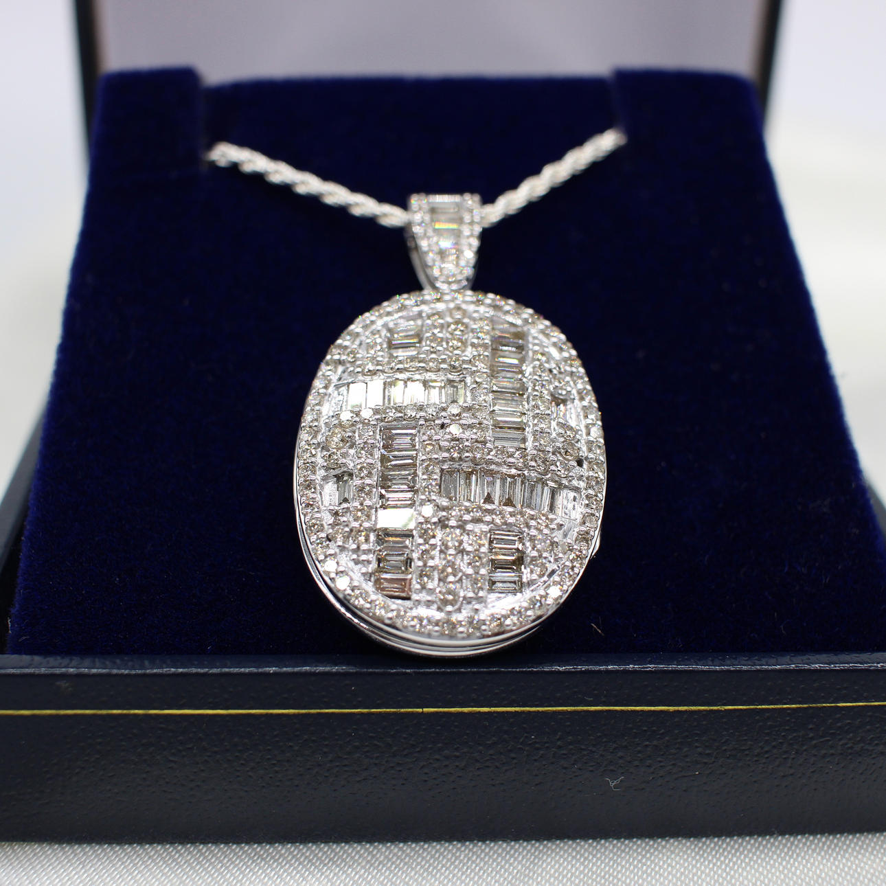This locket is set with round brilliant cut and baguette cut diamonds creating an impressive piece and keepsake for future owners or family.