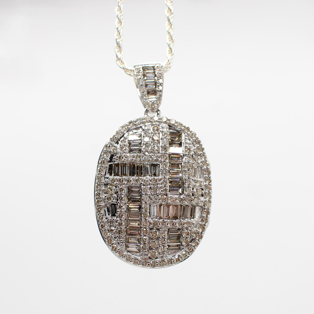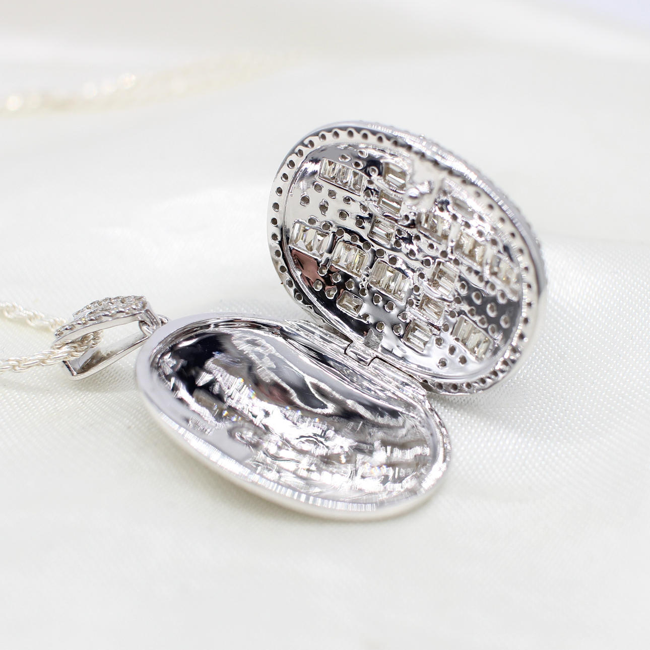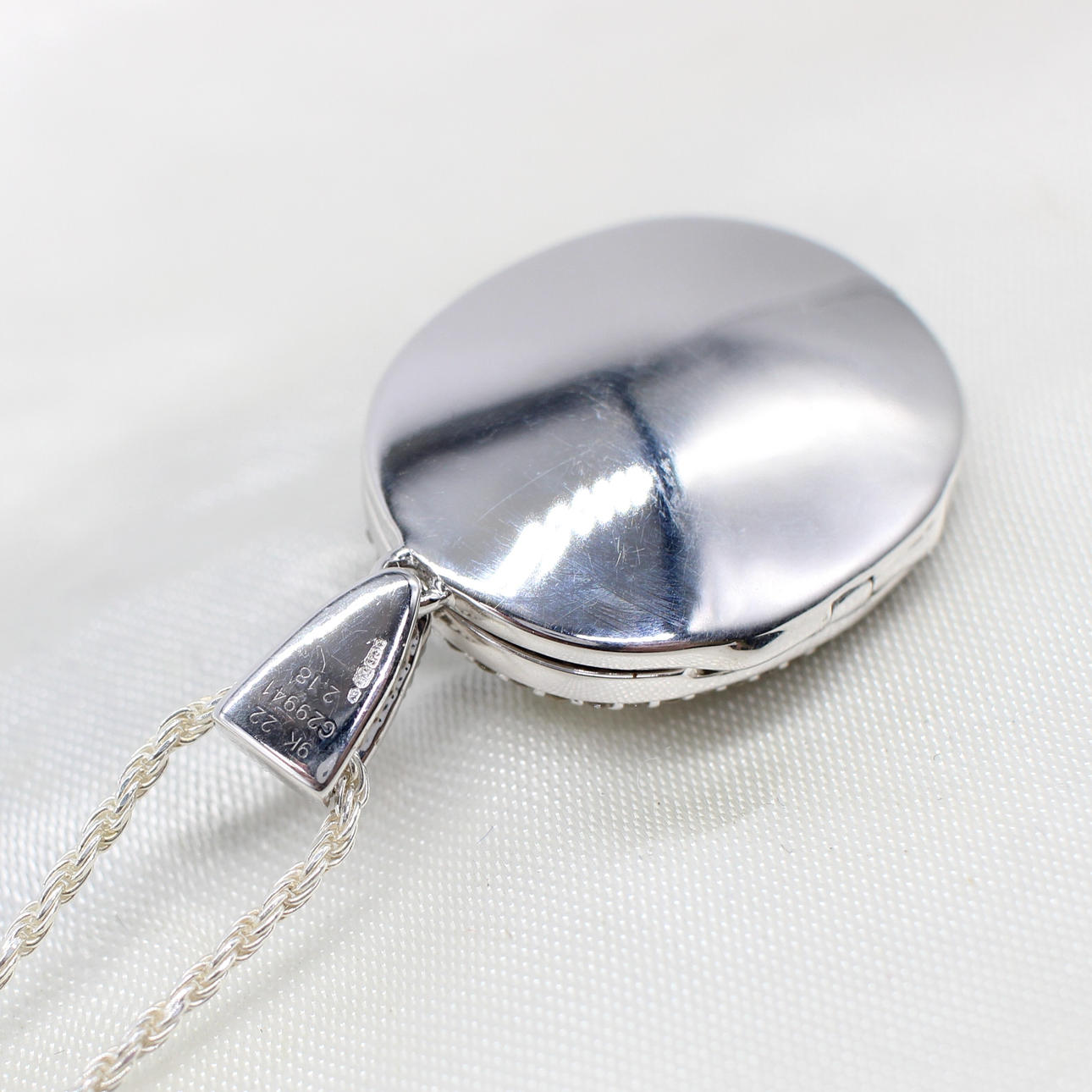The locket features a good sized, also diamond encrusted, bale should the wearer wish to change the chain. Currently a rope style silver (stamped 925) chain is fitted.