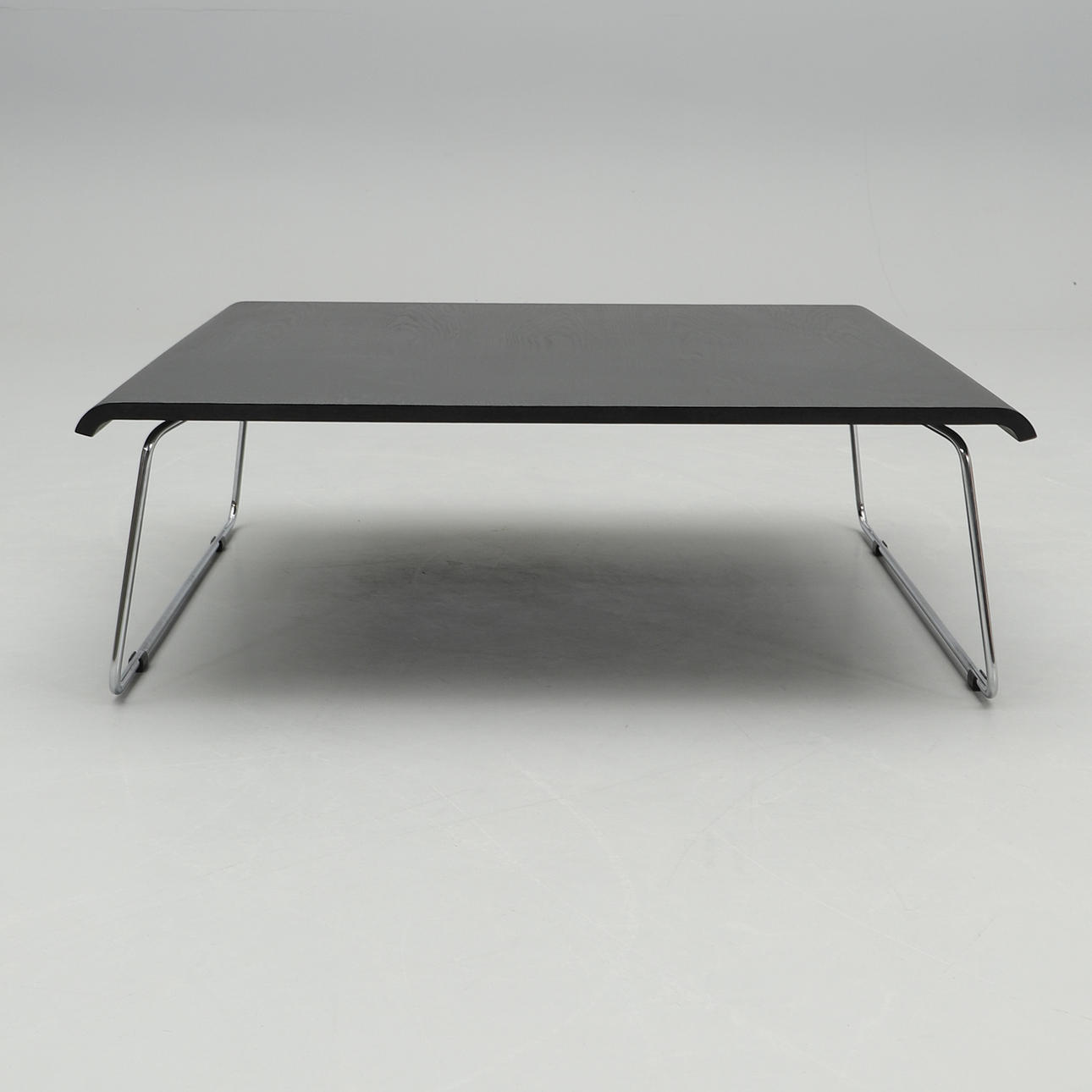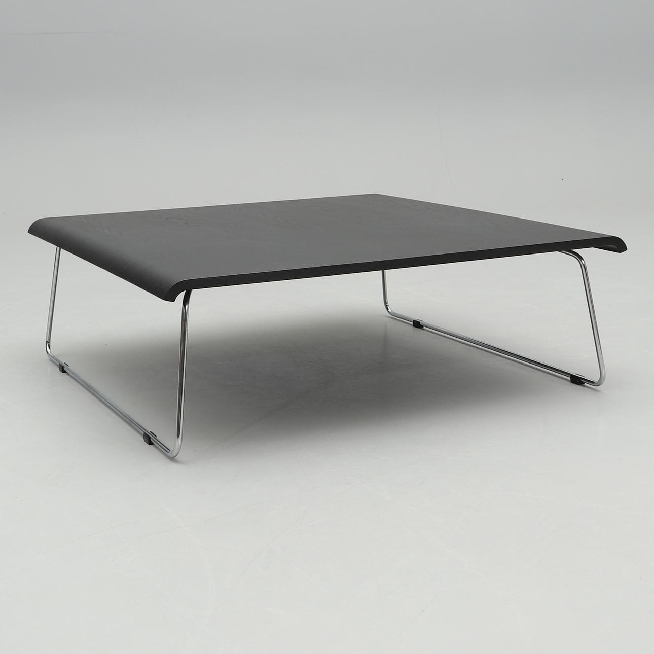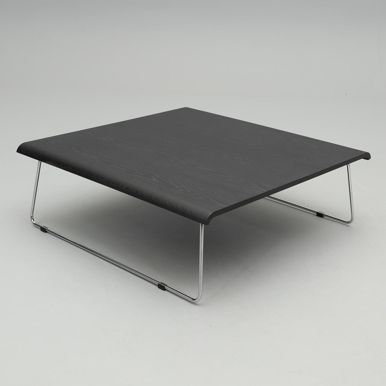 Black stained oak veneer. Chrome-plated steel undercarriage. Dimensions 100 x 100 cm, height 34 cm.