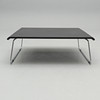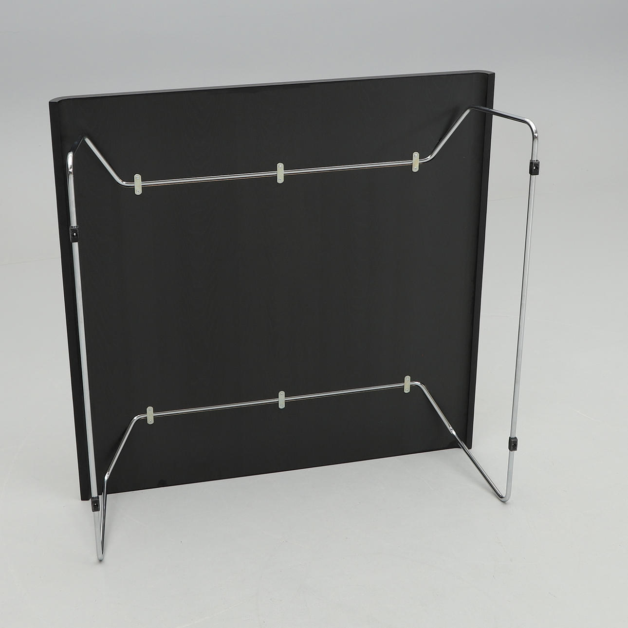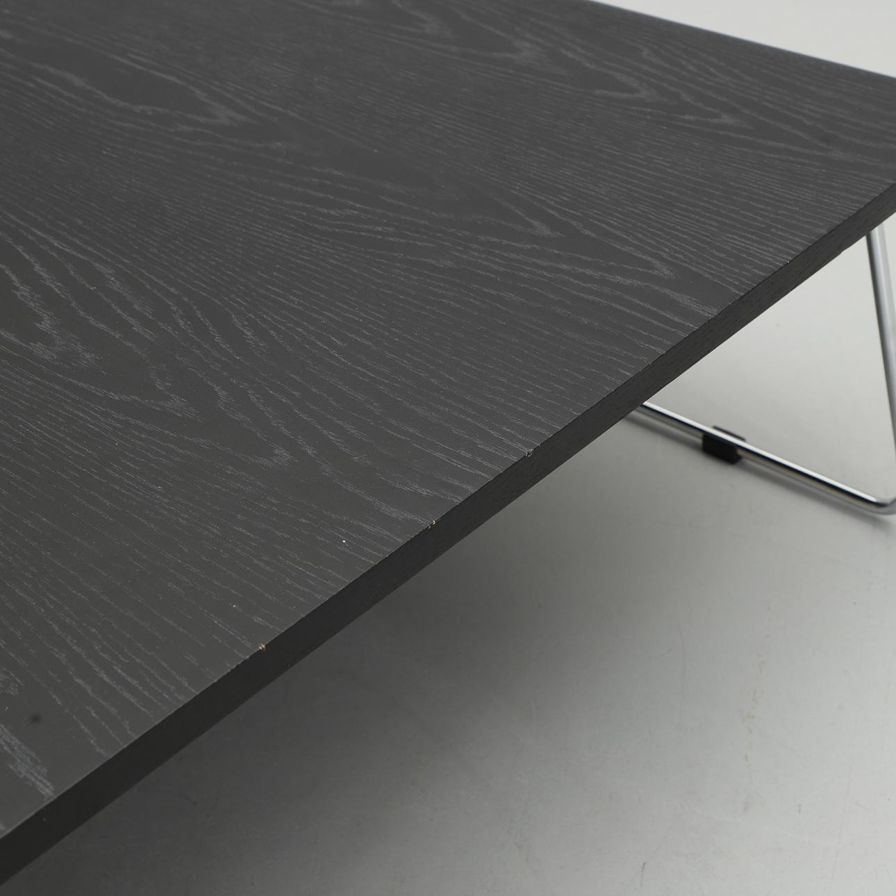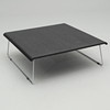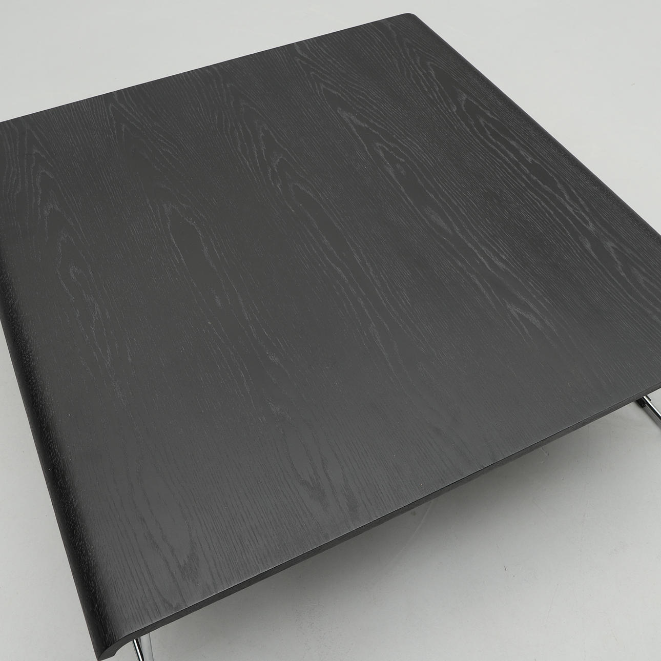 Black stained oak veneer. Chrome-plated steel undercarriage. Dimensions 100 x 100 cm, height 34 cm.