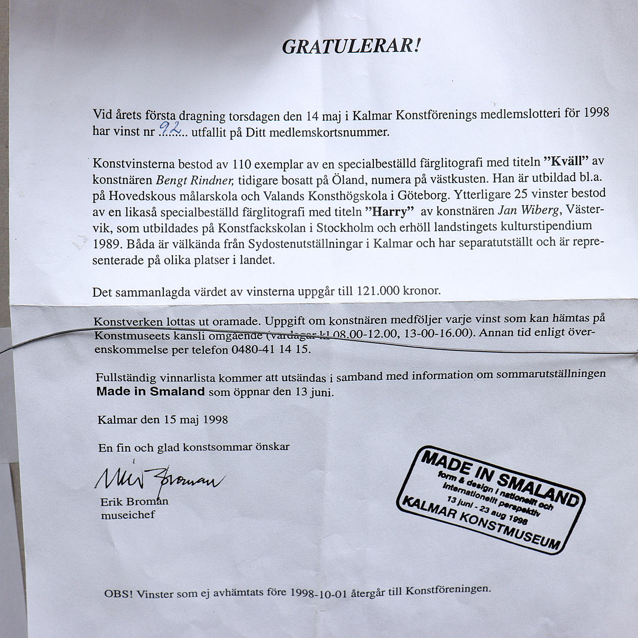 BENGT RINDNER “EVENING” LITHOGRAPH 46/260, SIGNED, DATED.