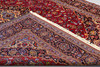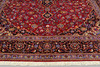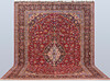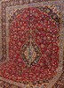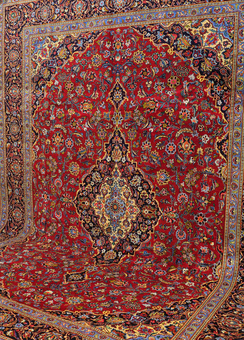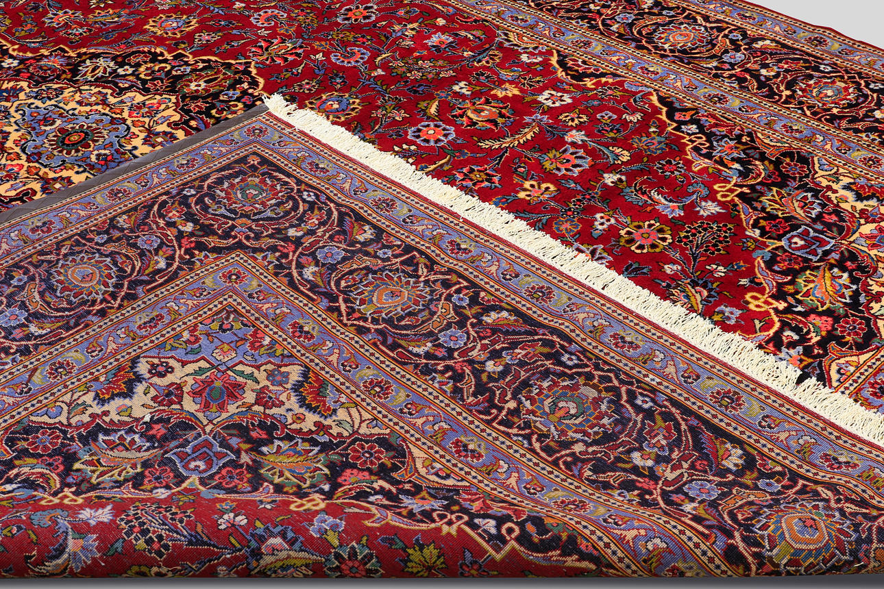 Keshan with a red base color and a centrally placed medallion in blue and beige, as well as clear details in green and pink. The center field is covered in floral ornamentation, palmettes and arabesques in similar shades, and the corner portions follow the same color scheme as the medallion. The border has a dark bottom and decor of palm branches. The forelock is made of wool and the warp is of cotton.
