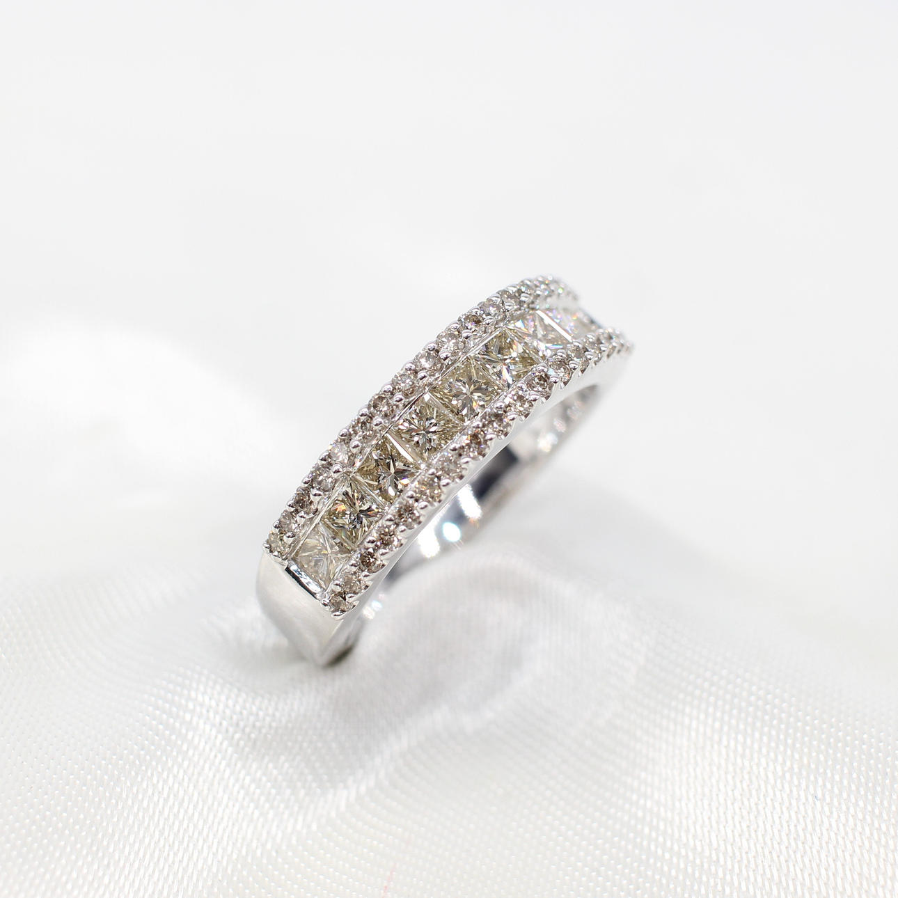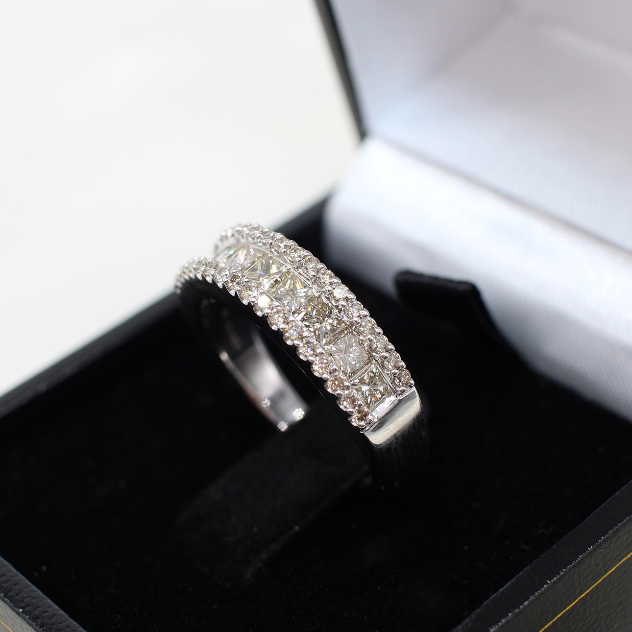 A 9k white gold (hallmarked) princess cut and round brilliant cut diamond set 1/2 eternity ring.