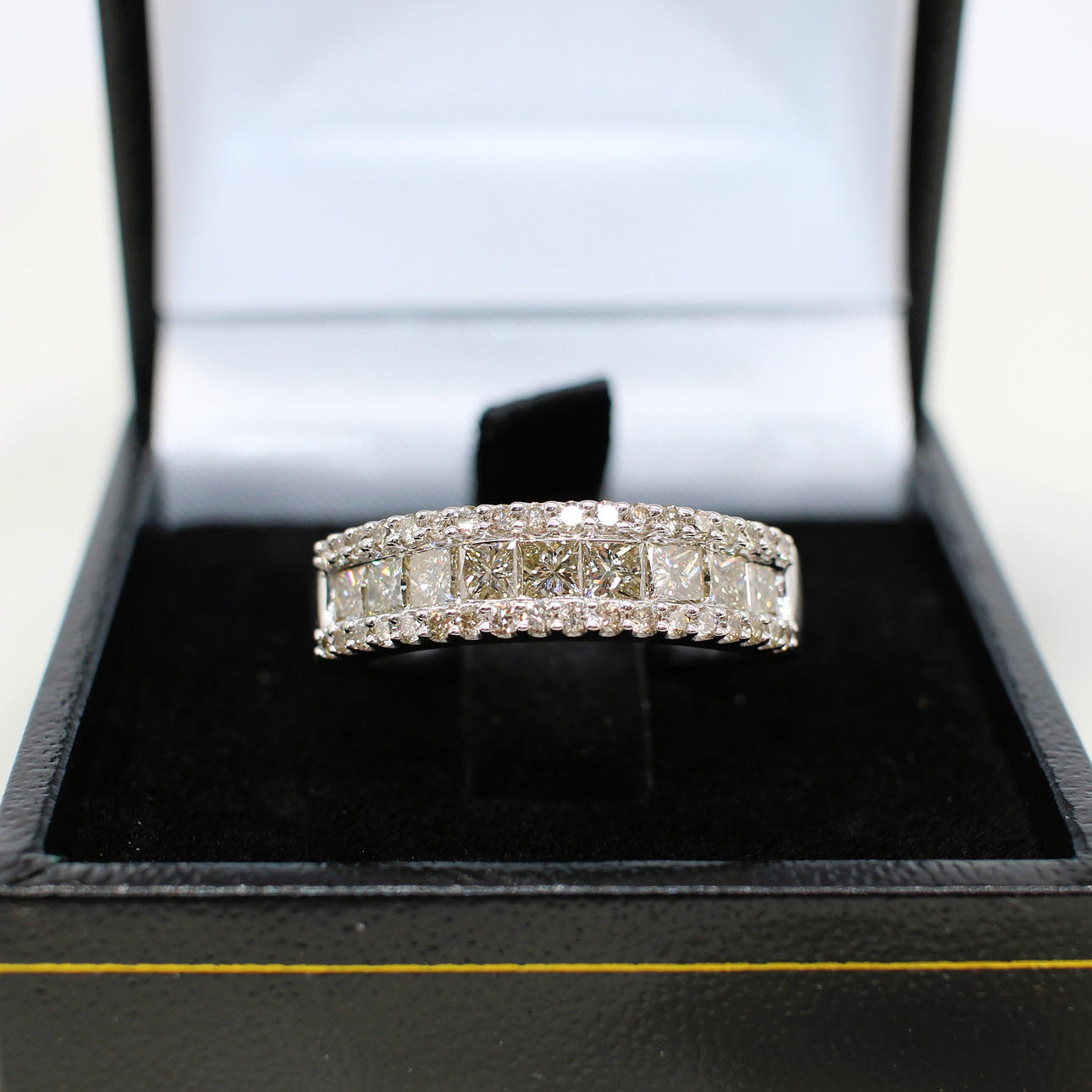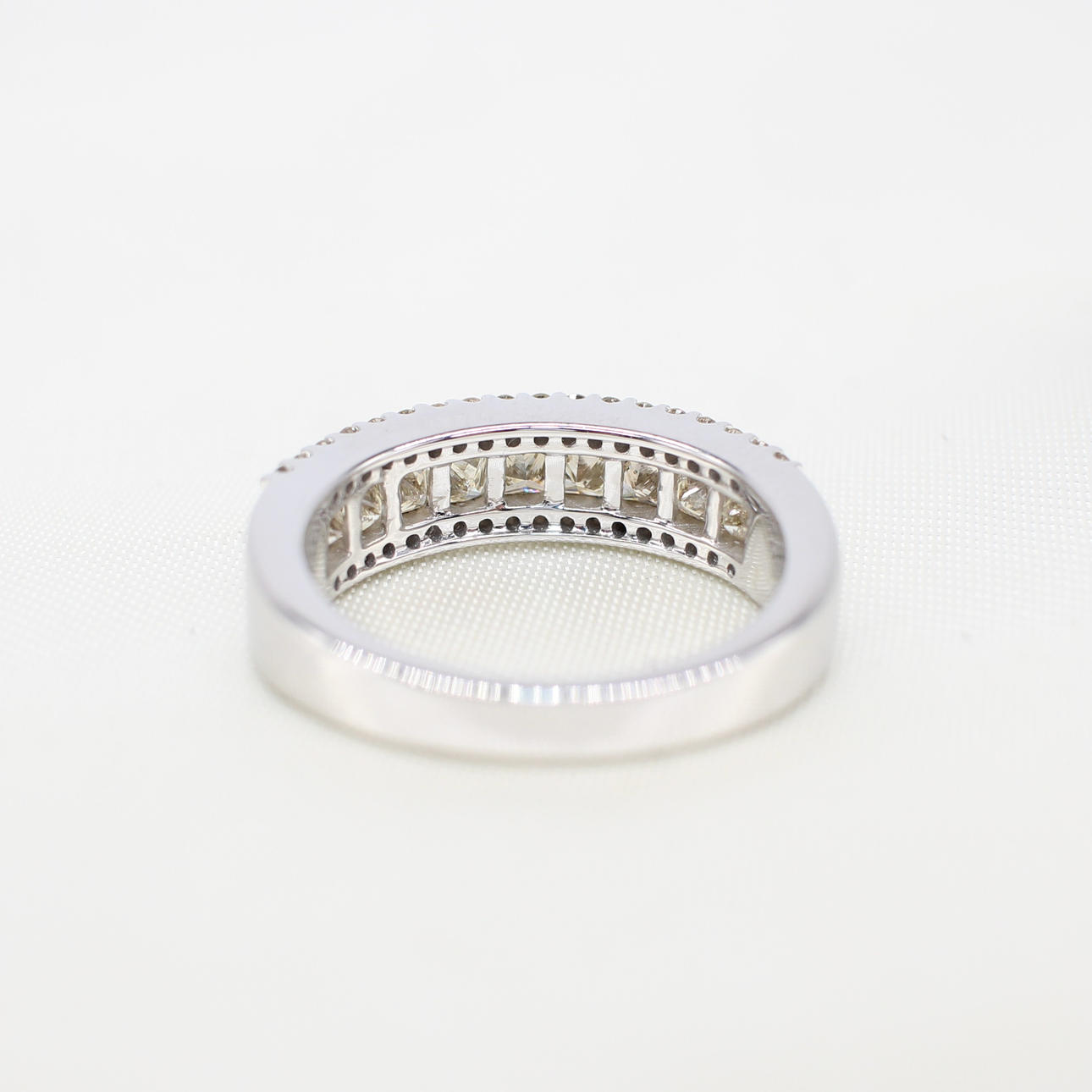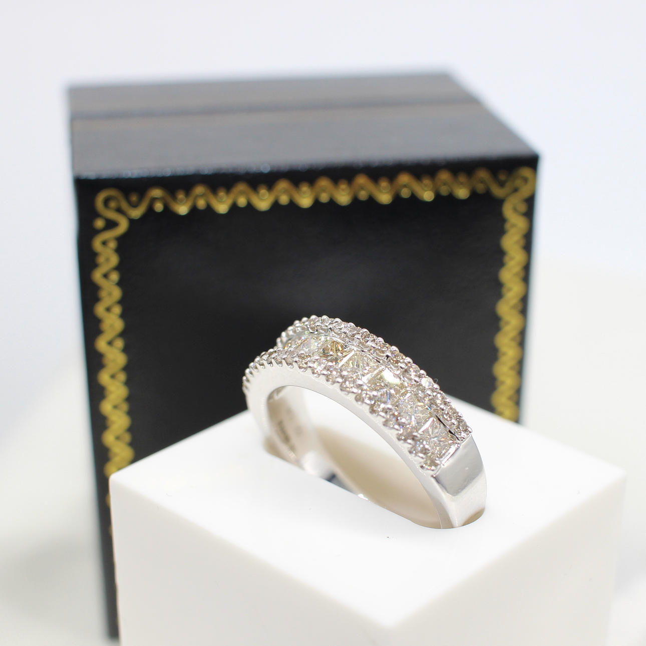 This fine quality eternity ring encompasses the channel set princess cut diamonds with the round brilliant cut diamonds claw set either side