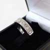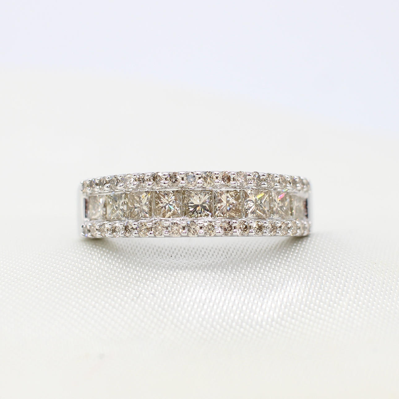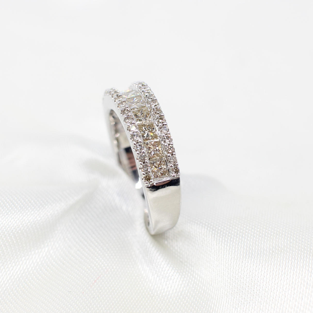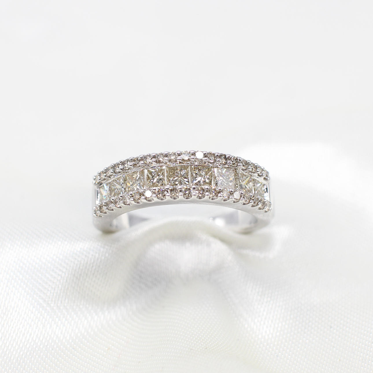 This fine quality eternity ring encompasses the channel set princess cut diamonds with the round brilliant cut diamonds claw set either side