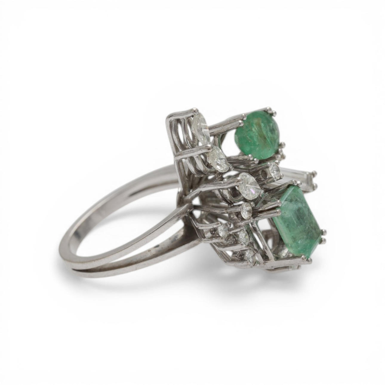 18K white gold, emerald and oval cut emeralds, approx. 1.90 cts, and brilliant, marquise and baguette cut diamonds, approx. 1 cts Size 13/53. 8 gr.