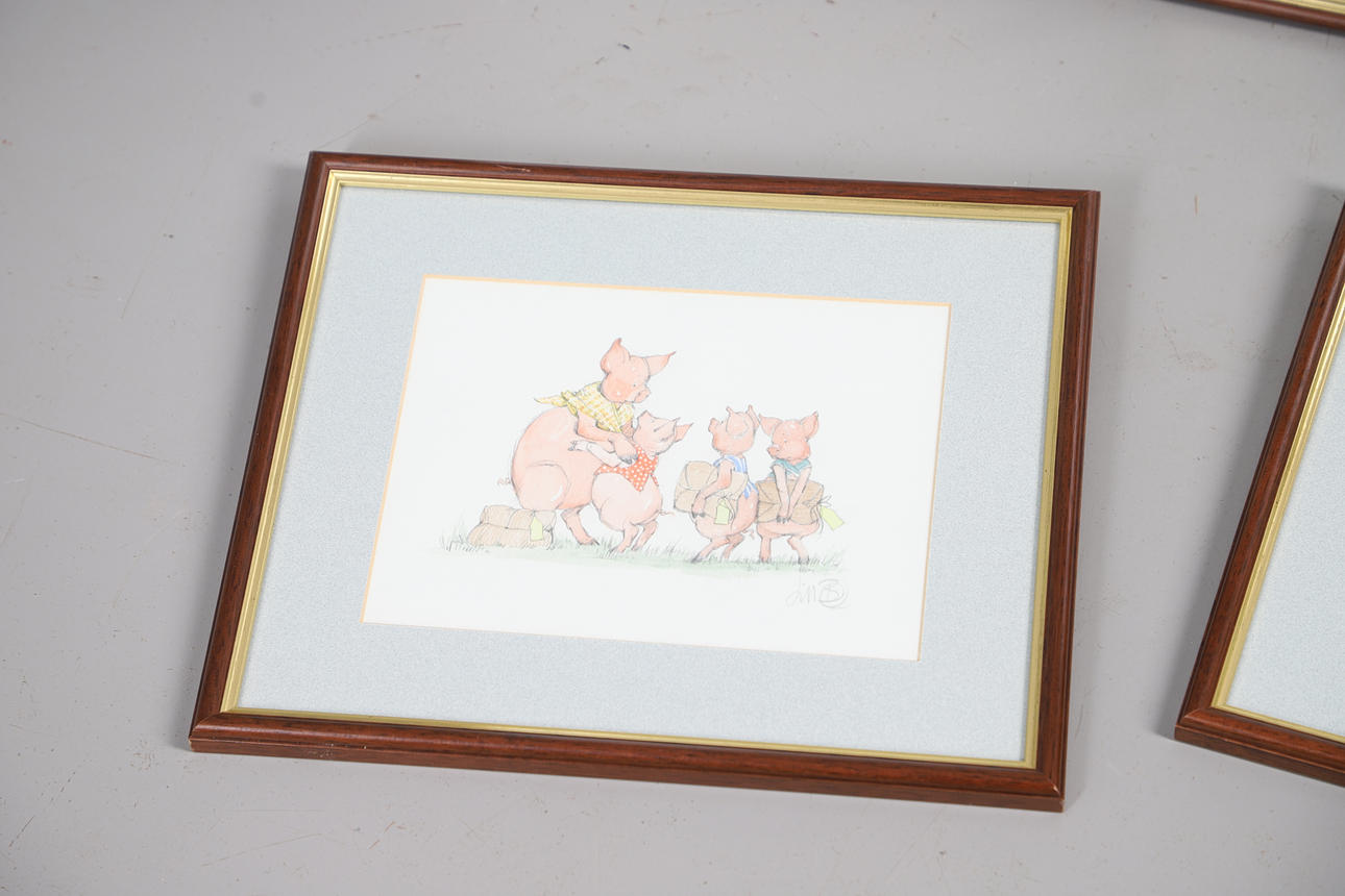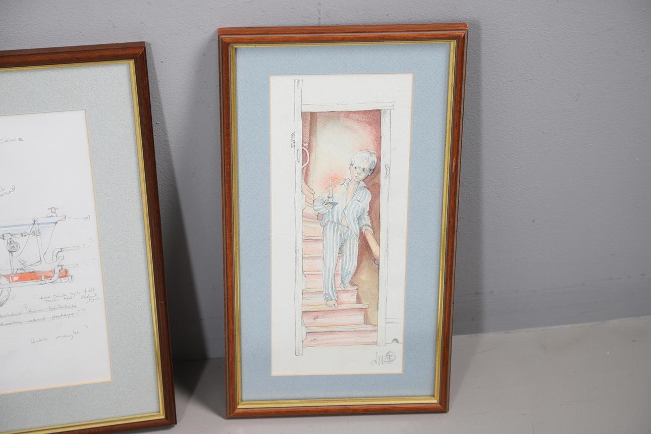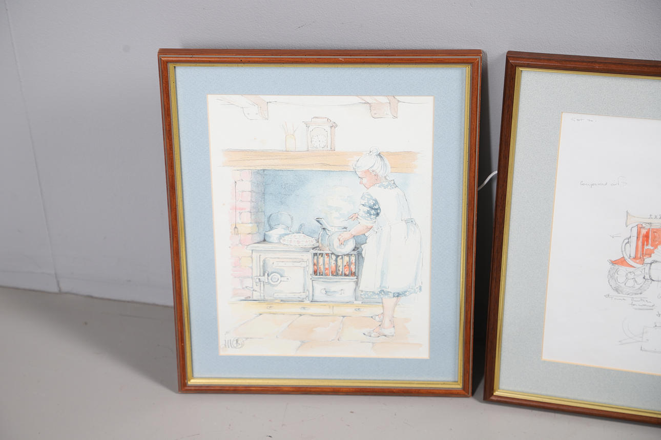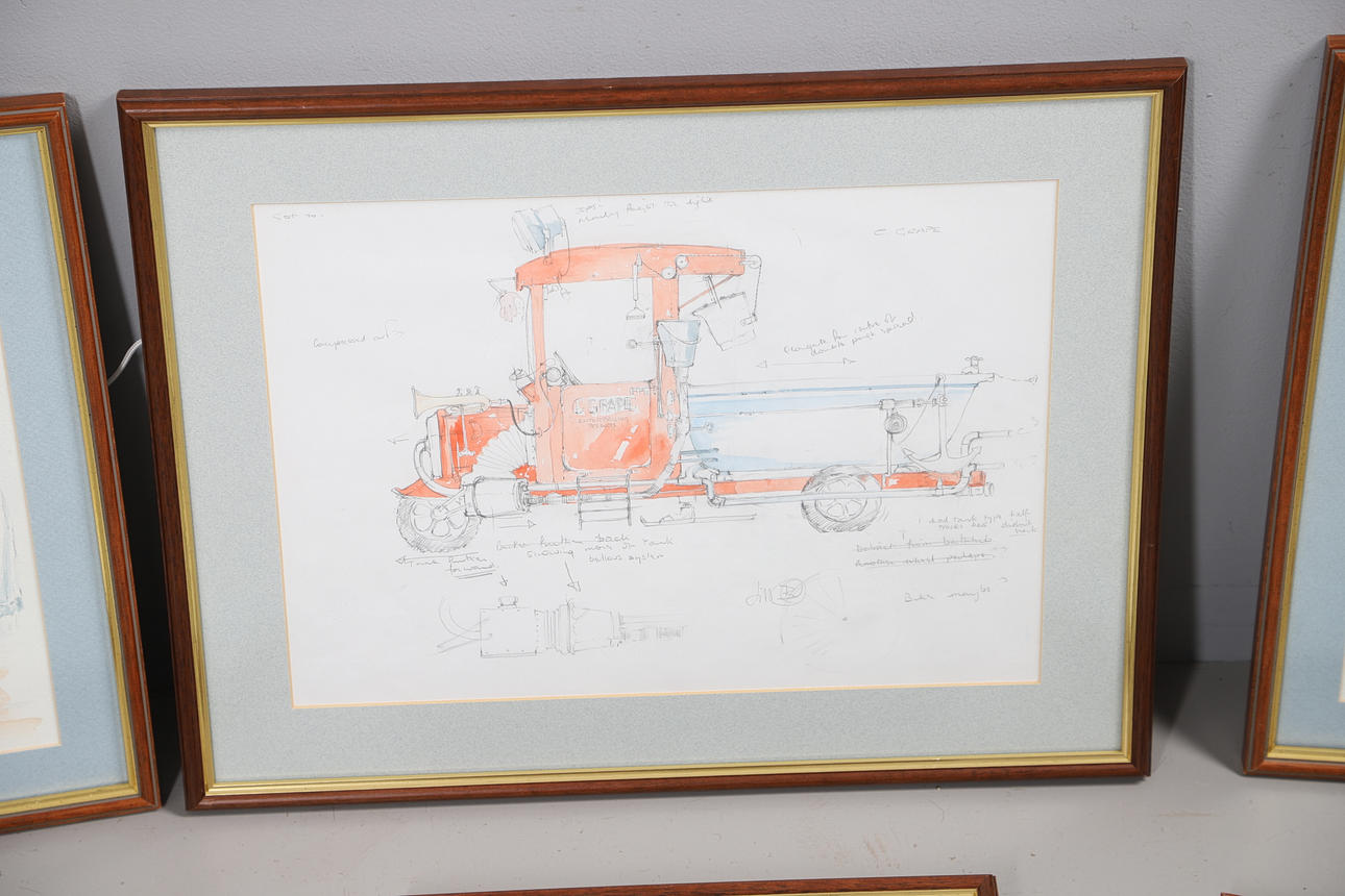 Each indistinctly initialed, pencil & watercolour sketches, the largest a study for C Grape Enterprising Products, 29cm x 40cm (42cm x 53cm including frame).
