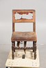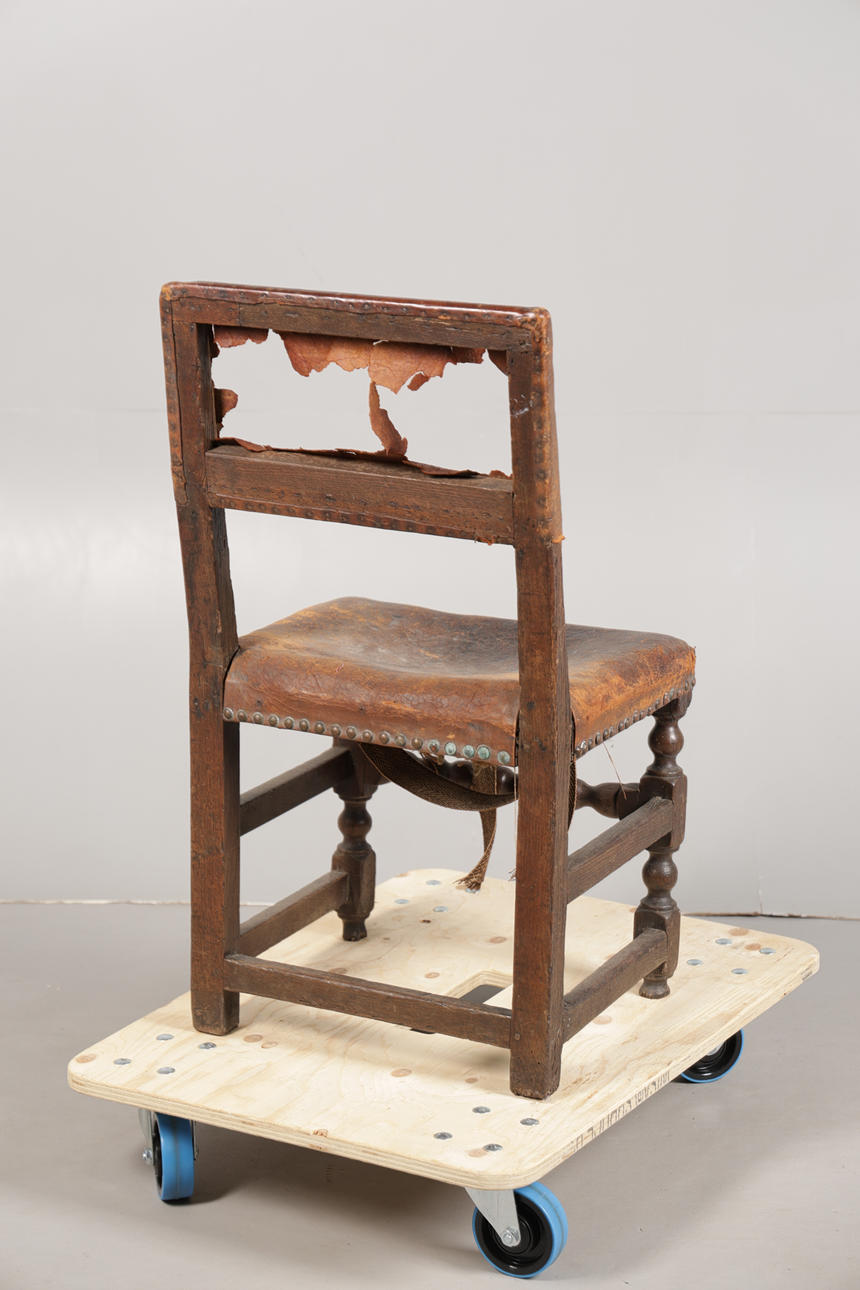 In very worn condition, leather has worn through in various places with little left to the back rest, chips and splits to frame.