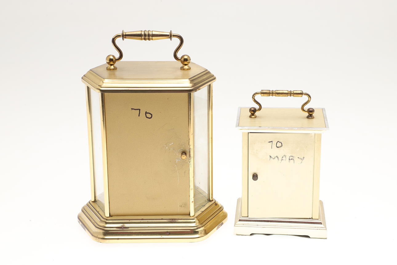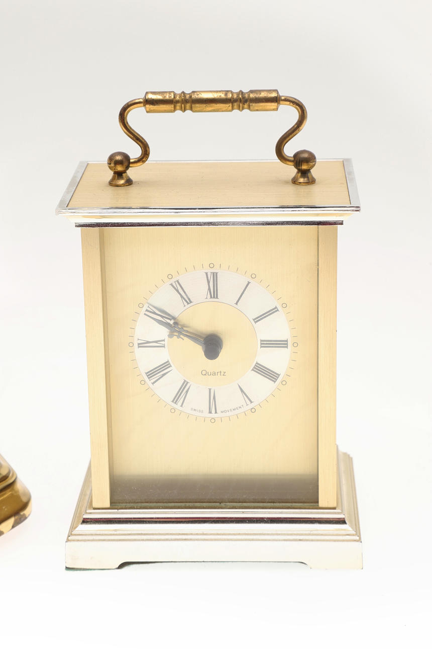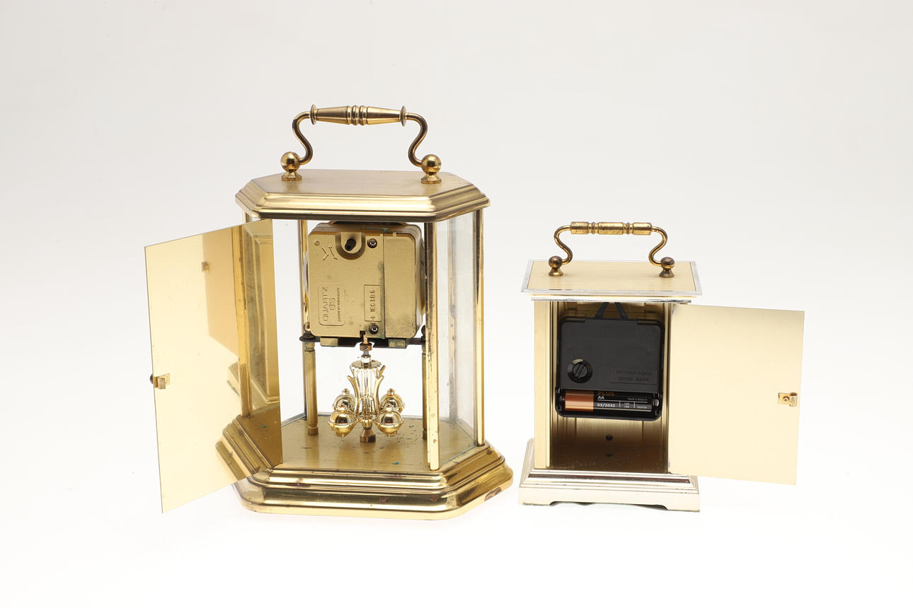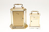 To include a German anniversary Acctim Quartz clock, 21cm (h) x 16.5cm x 11.5cm. Together with a Swiss movement Quartz carriage clock, 15cm (h) x 9.5cm (w) x 7cm (d). (2).