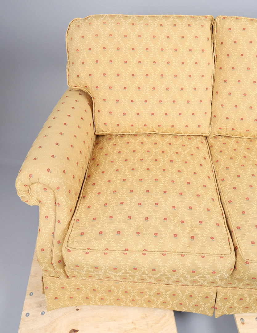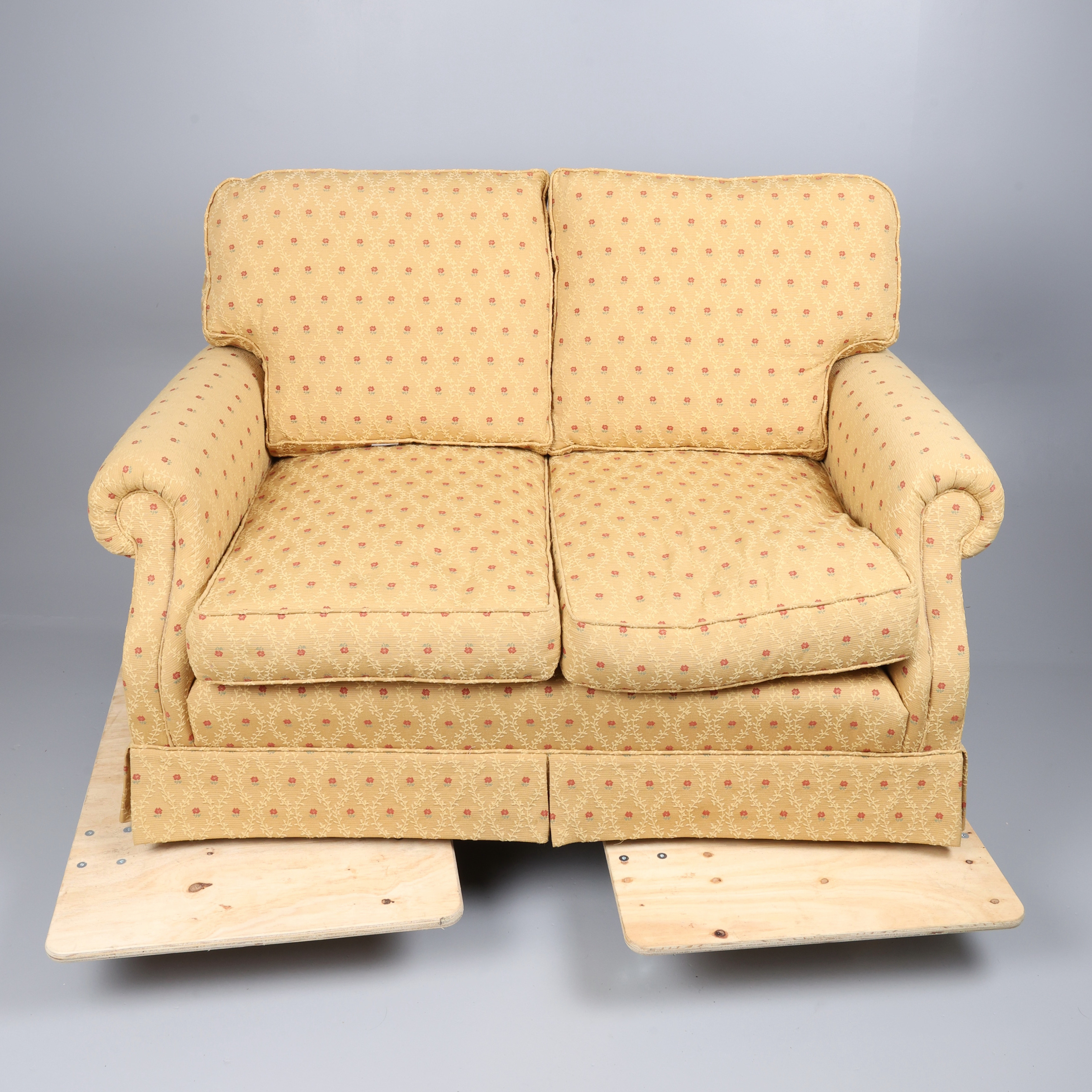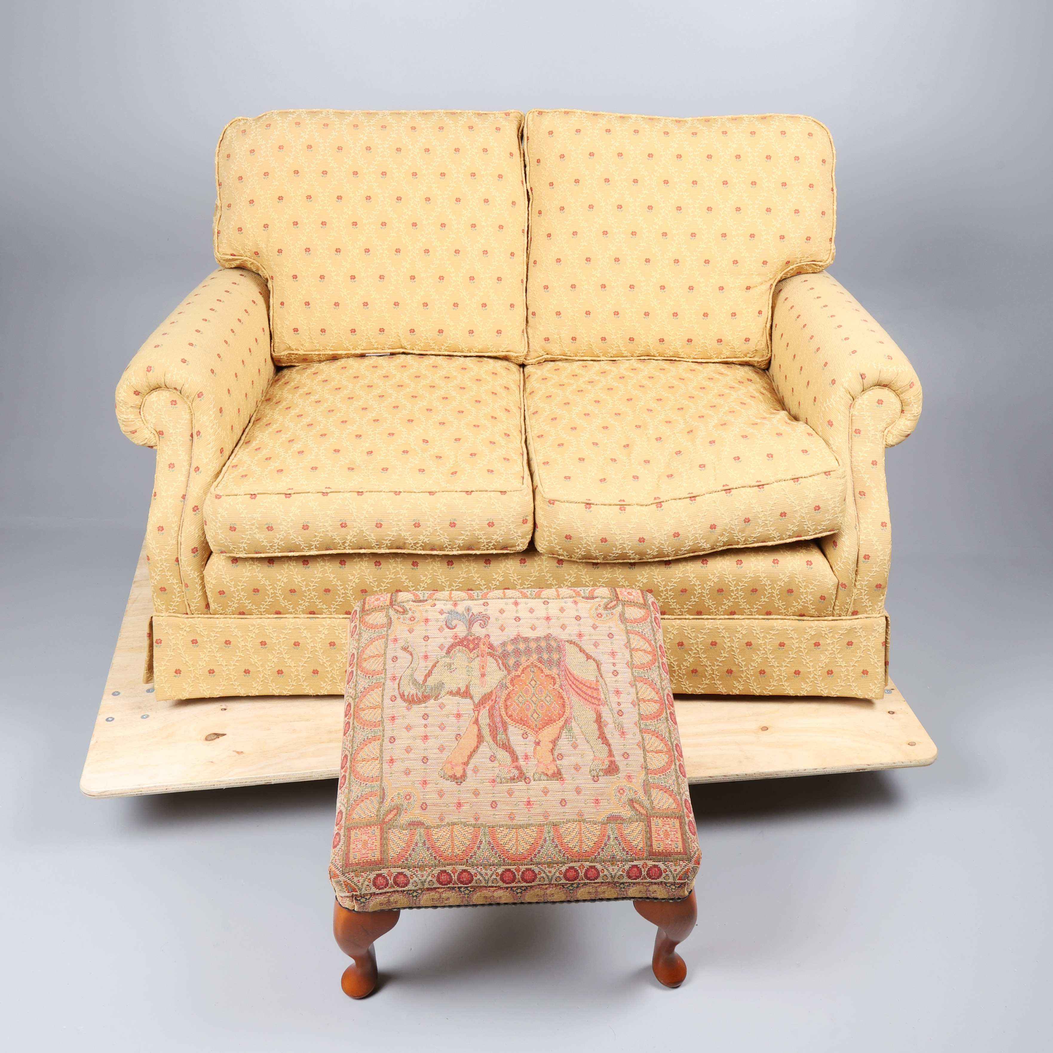 4935524. FABRIC TWO-SEATER SOFA AND A FOOTSTOOL. (2).