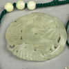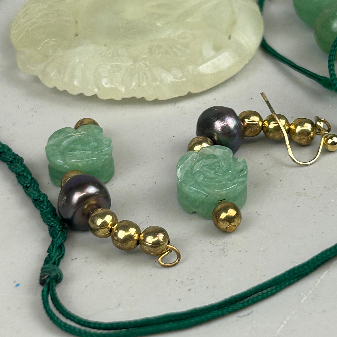 A group of Chinese jade items including carved jade and blue cultured pearl earrings. Disc diameter 5 cms.