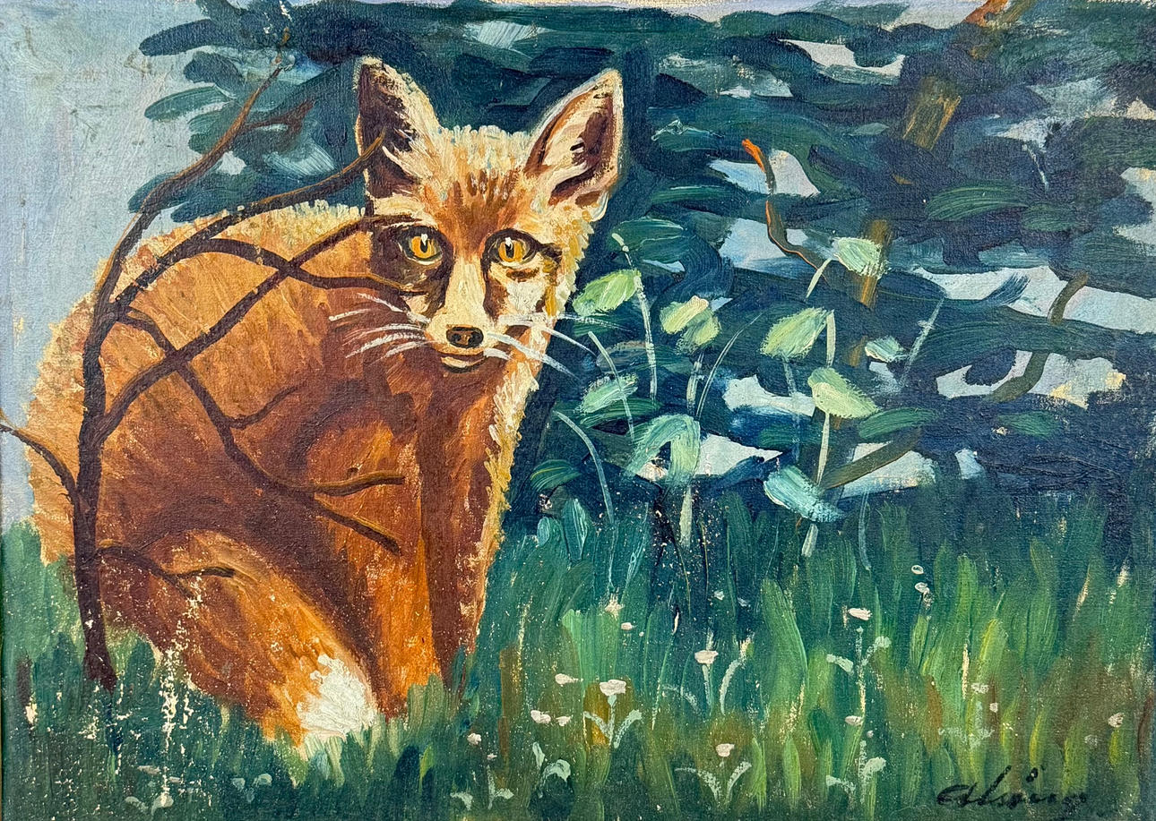 4936228. OIDENTIFIERAD KONSTNÄR. Fox cub, oil on canvas, signed Alsing.