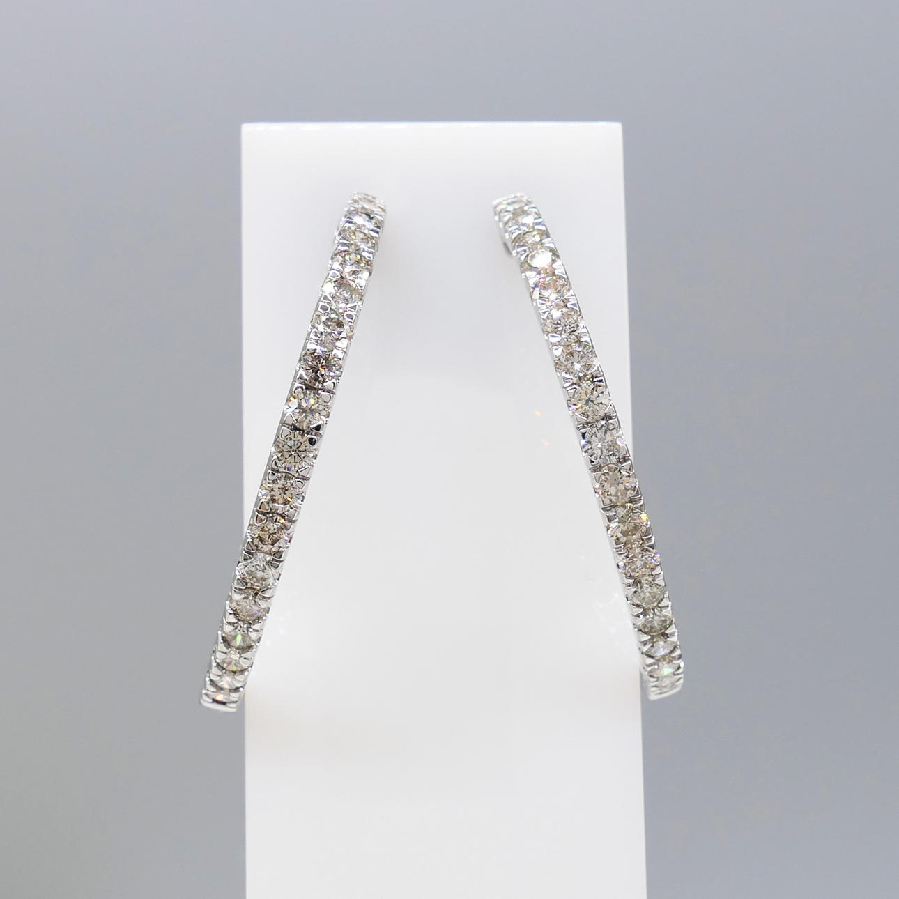 A pair of white gold large hoop earrings set with 5.00 cts round brilliant cut diamonds, with hinged gift box