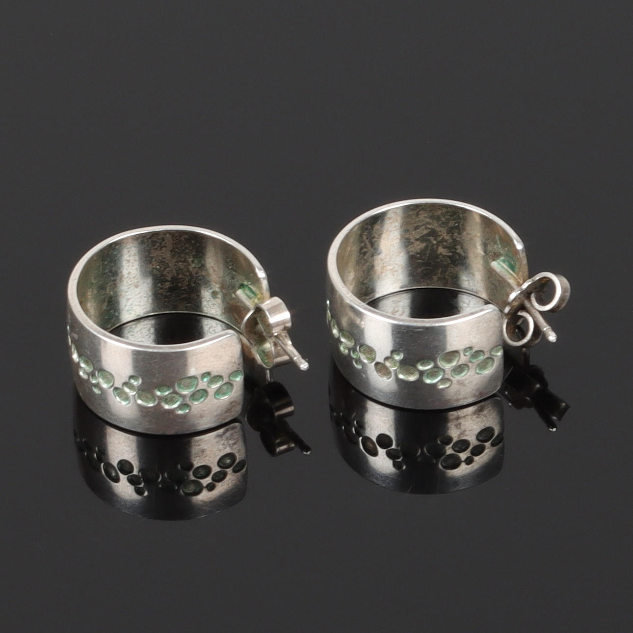 A pair of silver earrings.