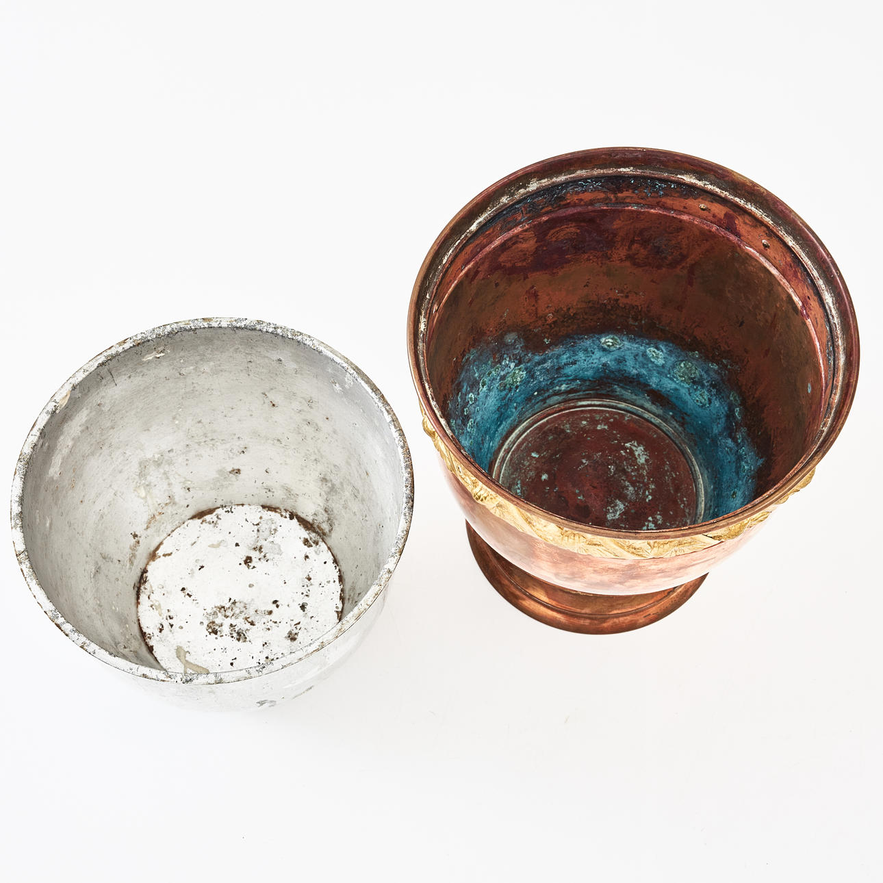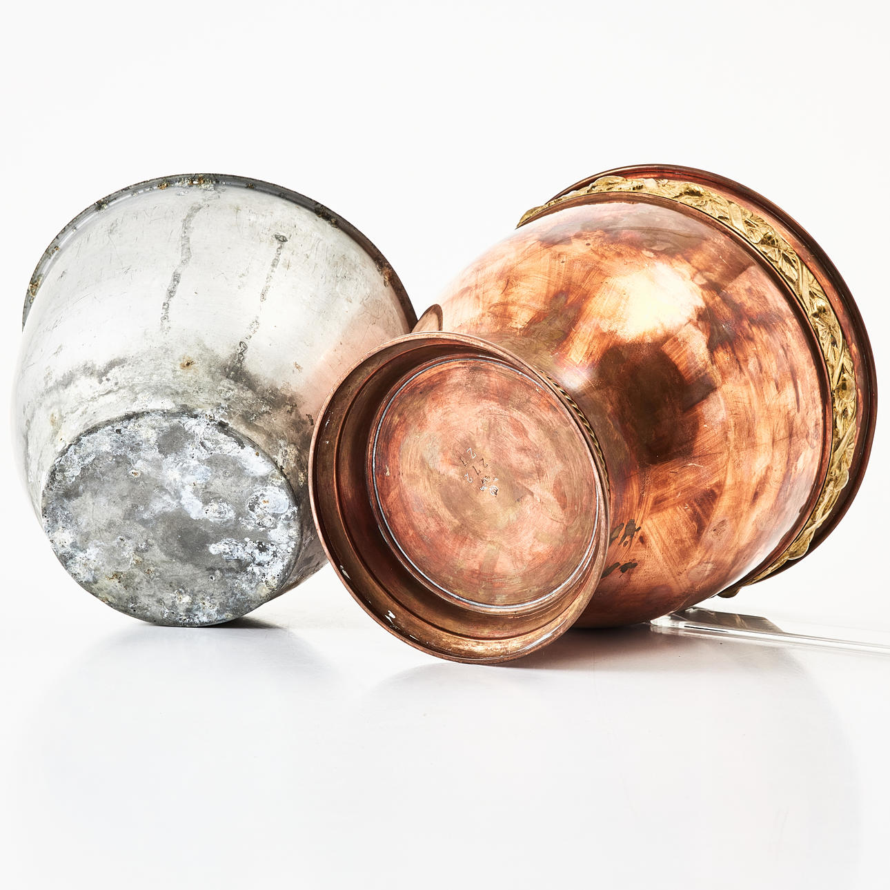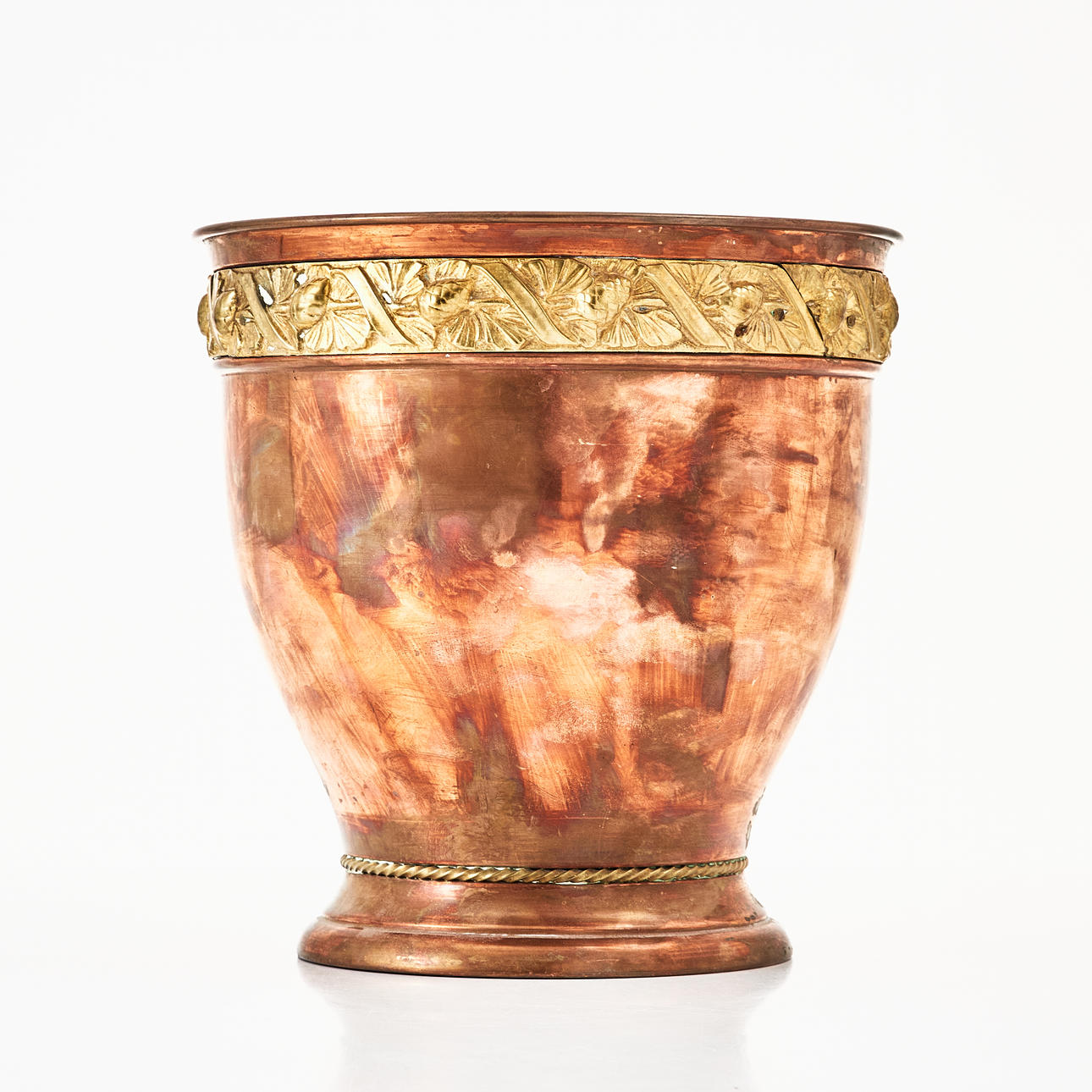 Copper and brass, late Art Nouveau, model 272, brass brim with relief decoration in the form of pine cones, enclosed inner bucket, height approx. 21x21 cm.