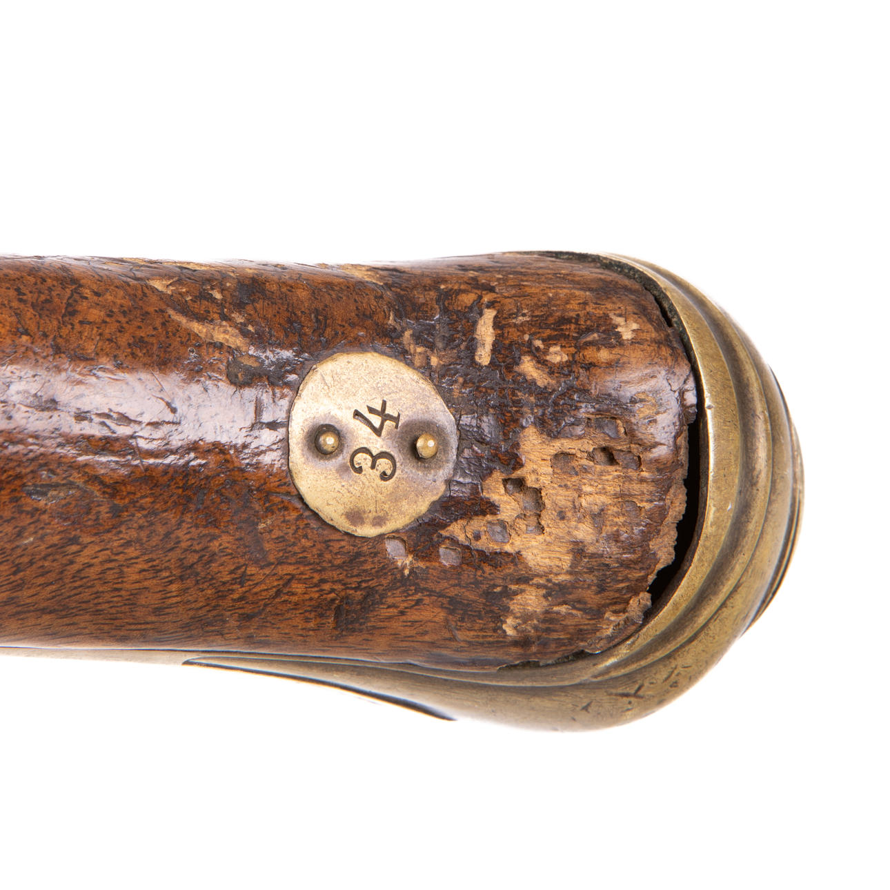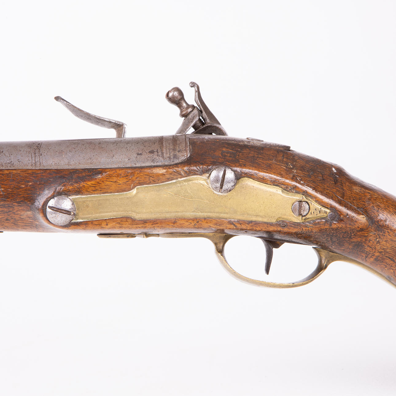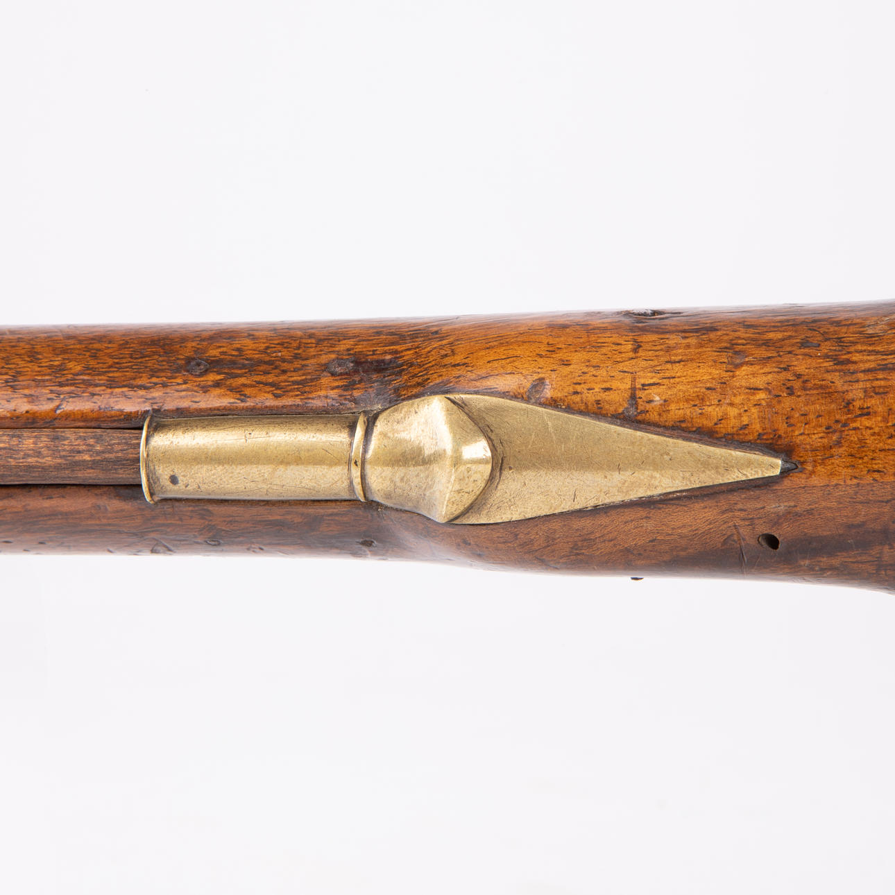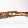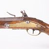 Walnut flask and brass fittings. Small stampings on barrel as well as arsenal tray on piston. Caliber 17,23mm. Length 48cm.