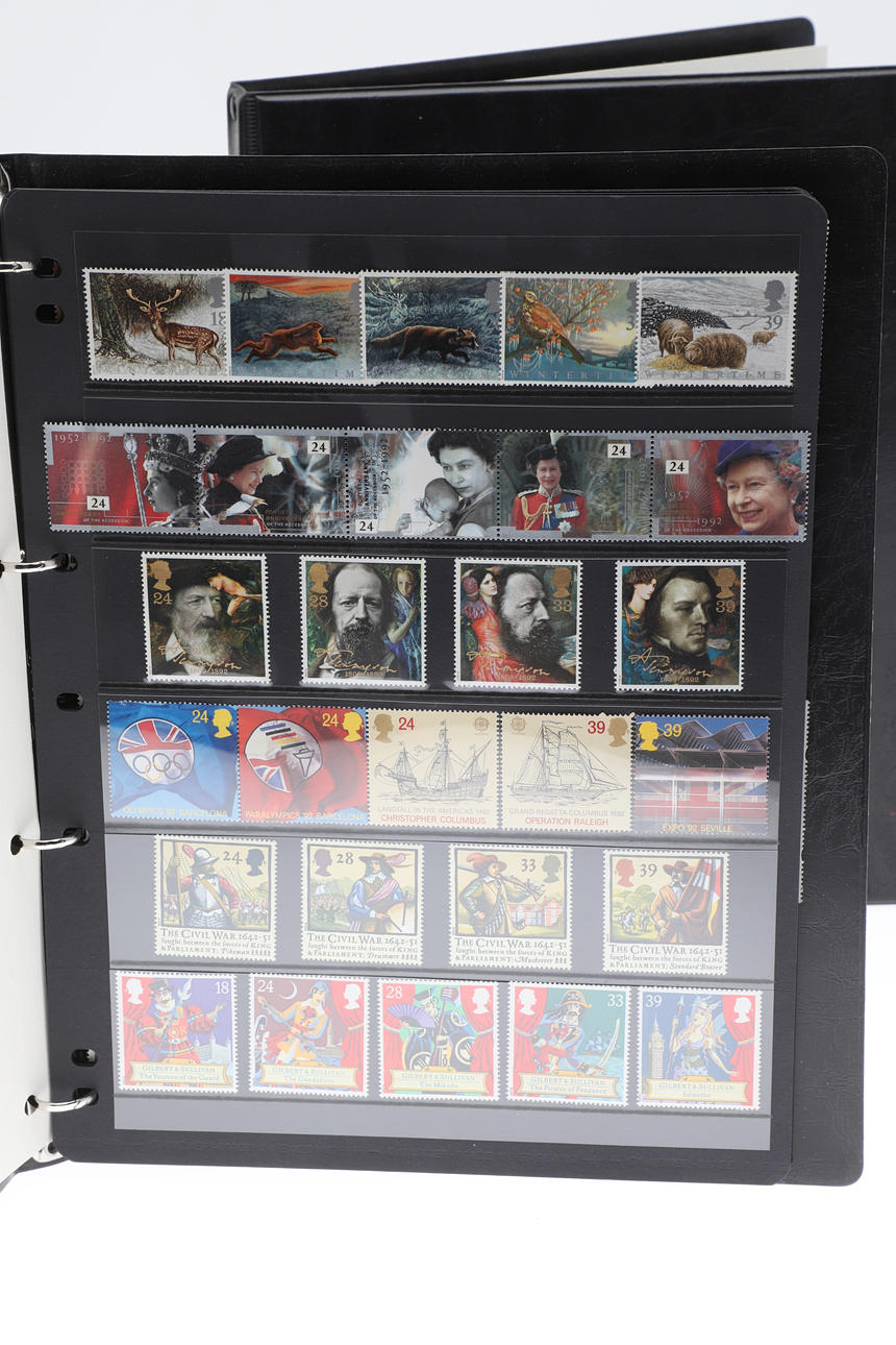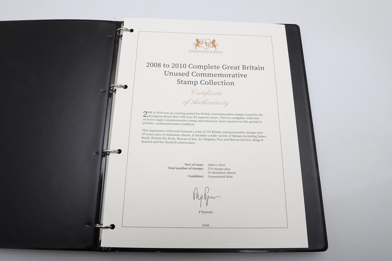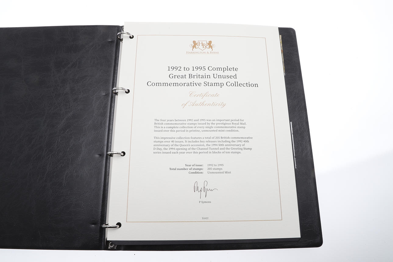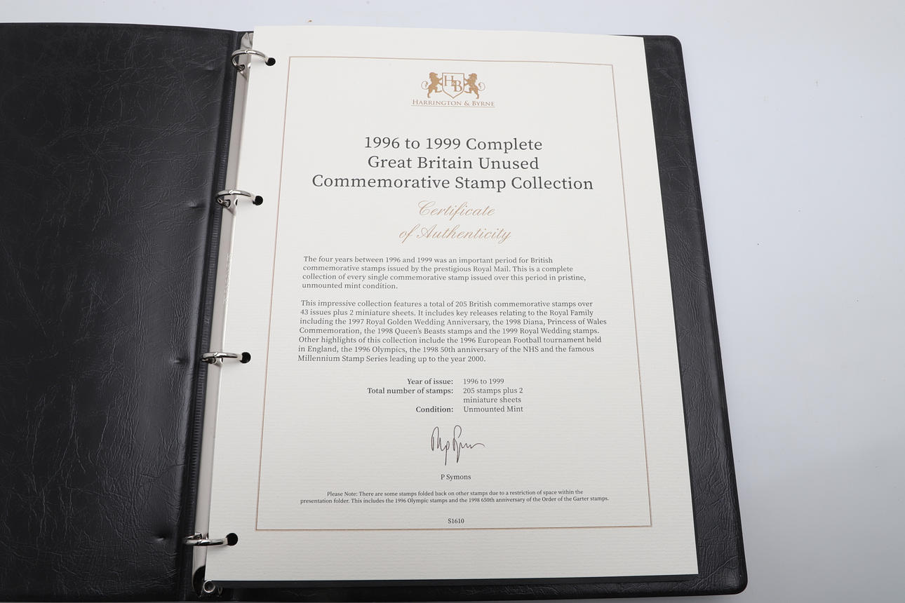 Four stamp booklets including 1996-1999 Complete GB Unused Commemorative Stamp Collection, 1992-1995 GB Unused Commemorative Collection, 1993-2011 Machin Definitive Stamp Collection, and 2008-2010 Complete GB Unused Stamp Collection. Booklets 29cms by 23cms.